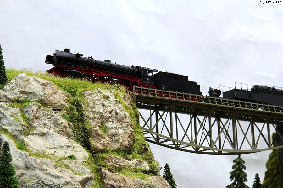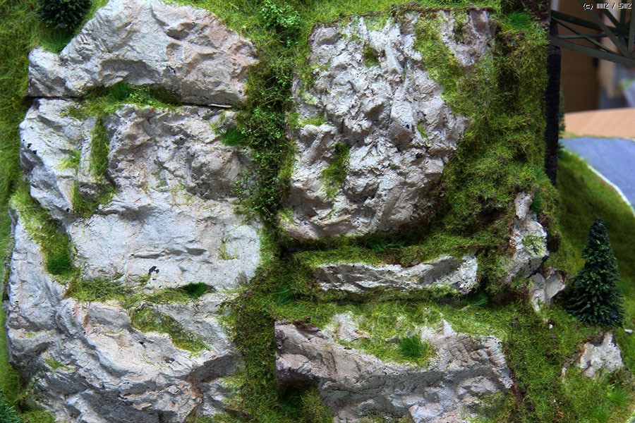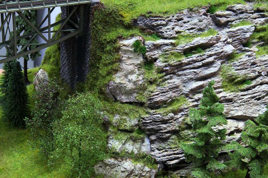 주문 제작 중 인 암벽 과 철교 로 이루어진 디오라마 입니다. 크기 는 가로 90 x 세로 45cm 입니다. Noch Terra-Form 시스템 을 이용 산 프레임 을 구성 하고 바위 몰드 제품 을 붙이고 풀 과 나무 표현 을 해주었습니다.