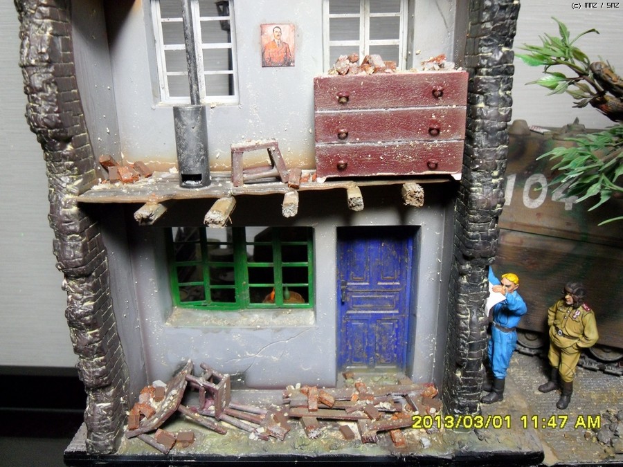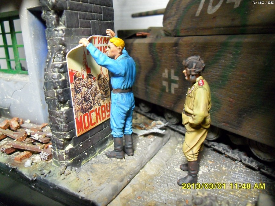 미국 쥐로 대표되는 미키마우스(미군으로 대표되는 연합군)가 마우스(독일세력으로 대표되는 독일초종전차)가 대결한다는 내용입니다. 아이의 그림에서 연합군이 승리했다는 것을 알 수 있고요. 이를 누나와 할아버지 두 명이 보고 있다는 내용입니다. 그 뒷편에서는 소련 군이 독일 포스터를 떼어내고 소련의 포스터를 붙이고 있고요.
