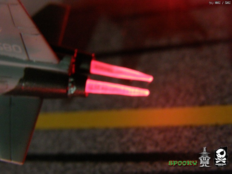 애프터버너 불꽃을 재현해보려고 투명런너를 깎아 노즐에 꽂아주고 LED와 연결했습니다.