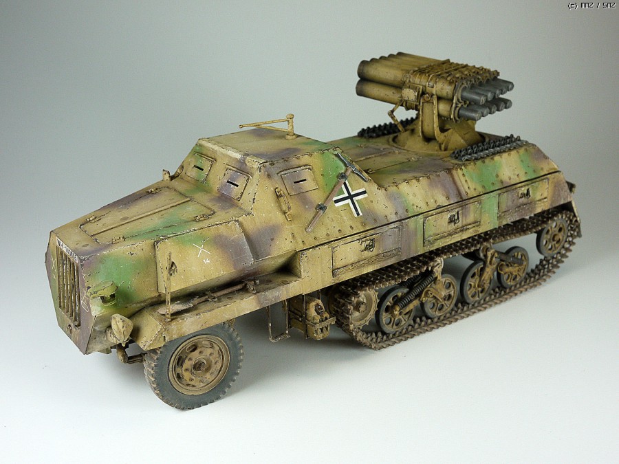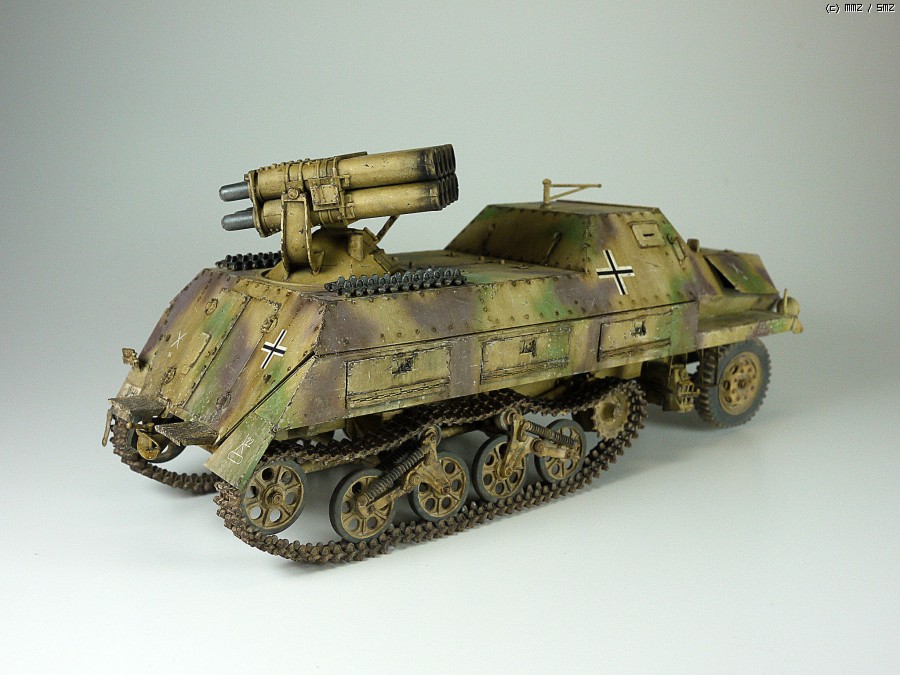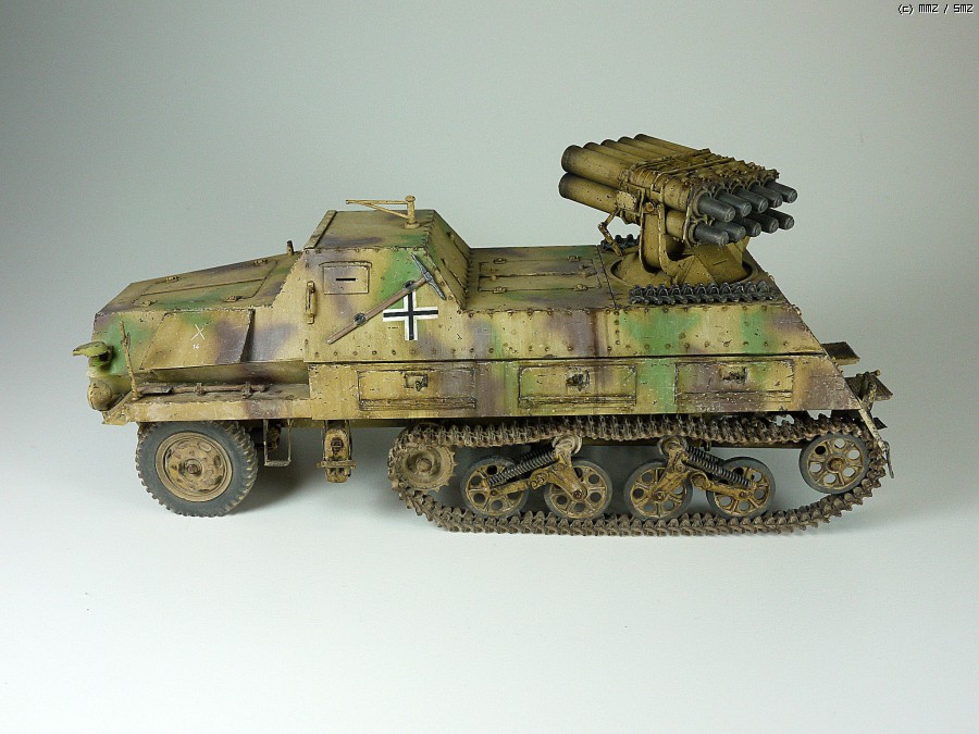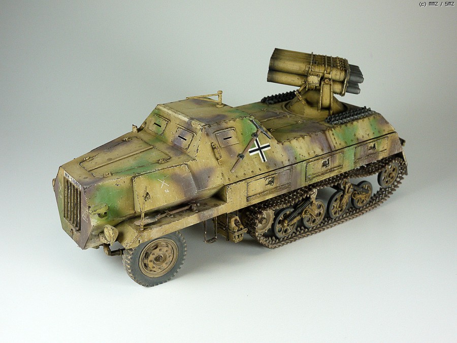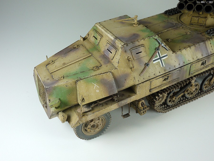 오랜만에 작업해보는 AFV네요. 이번 작품은 sd.kfz4 마울티어 반궤도장갑차에 다연장 로켓 발사기를 장착한 판저베르퍼 입니다. 기존의 다연장 로켓발사기인 네벨베르퍼는 파괴력은 좋으나 견인포인지라 기동력은 열악하면서, 발사후 연기는 너~무 자욱한 까닭에 발사하면 바로 위치가 발각되어 대포병 사격의 좋은 먹잇감이 되었다고 합니다. 이에 발사 후 바로 위치를 이동할 수 있도록 개발된 차량입니다.