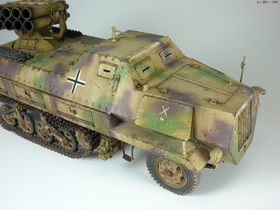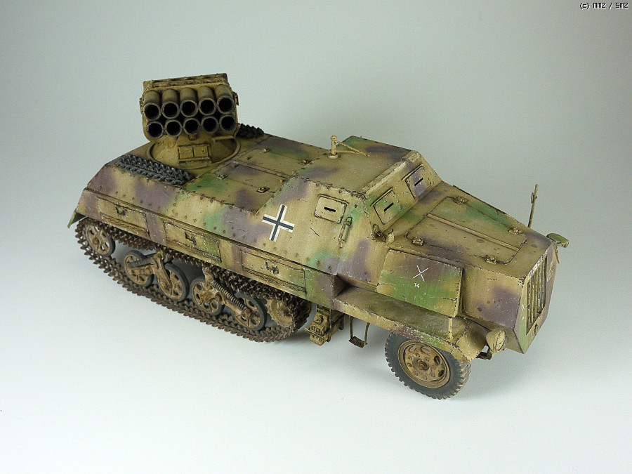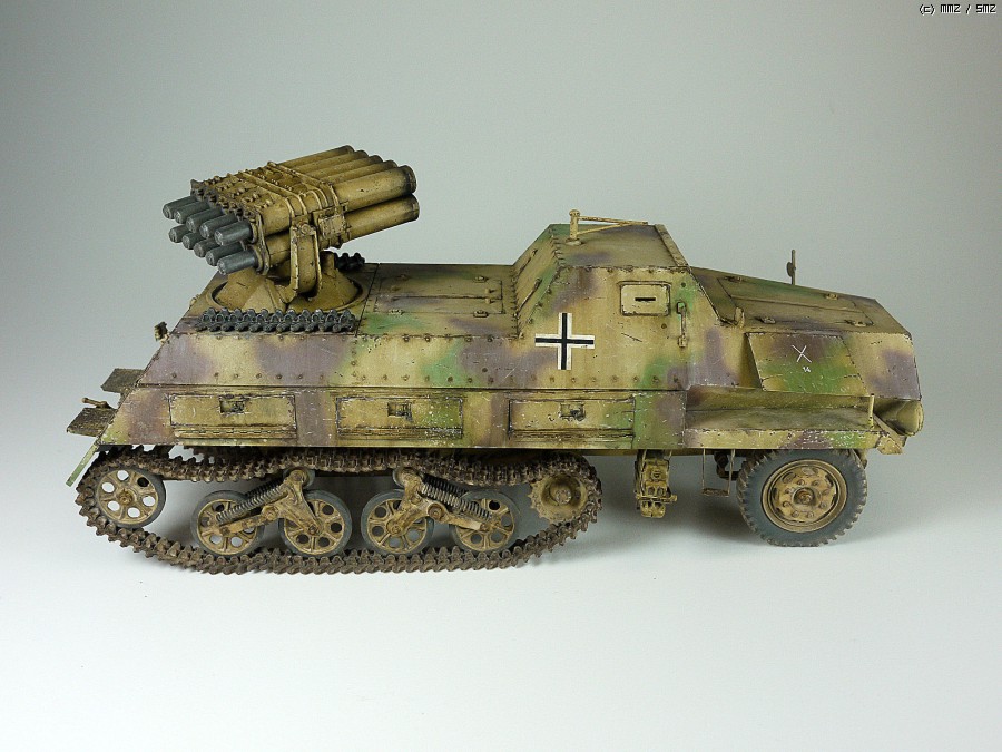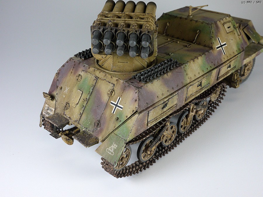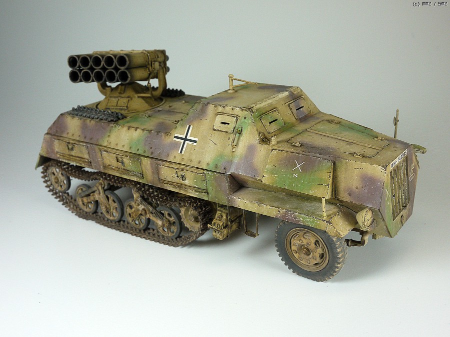 오랜만에 작업해보는 AFV네요. 이번 작품은 sd.kfz4 마울티어 반궤도장갑차에 다연장 로켓 발사기를 장착한 판저베르퍼 입니다. 기존의 다연장 로켓발사기인 네벨베르퍼는 파괴력은 좋으나 견인포인지라 기동력은 열악하면서, 발사후 연기는 너~무 자욱한 까닭에 발사하면 바로 위치가 발각되어 대포병 사격의 좋은 먹잇감이 되었다고 합니다. 이에 발사 후 바로 위치를 이동할 수 있도록 개발된 차량입니다.