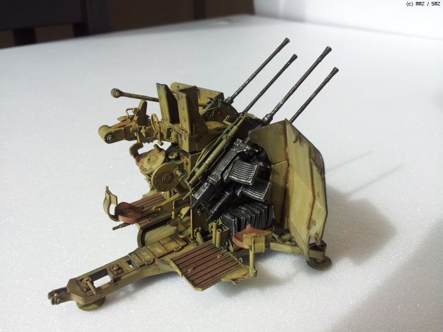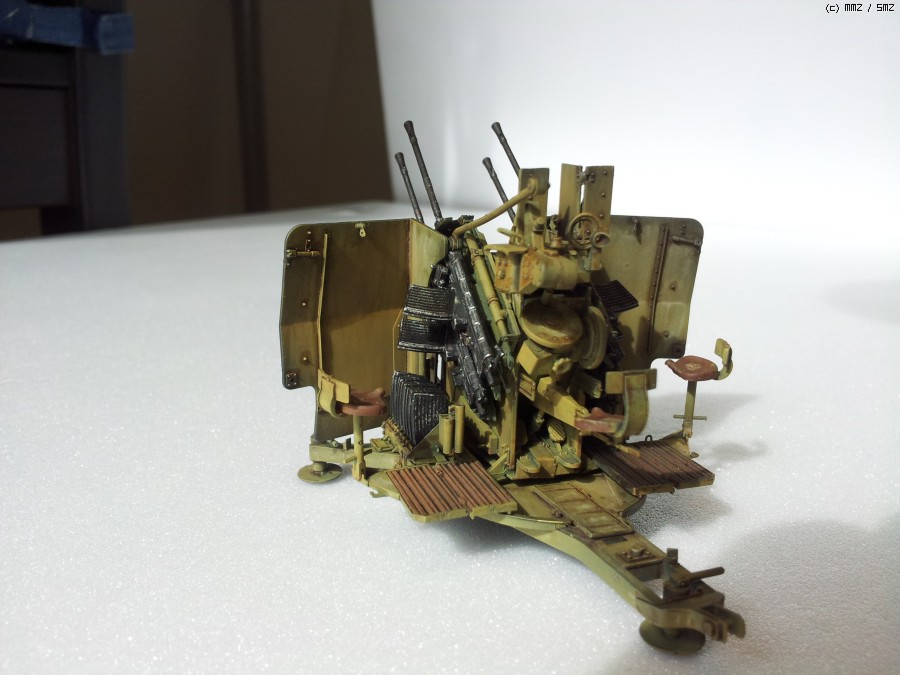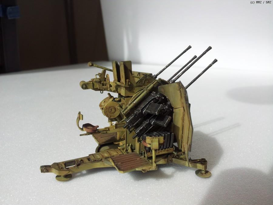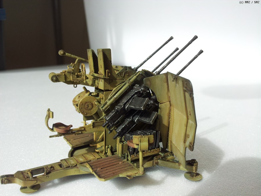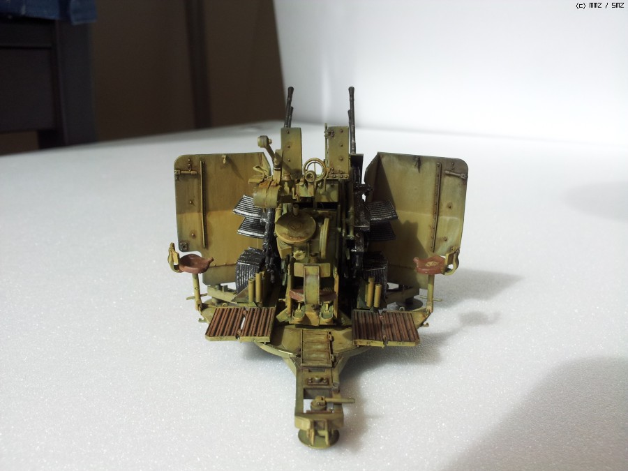 도색: 군제락카 Dark Yellow를 기본색으로 사용하였습니다. 그 이전에 군제락카 저먼그레이로 밑색을 깔고, 그 위에다가 기본색을 약간 묽게해서 에어브러싱해주며 전체적인 명암효과를 내주었습니다. 총신 부위는 군제 Steel을 사용하였고, 타미야 아크릴 무광 알루미늄으로 드라이브러싱을 하여 윤곽을 돋보이게 했습니다. 대공포 사수 발판 및 좌석 안장에는 군제 락카 Sandy Brown을 사용하였습니다.