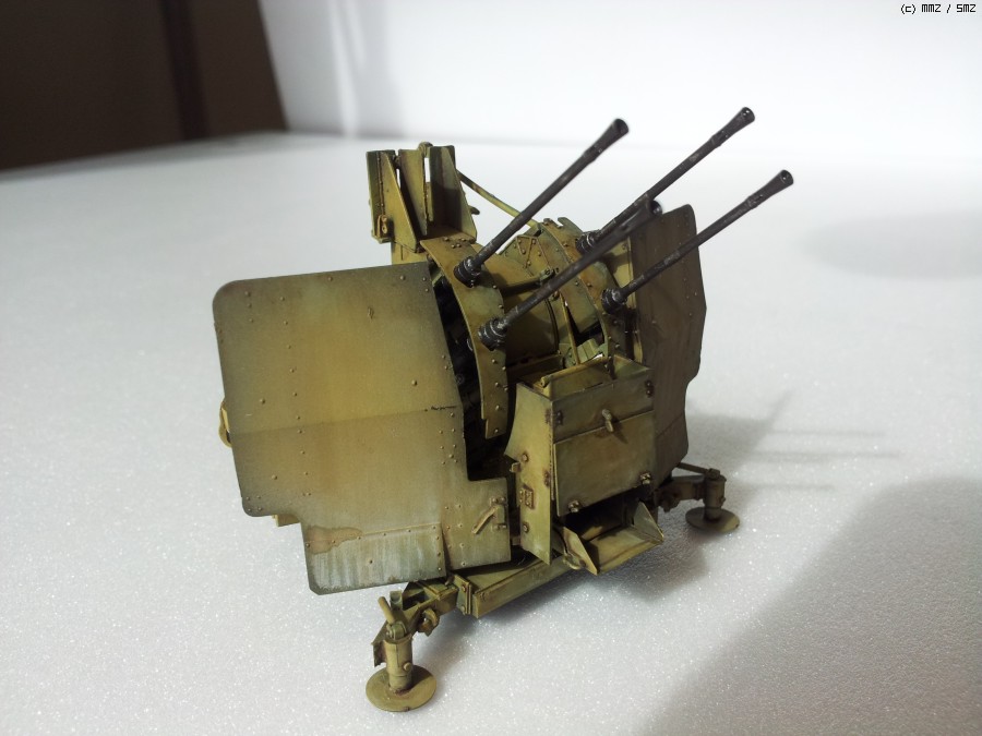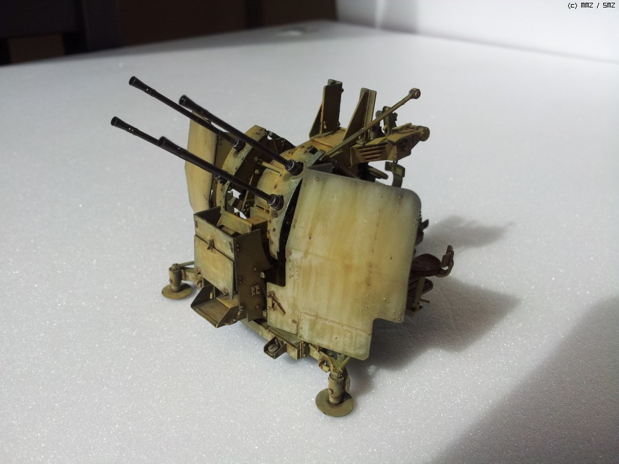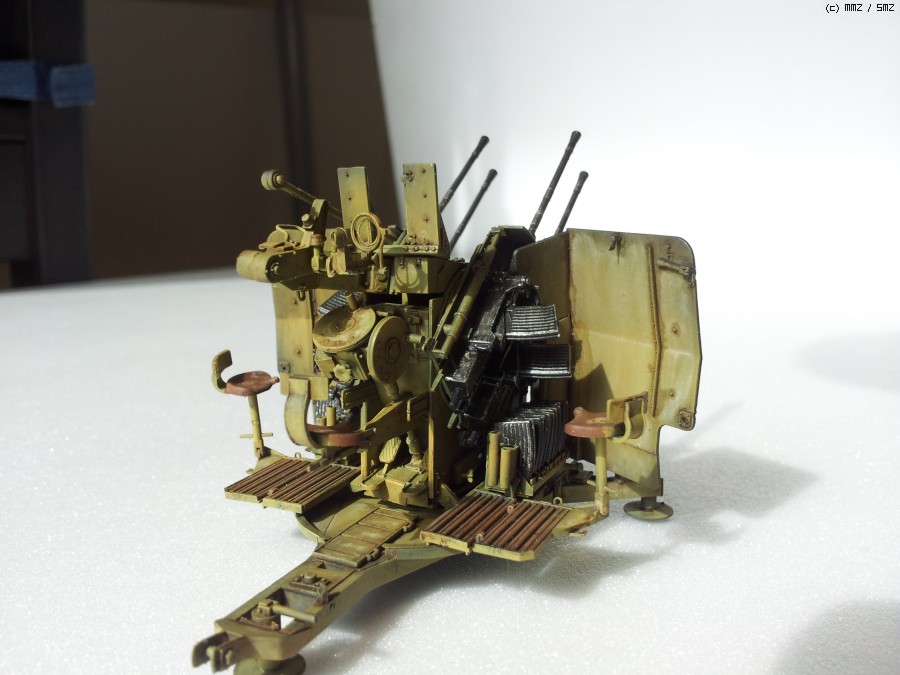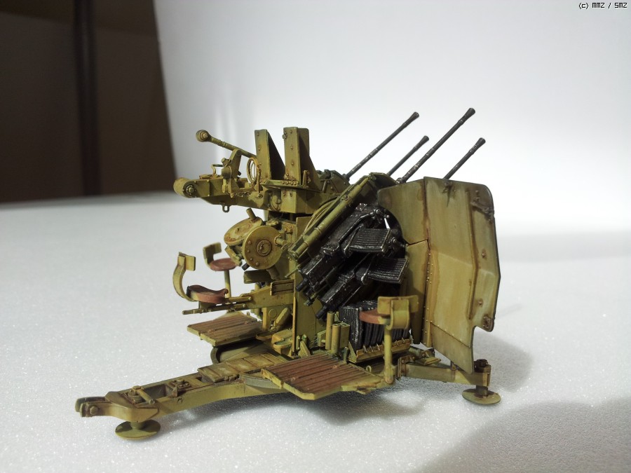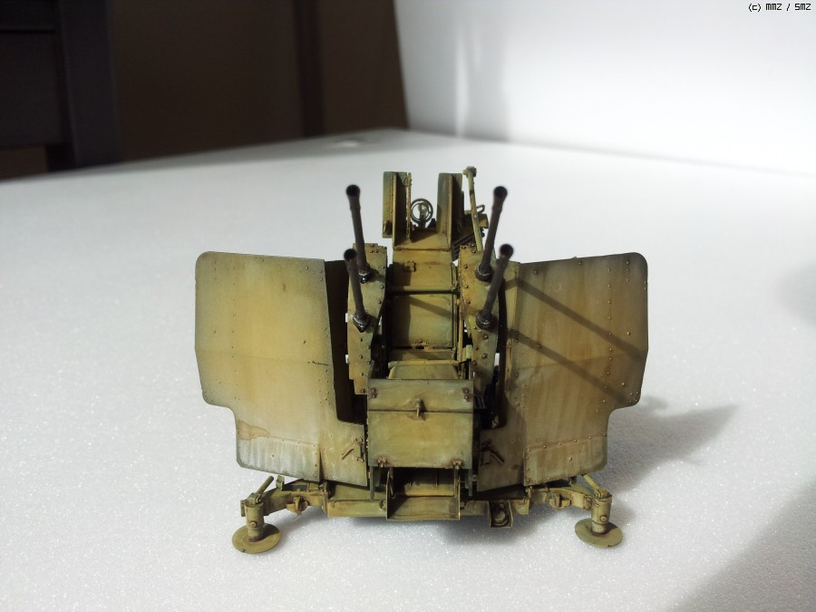 도색: 군제락카 Dark Yellow를 기본색으로 사용하였습니다. 그 이전에 군제락카 저먼그레이로 밑색을 깔고, 그 위에다가 기본색을 약간 묽게해서 에어브러싱해주며 전체적인 명암효과를 내주었습니다. 총신 부위는 군제 Steel을 사용하였고, 타미야 아크릴 무광 알루미늄으로 드라이브러싱을 하여 윤곽을 돋보이게 했습니다. 대공포 사수 발판 및 좌석 안장에는 군제 락카 Sandy Brown을 사용하였습니다.