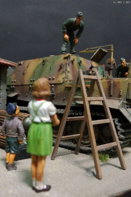 1944년 프랑스 어느 마을헛간에 전차를 은폐시키고 정비하고 있던 독일군앞에 그곳에 살던