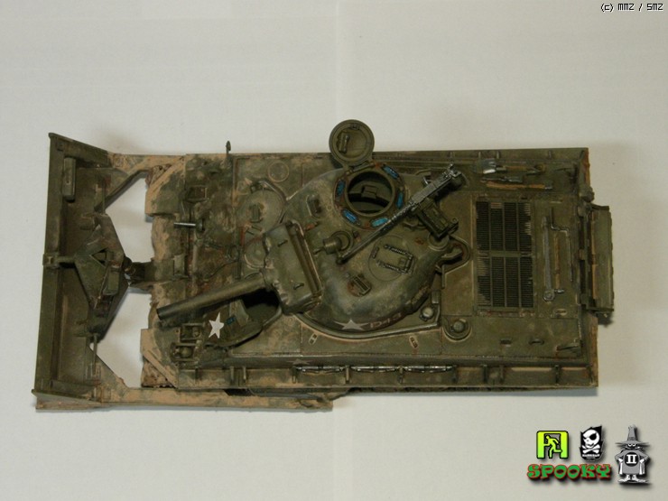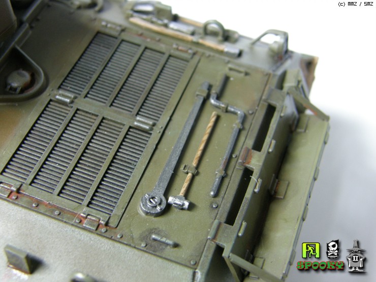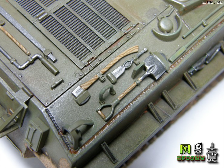 단색 도색이라 밋밋하지 않게 보이려고 피그먼트를 이용해 전체적으로 가벼운 녹표현을 해주었고 은색과 흑철색으로 드라이브러싱 해주었습니다.