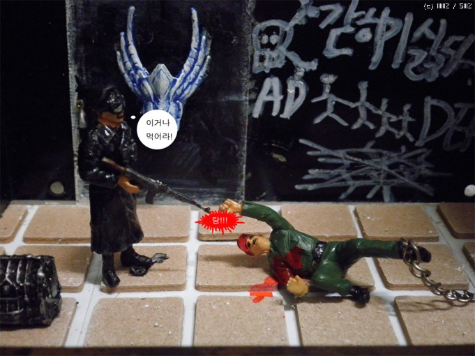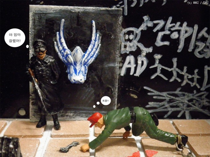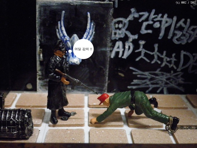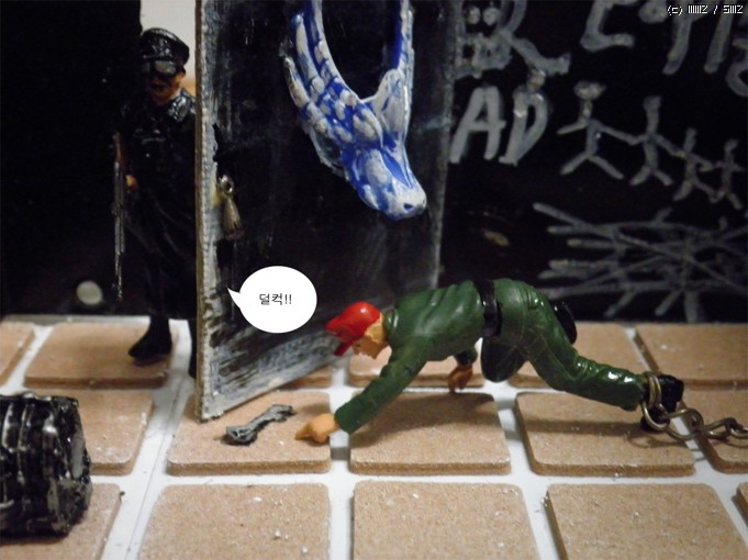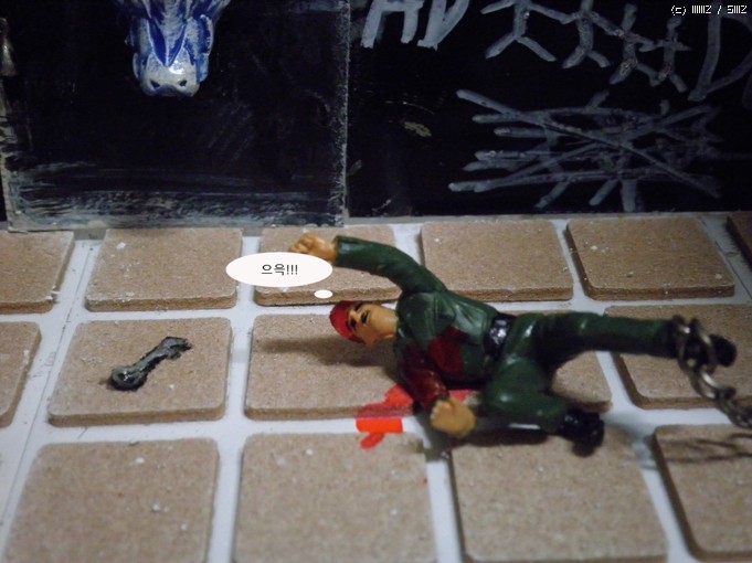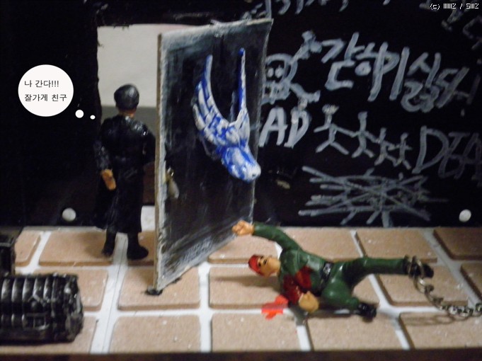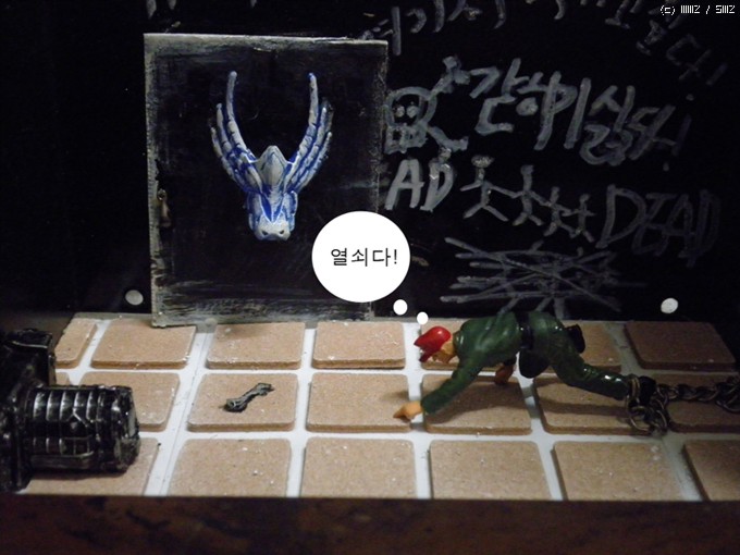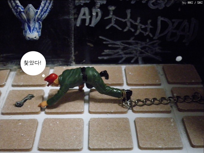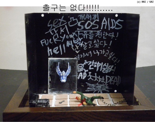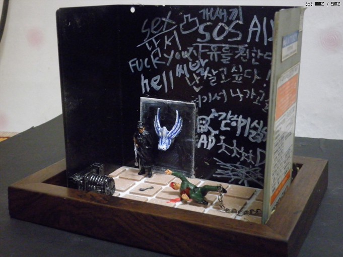재료는/컴퓨터파워케이스/문은 그라인더로 잘랐습니다/타이루 바닥은 의자다리 받침스폰지<마트구입>/열쇠는 캔을가위로잘라자작/인형은 아카데미명장군셋 룸벨과 아카데미 헤쳐의 인형을사용/벽의글자는 타일줄눈마카로 썼습니다<마트구입>