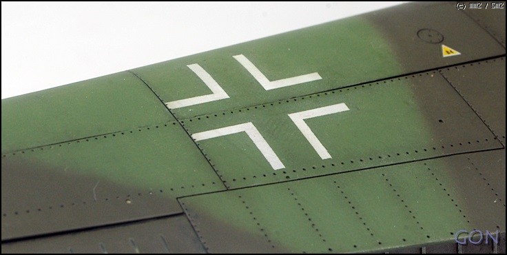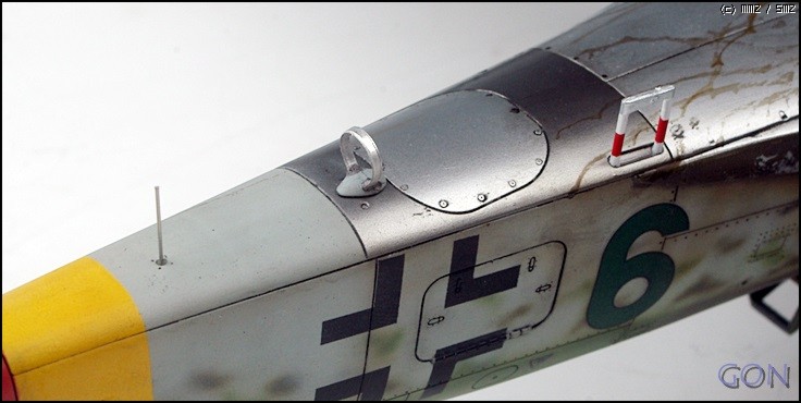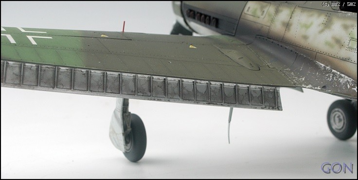 상면의 위장경계는 프리핸드입니다. 사실 개인적으로 프리핸드 보다는 블루택을 이용한 지형작업을 선호합니다만, 이 기체의 경우 대전 최후기의 기체이기 때문에 실기 자체가 야전에서 지형없이 작업되었을 가능성이 높습니다.