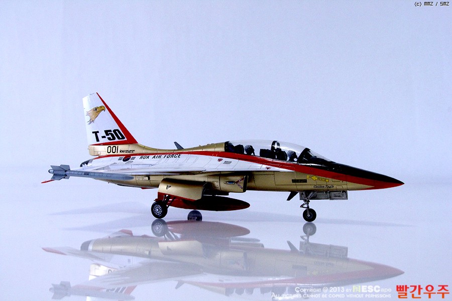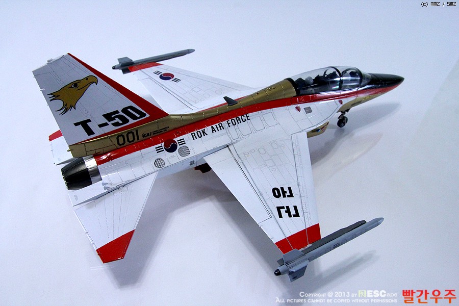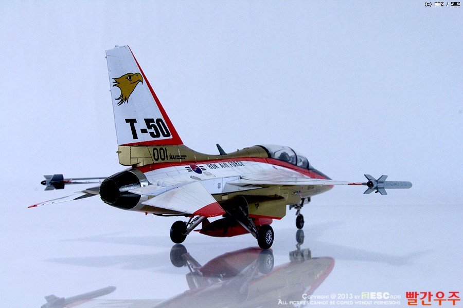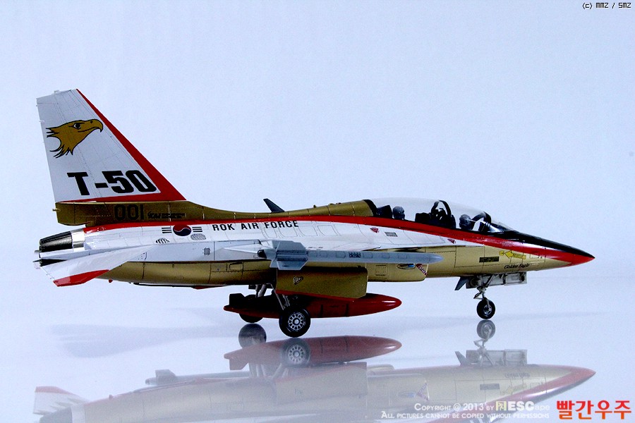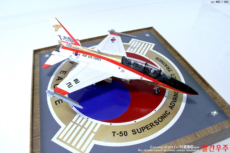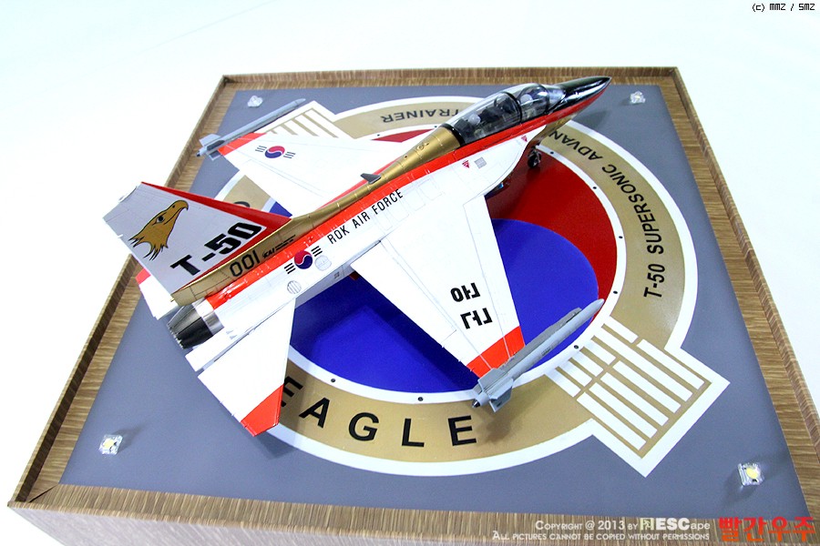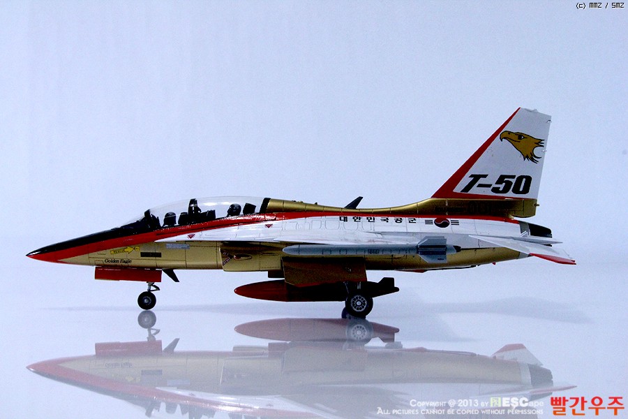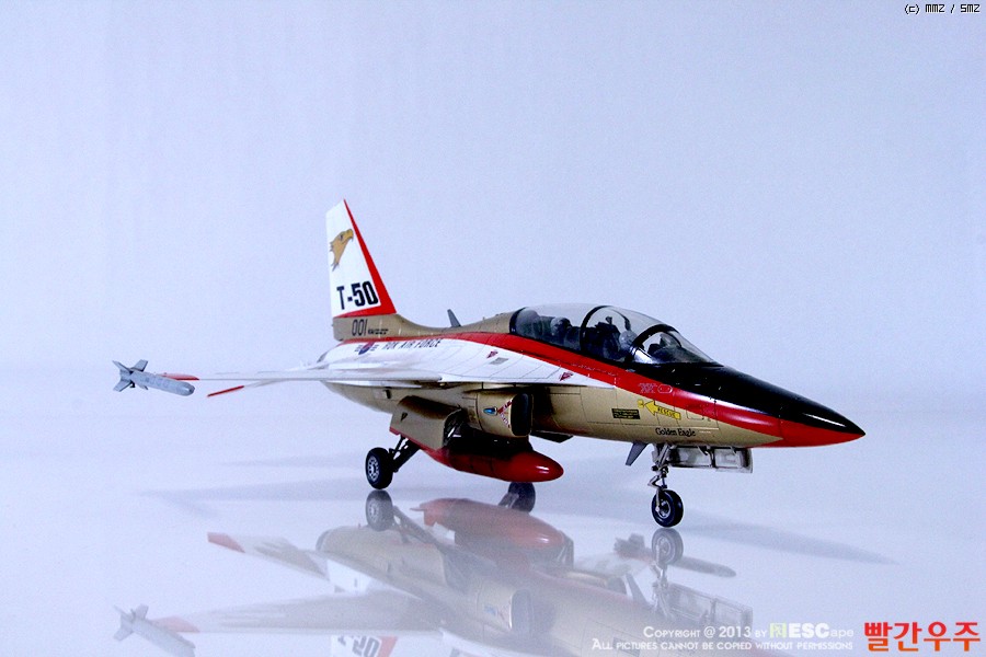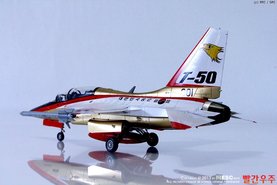 지난번 IPMS 전시회때 출품했었던 T-50 골든이글입니다. 많은 분들께서 이미 제작하신 킷이기도 합니다만, 좀 특이하게 초기형 금색버전으로 도색을 해보았습니다.