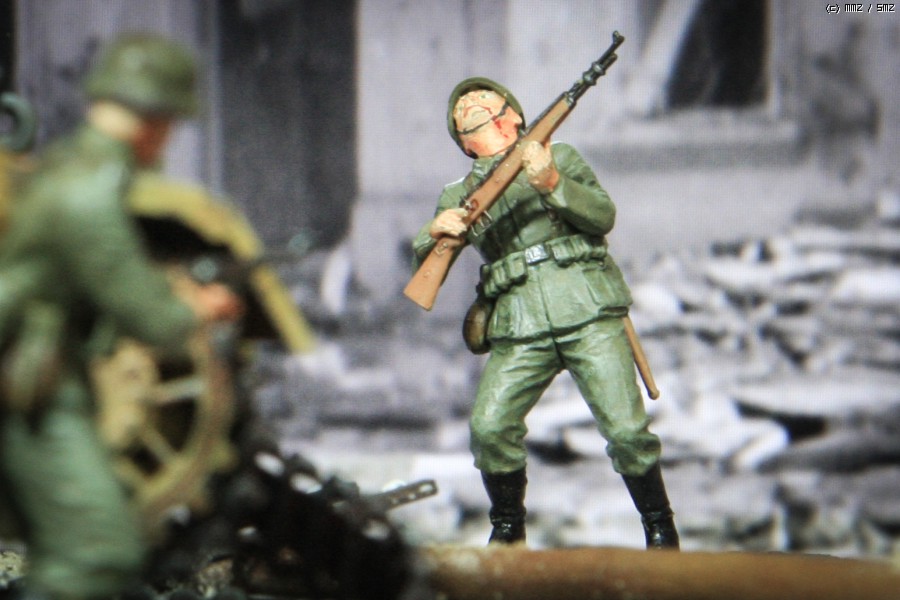 원래 이 병사는 화염방사기를 등에 매고 내려 놓지 않으려고 너무 고집을 피워서, 어쩔 수 없이 칼로 위협해서 화염방사기 연료통을 수술하듯이 떼어놓은 병사라고 하더군요. 이 녀석 등에 군장을 메어주는 바람에 모델러 부대에 군장 한 세트가 모자란다는 소문이...