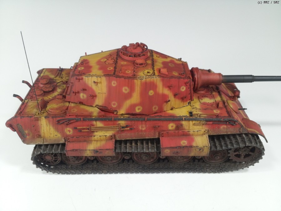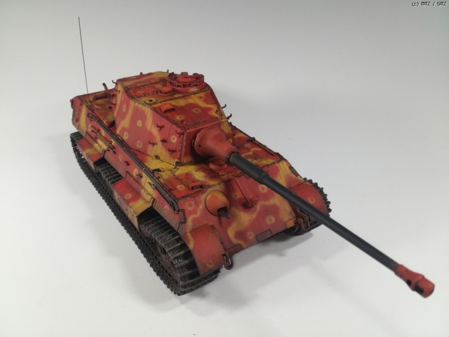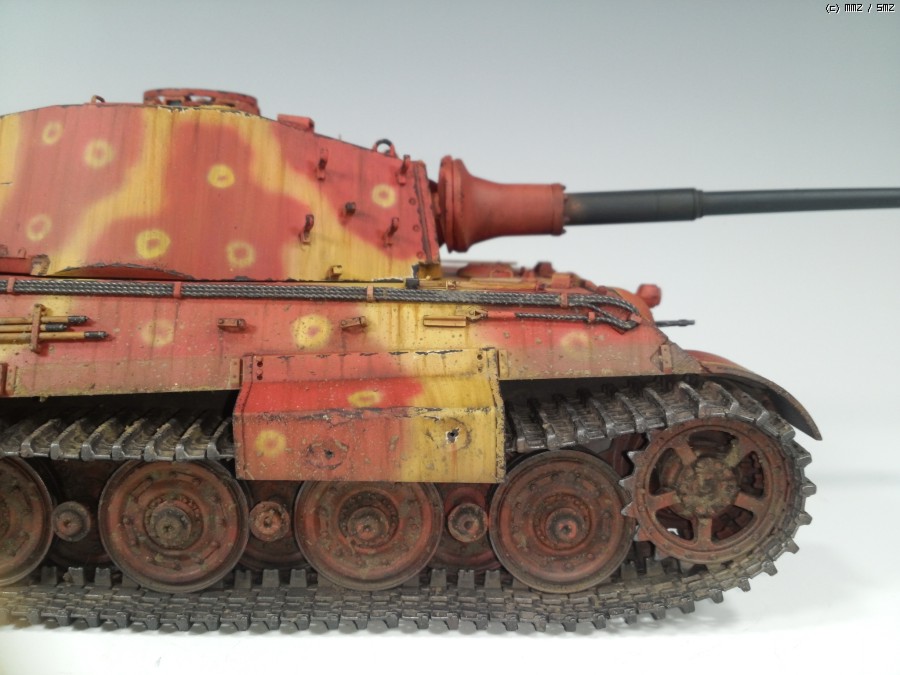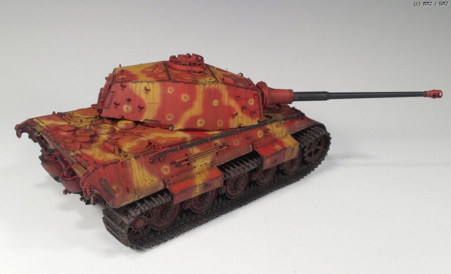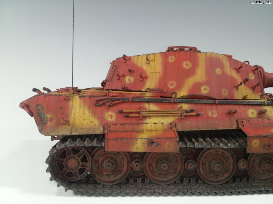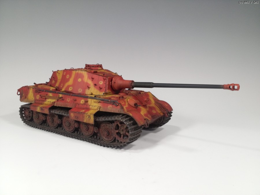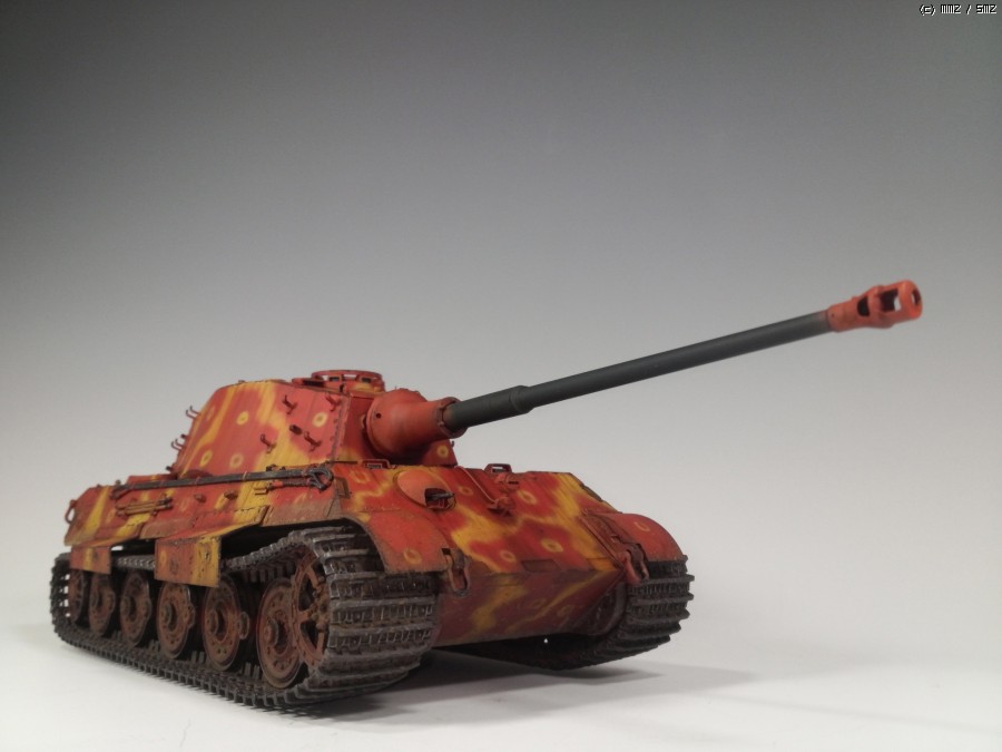 1945년 봄 대전 막바지쯤, 공장에서 적색 방청제위에 대충 다크옐로우로 위장하고 바로 전장으로 나가야만 하는 티거2를 통해 제3제국의 처량함을 표현하였습니다.