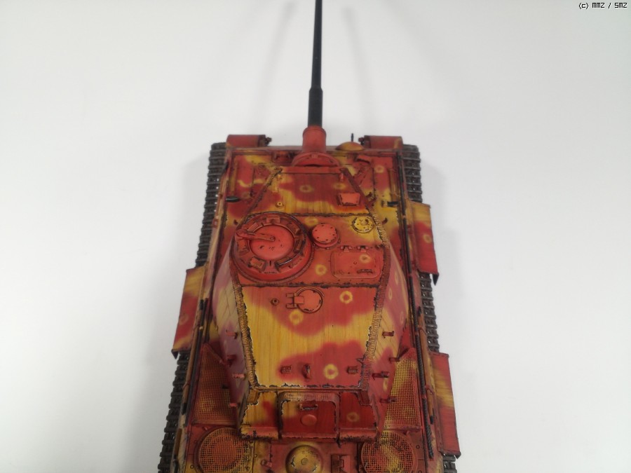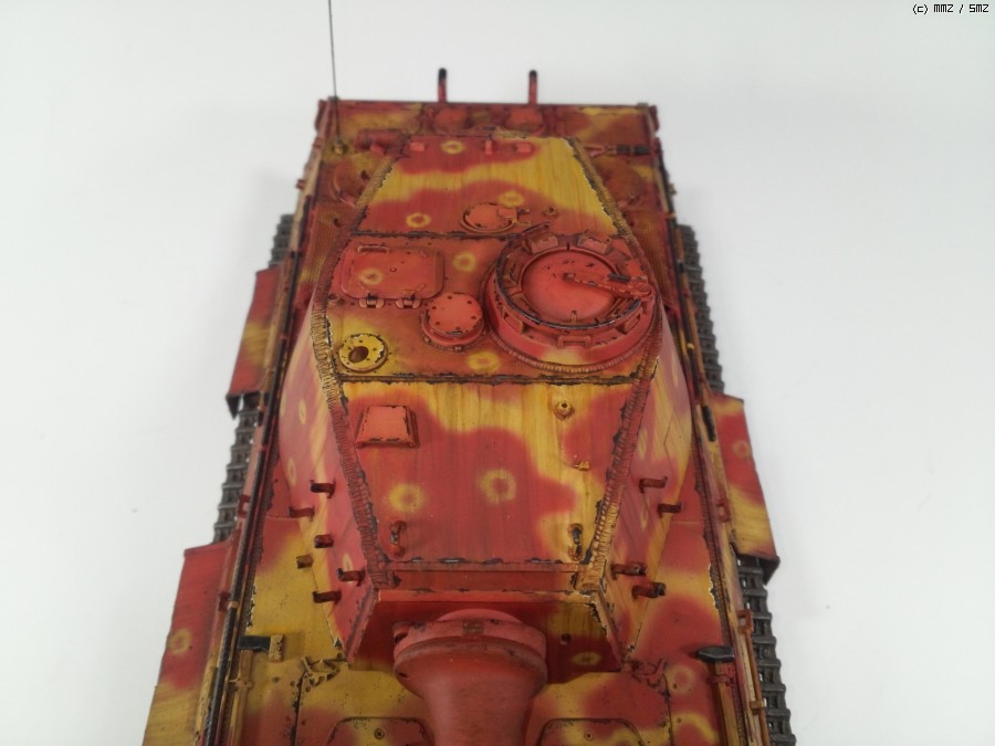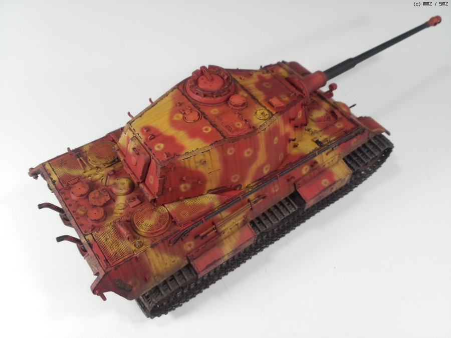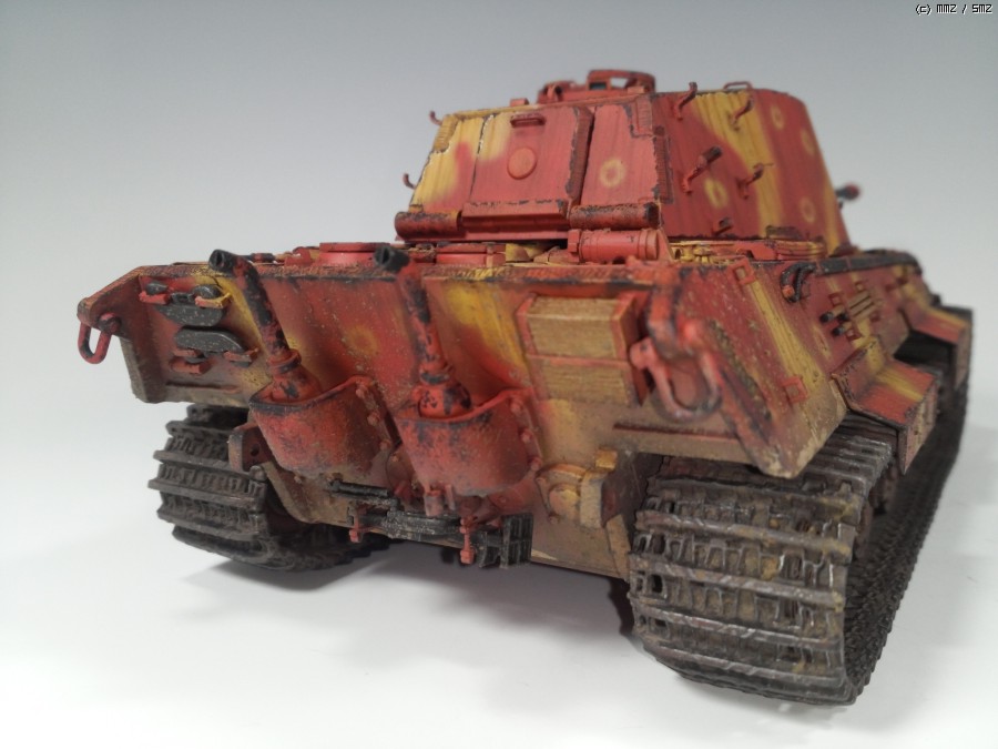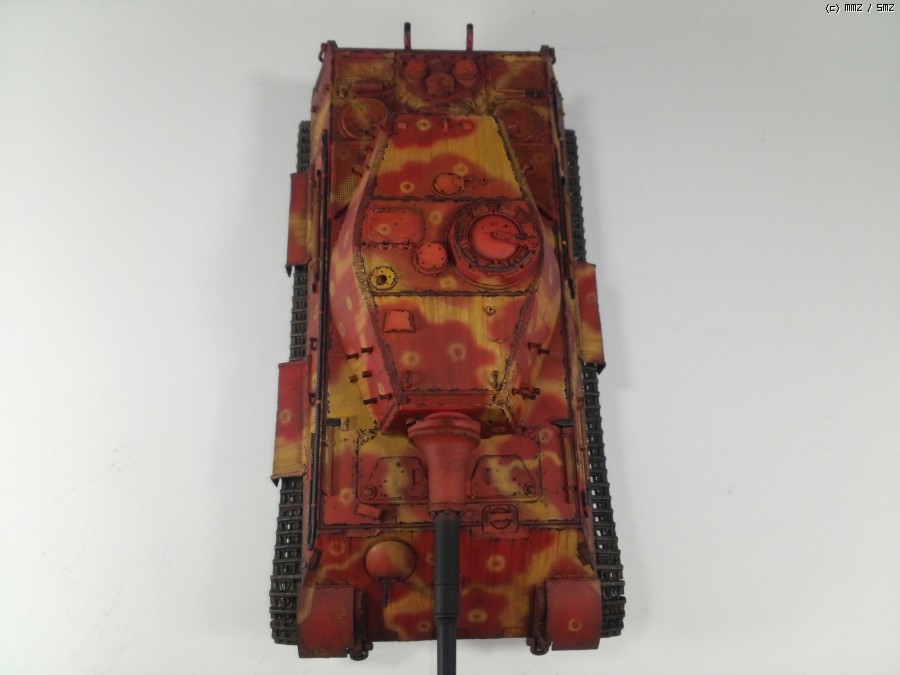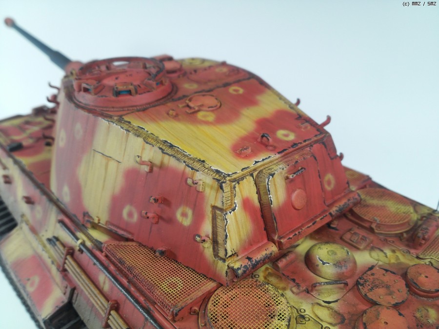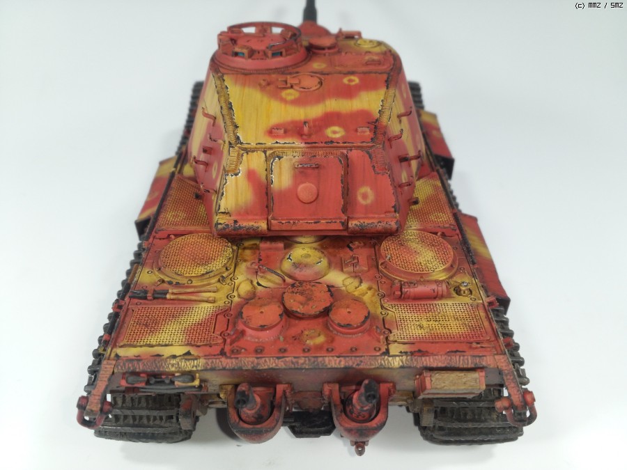 1945년 봄 대전 막바지쯤, 공장에서 적색 방청제위에 대충 다크옐로우로 위장하고 바로 전장으로 나가야만 하는 티거2를 통해 제3제국의 처량함을 표현하였습니다.