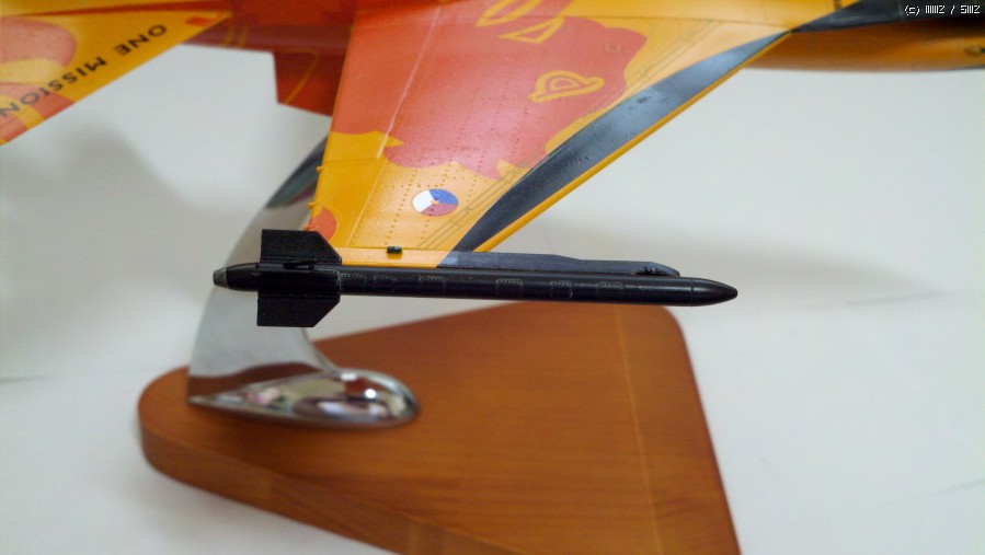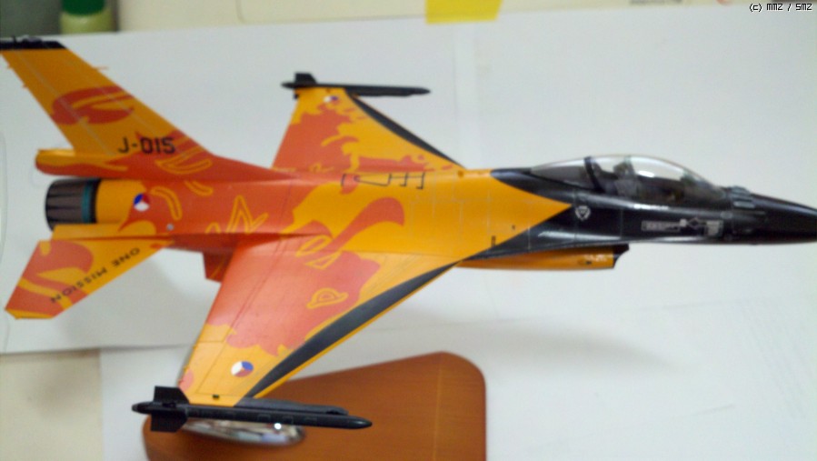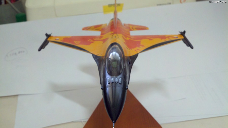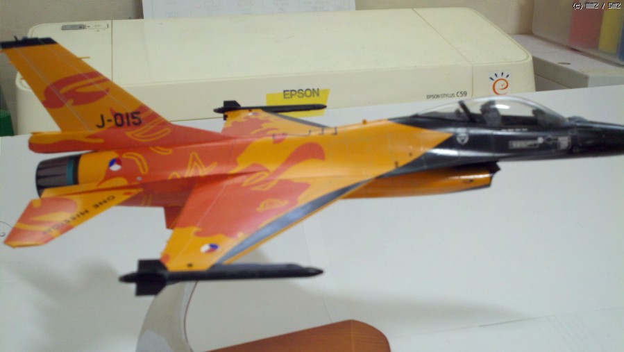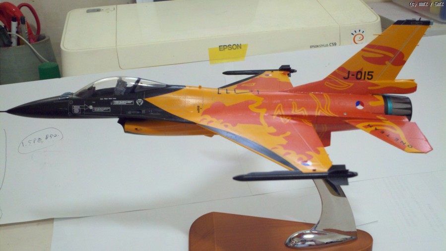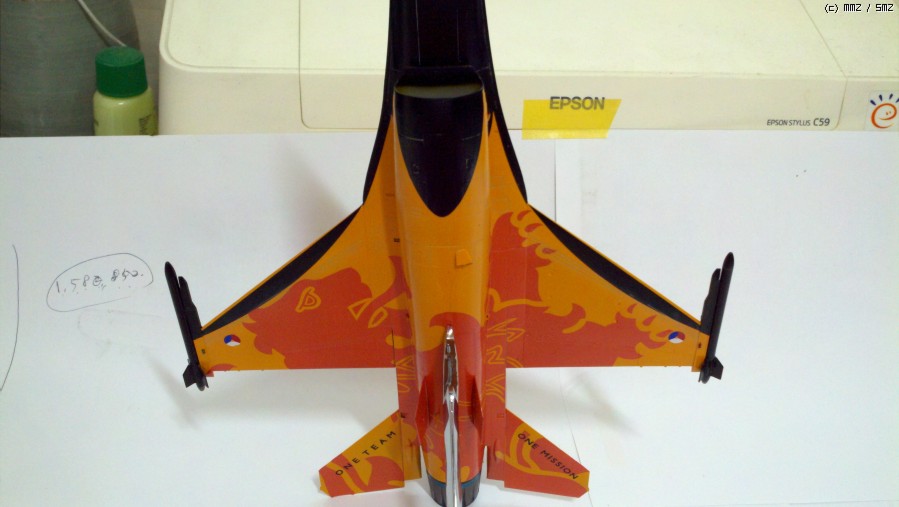 F-16팰콘을 하도 많이 만들다 보니 여기서는 노즐을, 저기서는 좌석을 저쪽에선 수직미익 부품을...조금씩 만들어 놓았던 것등을 한번에 짜집기 해서 기체를 완성한 것을 가지고 거 요상한 프랑스제 데칼을 붙여 만들었읍니다.