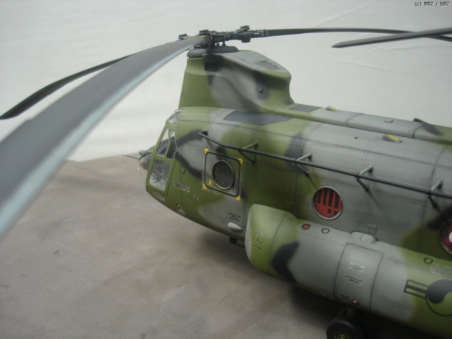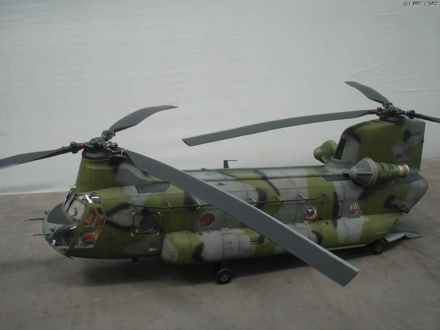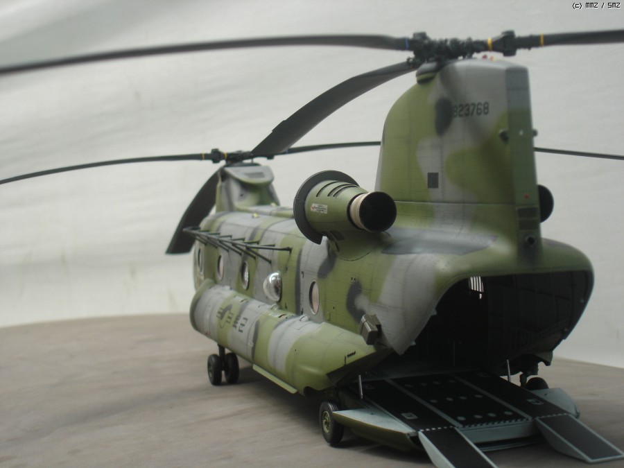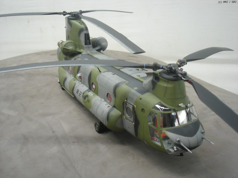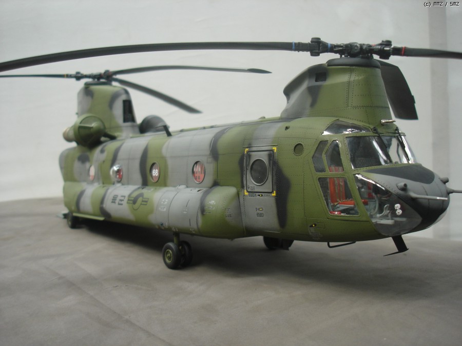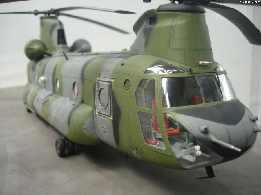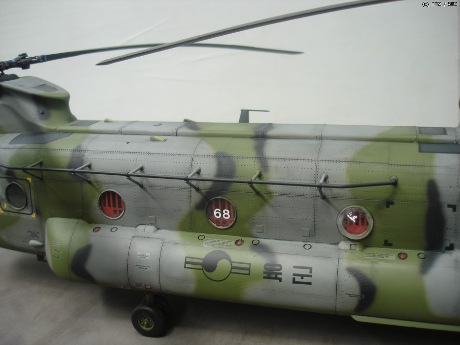 미군이 사용하던 중고 기체를 도입한걸로 가정하고 만들었습니다. 현재 도입된 기체는 미군색 이지만 대한항공 입고하면 위장무늬로 재도색 할거라 현용 대한민국 육군 위장무늬로 도색 했습니다. 상부 STEP ZONE은 데칼이 찢어져서 진한 회색으로 색칠 하였고, 육군마크,국적마크,후방 채프/플레어 디스펜스는 UH-60 만들고 남은것 사용 하였습니다.내부와 계기판 에칭은 에듀어드 에칭 사용했으며 중앙 캐노피에 흰색 숫자는 화방에서 레터링 구입해서 붙였습니다.메인로터 블레이드는 전방쪽에 공기마찰 때문에 페인트가 벗겨진걸 표현 해 주었습니다.