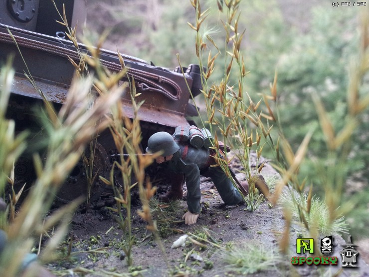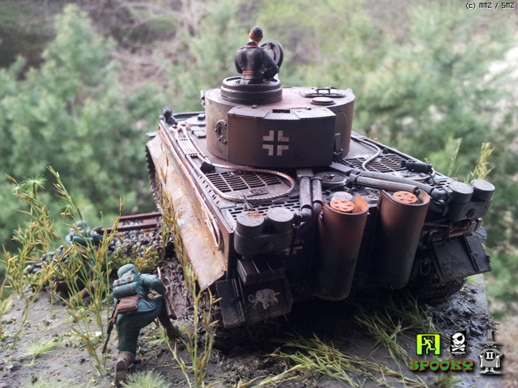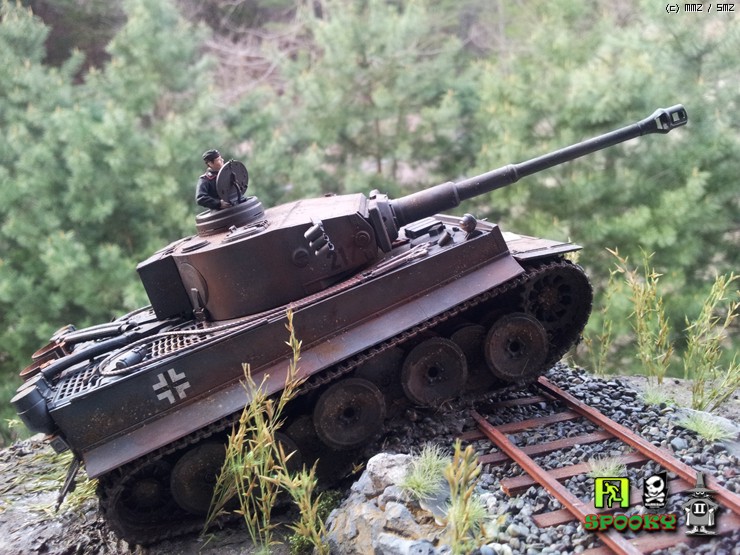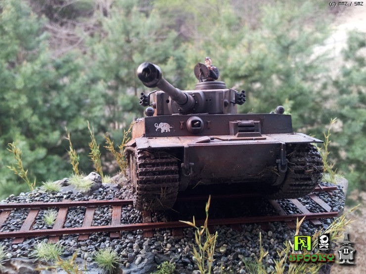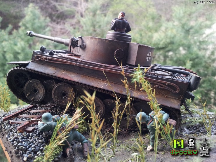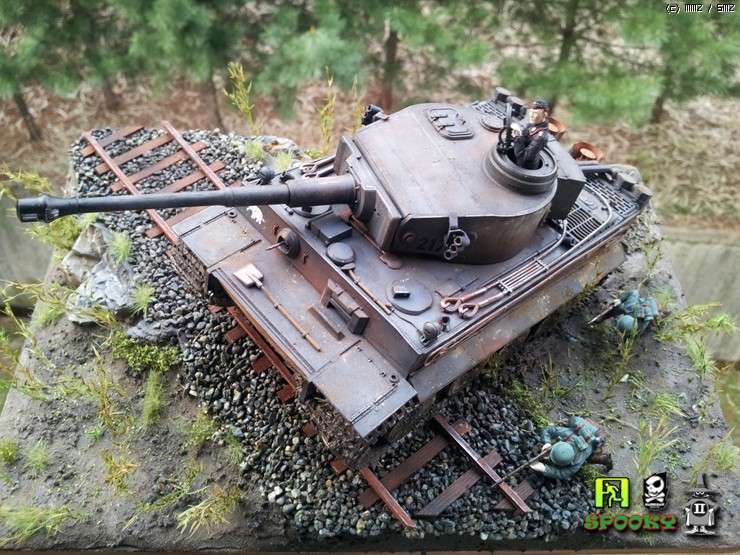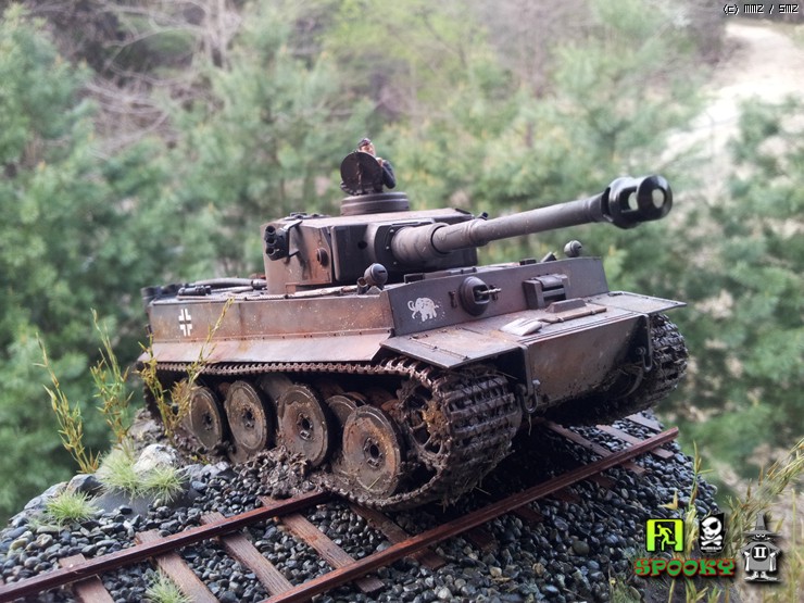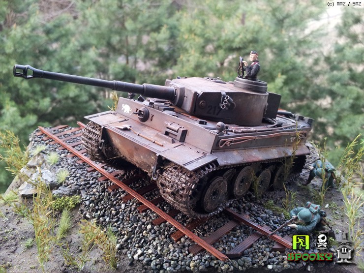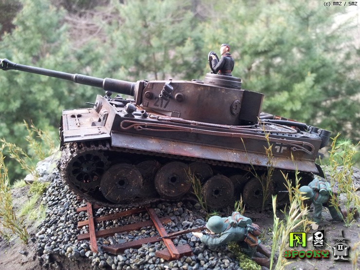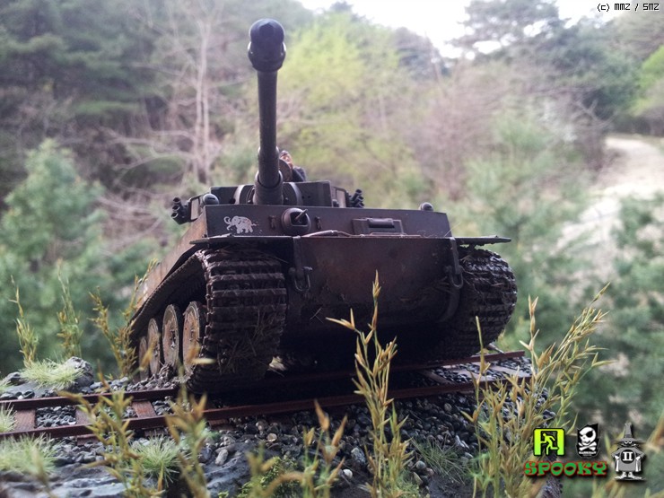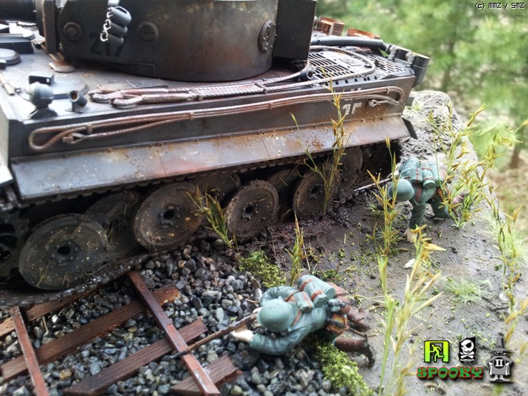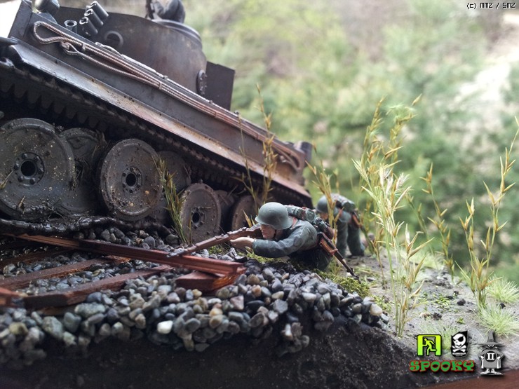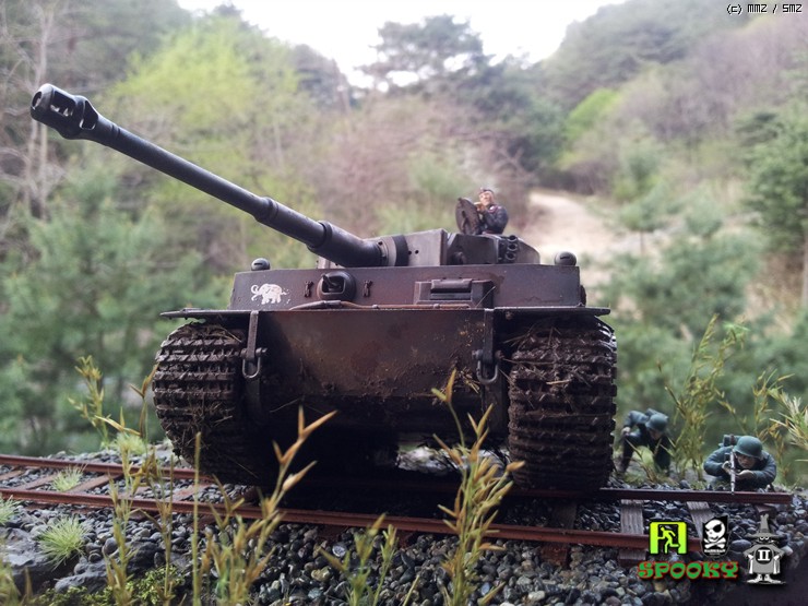 전차는 철길을 넘고 보병은 주변을 경계하고 있습니다.