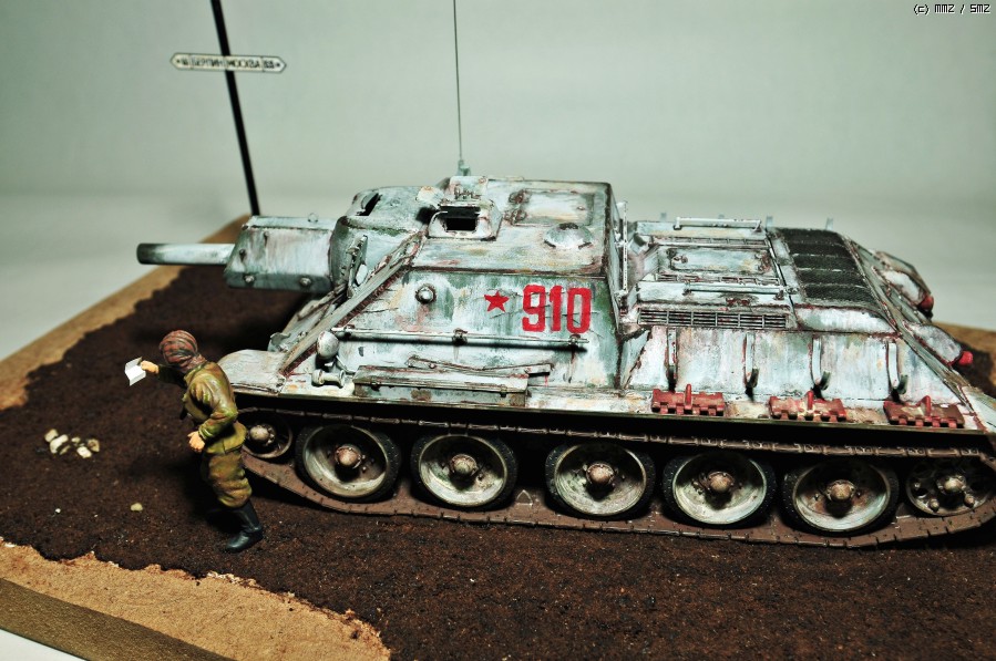 편지를 읽고 있는 전차병과 생사를 넘나드는 험난한 전투를 해쳐온 듯한 낡은 전차....