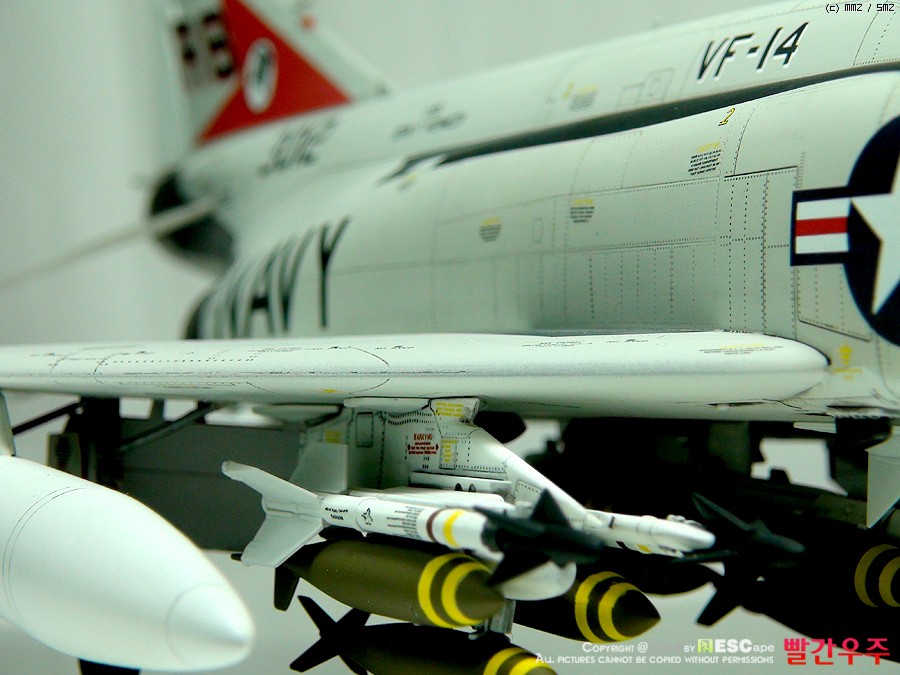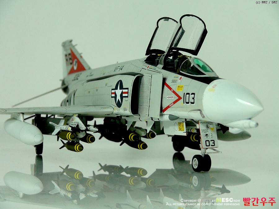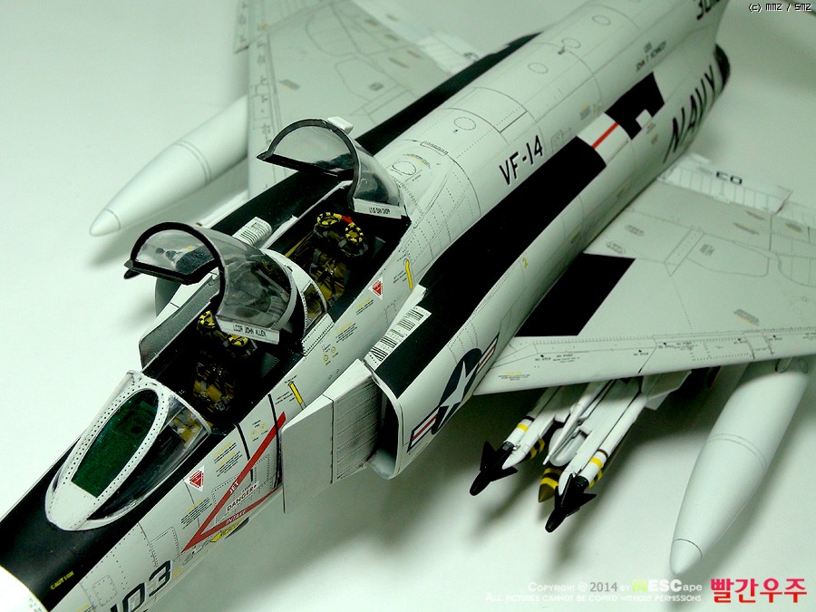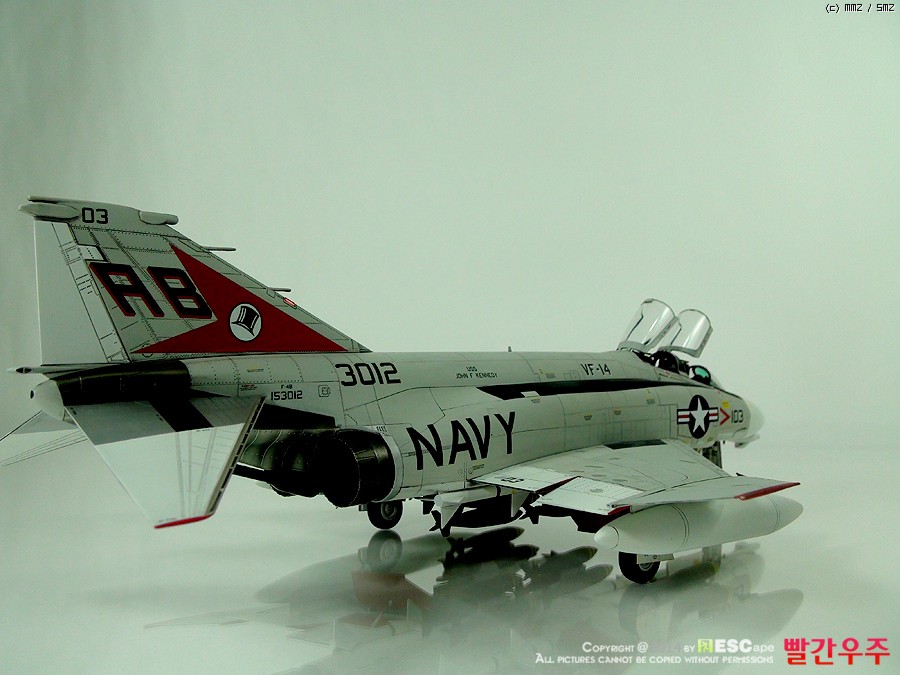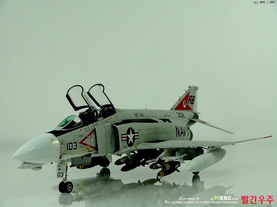 지난 하비페어때 출품했었던 F-4B 팬텀의 사진입니다. 저희 동호회에서 기획하였던 프로젝트에 참여하기 위해 만든 녀석 되겠습니다. 킷은 아카데미 팬텀 B형을 사용하였고, 데칼은 모노키오에서 출시되었던 팬텀 B형 데칼 중 VF-14 Top Hatters 부대의 데칼을 사용하였습니다. 이외에도 계기판에 컬러에칭을 적용하였는데.. 잘 보이지는 않습니다. ^^ 더불어 모 모형점에서 구입하면서 받은 사은품 사출좌석을 사용하여 제작하였습니다.