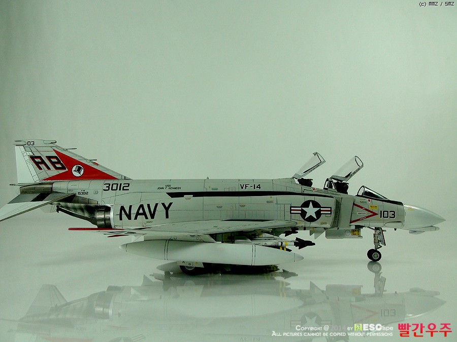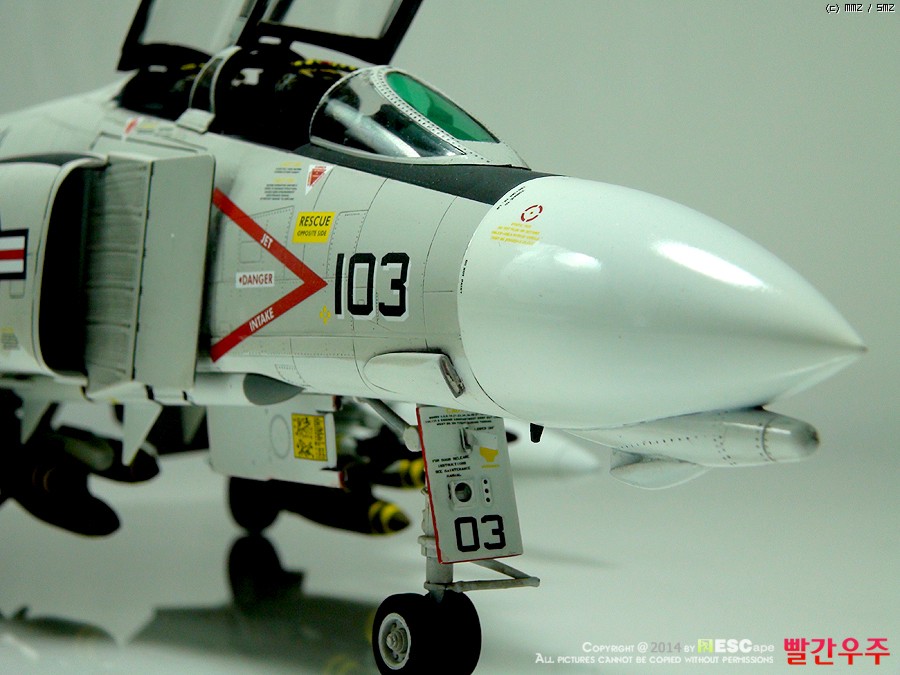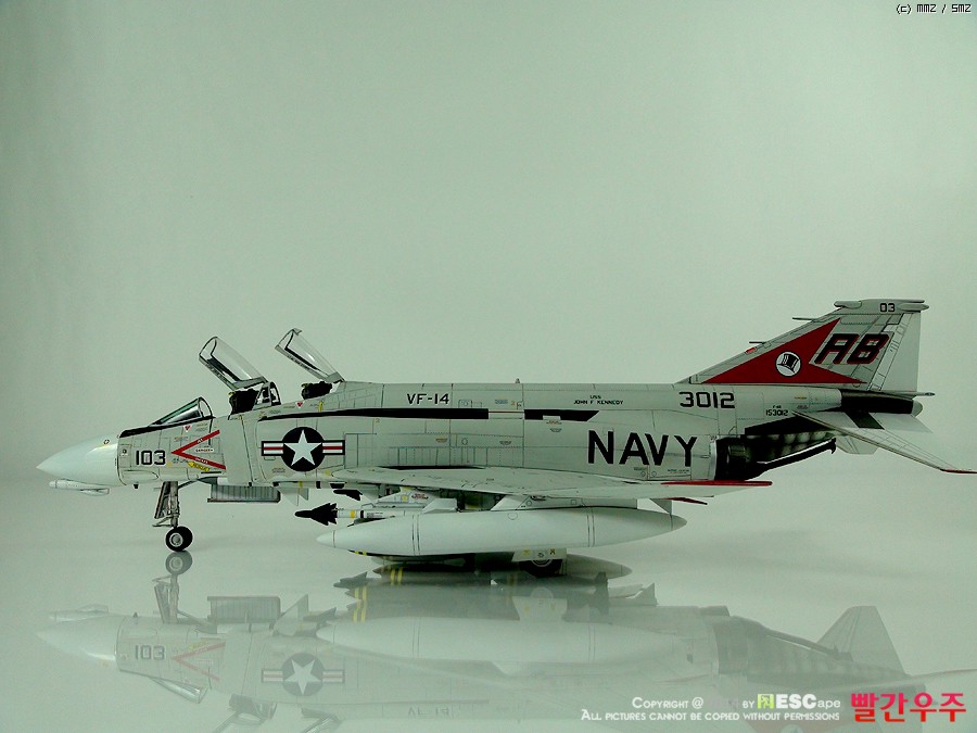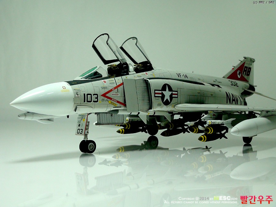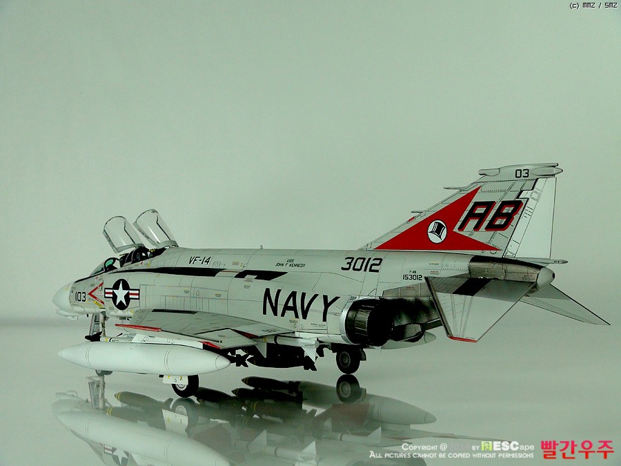 지난 하비페어때 출품했었던 F-4B 팬텀의 사진입니다. 저희 동호회에서 기획하였던 프로젝트에 참여하기 위해 만든 녀석 되겠습니다. 킷은 아카데미 팬텀 B형을 사용하였고, 데칼은 모노키오에서 출시되었던 팬텀 B형 데칼 중 VF-14 Top Hatters 부대의 데칼을 사용하였습니다. 이외에도 계기판에 컬러에칭을 적용하였는데.. 잘 보이지는 않습니다. ^^ 더불어 모 모형점에서 구입하면서 받은 사은품 사출좌석을 사용하여 제작하였습니다.