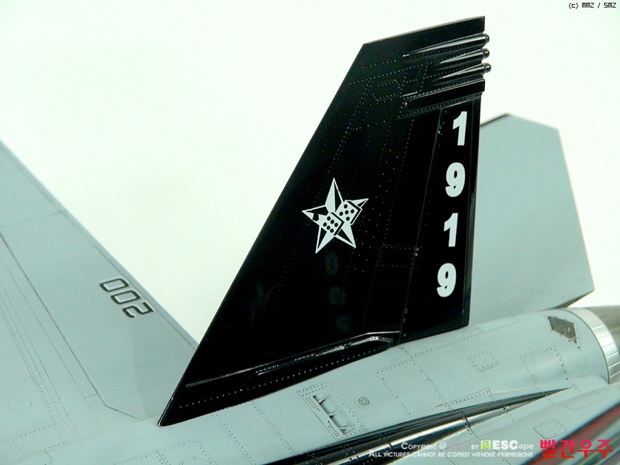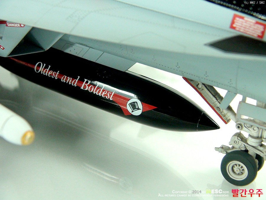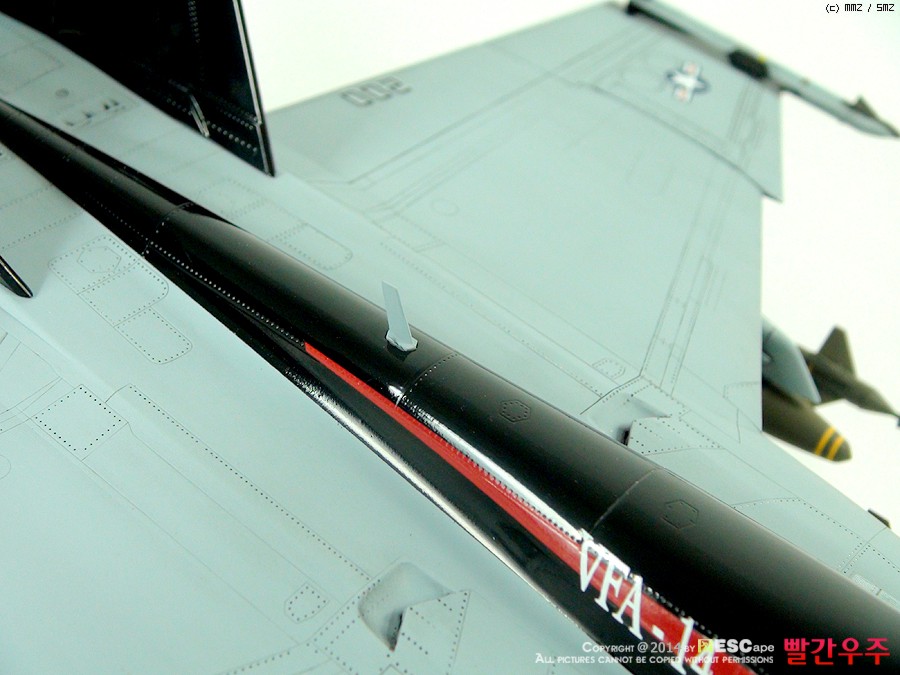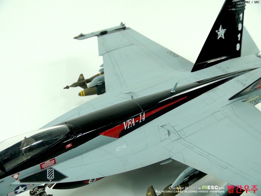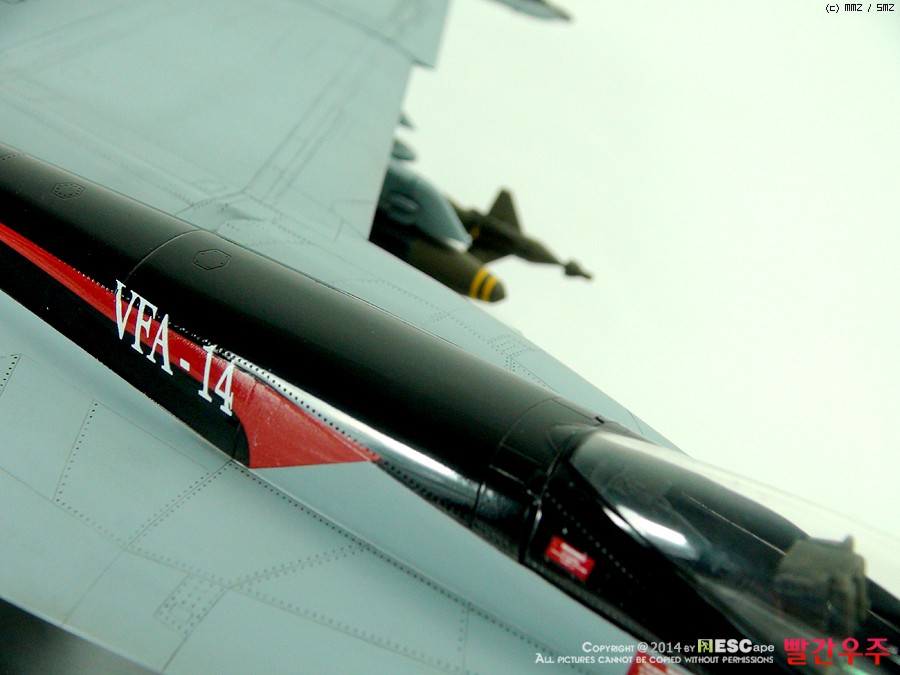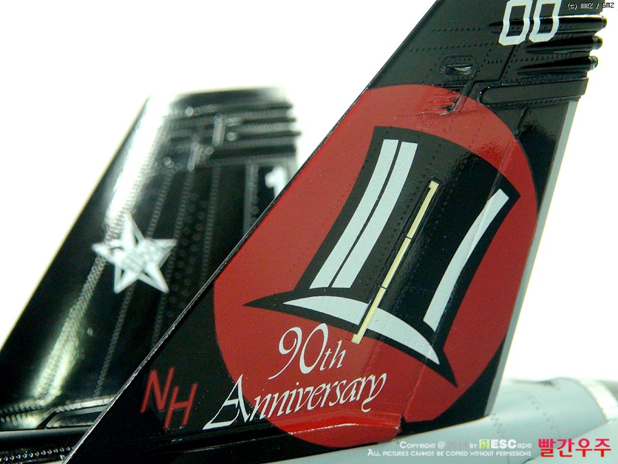 데칼이 조금은 어려운 부분이었습니다. 스페셜 도장(VFA-14의 부대창설 90주년 기체)인 바, 등판과 수직미익이 유광검정색으로 도장이 되어야 해서, 데칼링 후 유광클리어를 좀 과도하게 올려주었더니... 쩝쩝... ^^ 데칼이 안 좋다기 보다는 제가 너무 급하게 완성을 보려고 해서 일어난 일이죠. ^^ 근데 수직미익 데칼이 좀 넓은데다가 요철도 있는 부분이다보니 붙이는데 상당히 시간과 공이 많이 들었습니다.