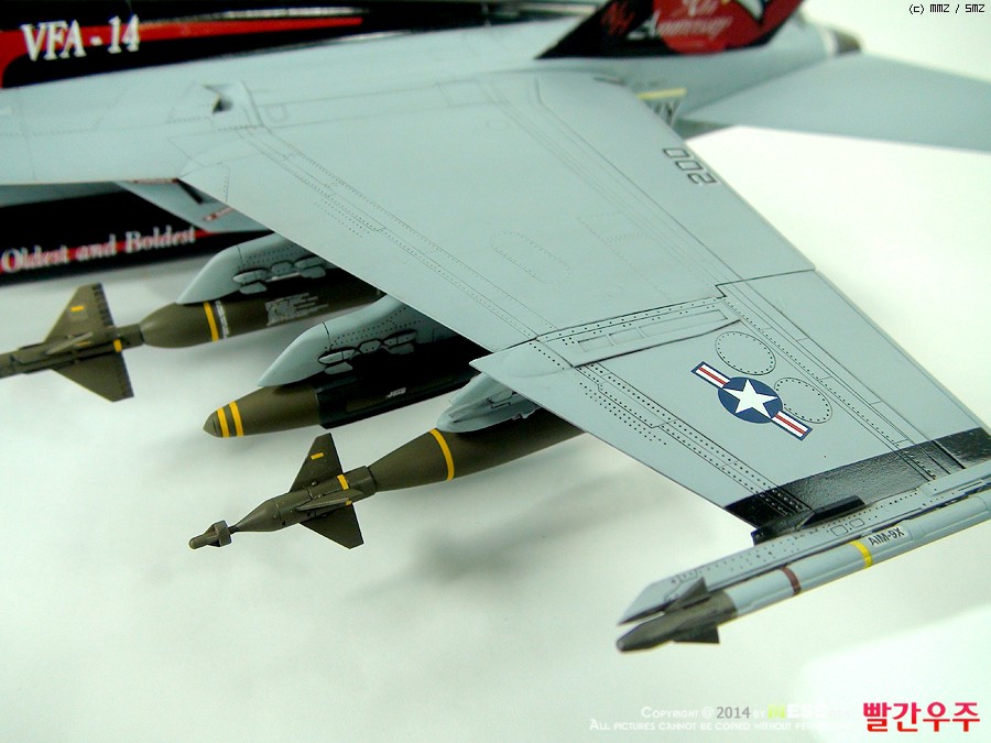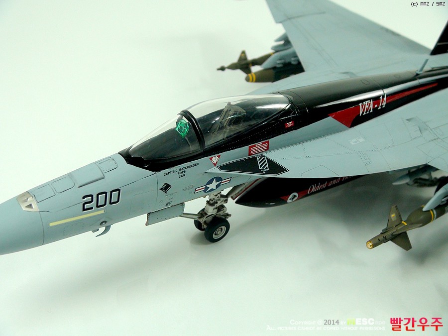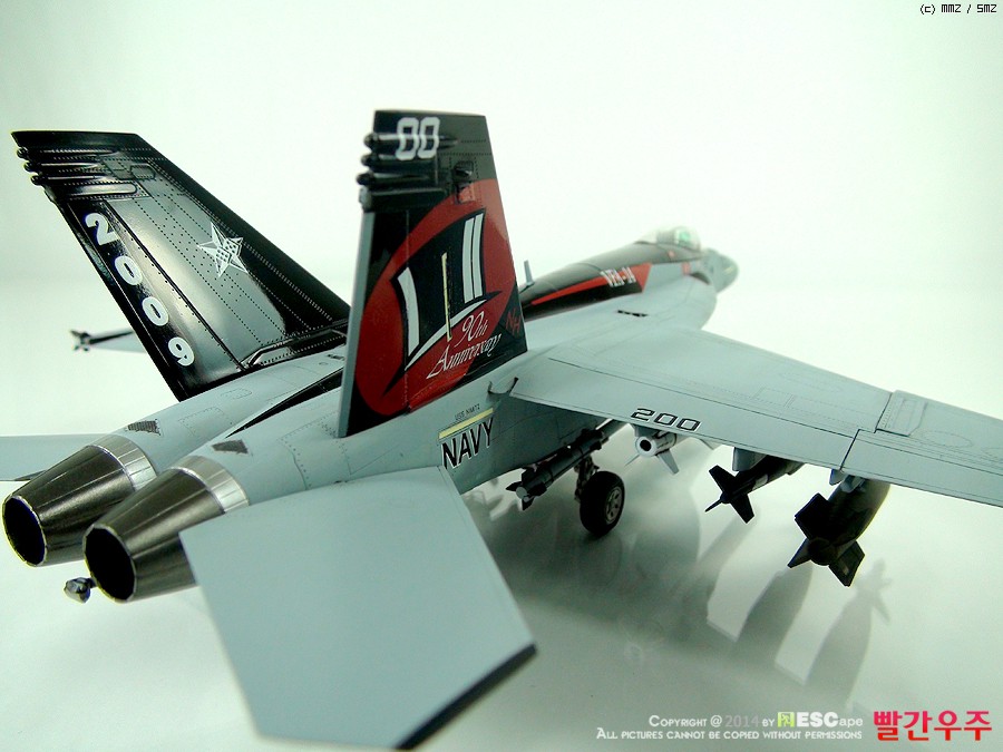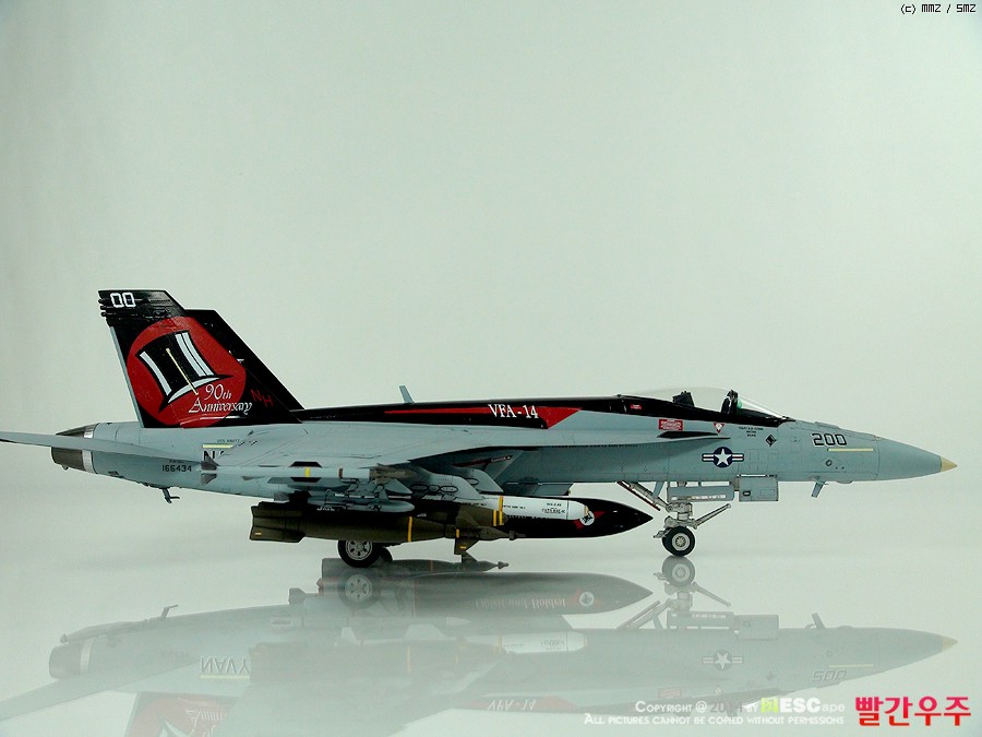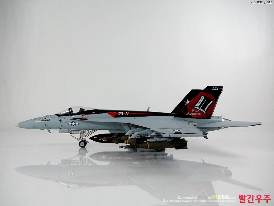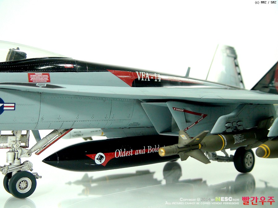 데칼이 조금은 어려운 부분이었습니다. 스페셜 도장(VFA-14의 부대창설 90주년 기체)인 바, 등판과 수직미익이 유광검정색으로 도장이 되어야 해서, 데칼링 후 유광클리어를 좀 과도하게 올려주었더니... 쩝쩝... ^^ 데칼이 안 좋다기 보다는 제가 너무 급하게 완성을 보려고 해서 일어난 일이죠. ^^ 근데 수직미익 데칼이 좀 넓은데다가 요철도 있는 부분이다보니 붙이는데 상당히 시간과 공이 많이 들었습니다.