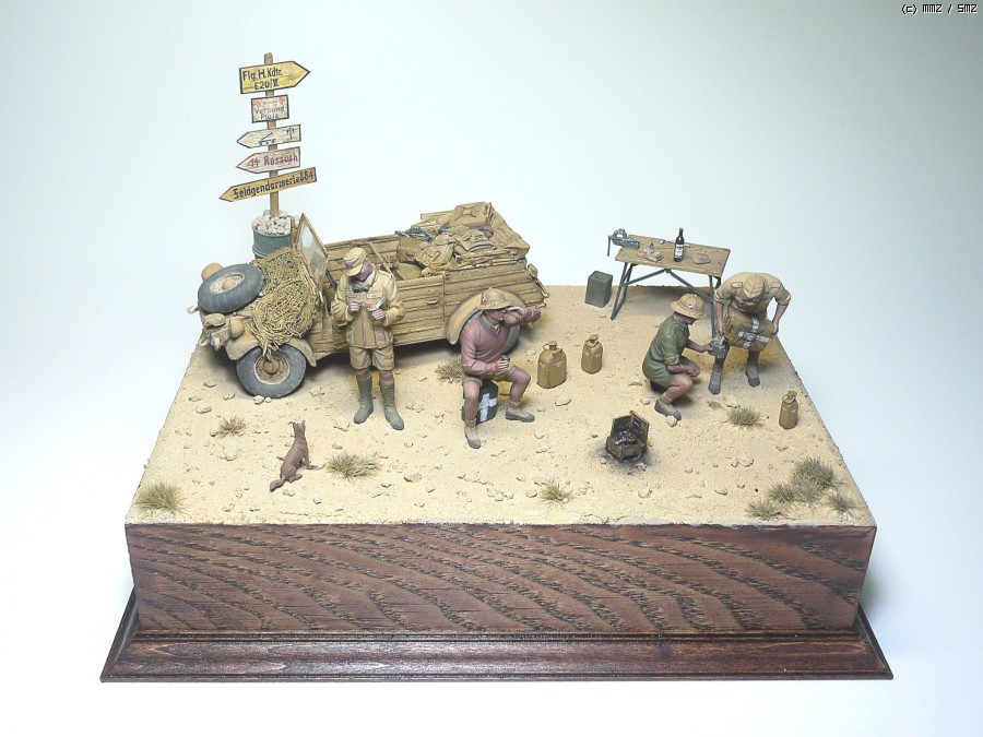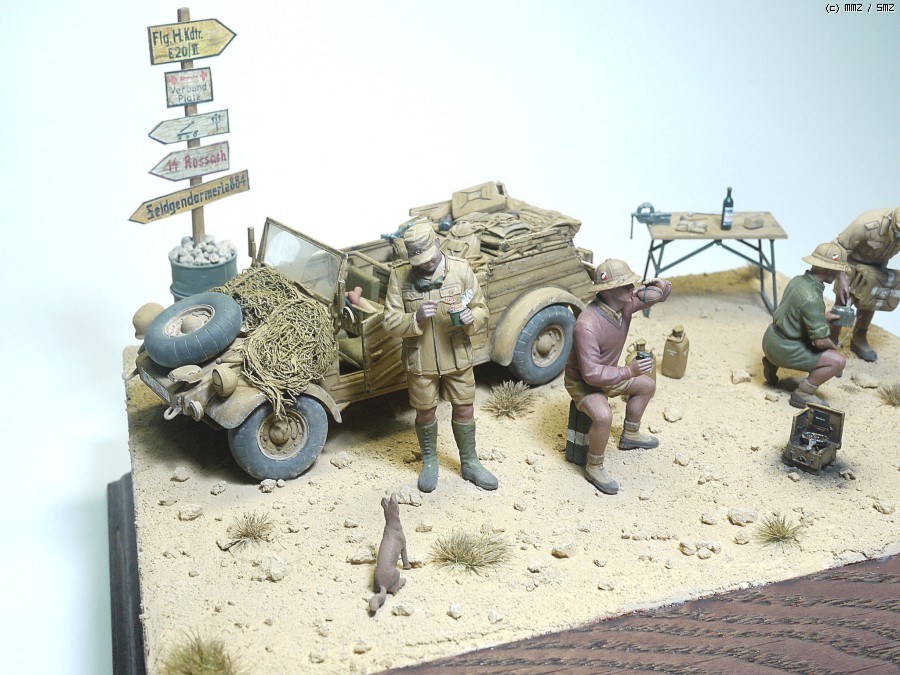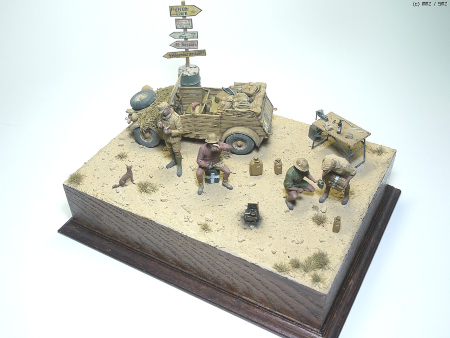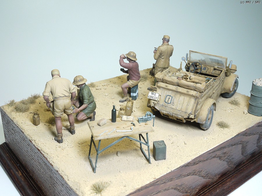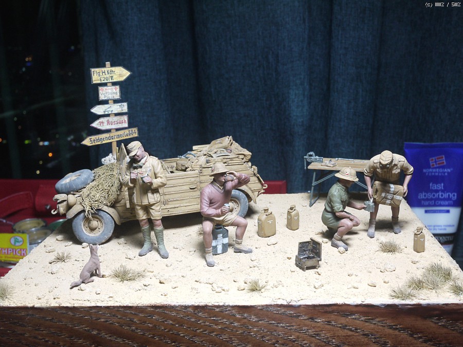 북아프리카 독일군을 이용한 간단한 비넷을 하나 만들어 보았습니다. 다들 아시는 드래곤 제품이구요. 그냥 컬렉션이 목적이다보니 특별한 창작은 없고 박스아트에 가깝게 연출해 보았습니다. 퀴벨바겐은 MMZ회원님이 만드신 서페이서까지 올려진 조립품을 분양받아 도색만 하였습니다. 너무 편하게 제작했네요.^^;; (분양해주신 회원님께 감사 드립니다.) 생업에 매진하랴 아이들과도 즐거운 시간 보내랴...작품하나 만들기 참 쉽지 않네요. 이런 여건에서 만드는 것도 나름 묘미라면 묘미겠죠.^^ MMZ회원 모든 분들 환절기 건강 조심하시고 다가 오는 명절 뜻깊고 알차게 보내시길 바랍니다.