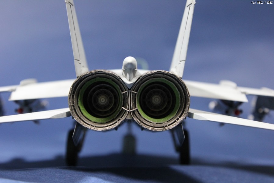 이 키트에서 가장 아쉬운 점은 에어인테이크 내부의 덕트가 없다는 점입니다. 그래서 어쩔수 없이 FOD커버를 자작해서 붙였습니다. 그리고 인테이크 안쪽의 측벽 형상이 실기의 직선과 달리 곡선형으로 이루어진 오류가 있습니다. 이 부분은 나중에야 인지하게 되어 수정하지 못했습니다. 아마 eduard제의 인테이크 에칭을 사용하면 쉽게 수정가능할지도 모르겠습니다