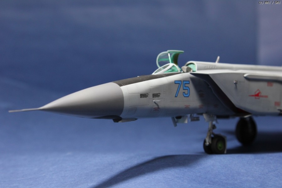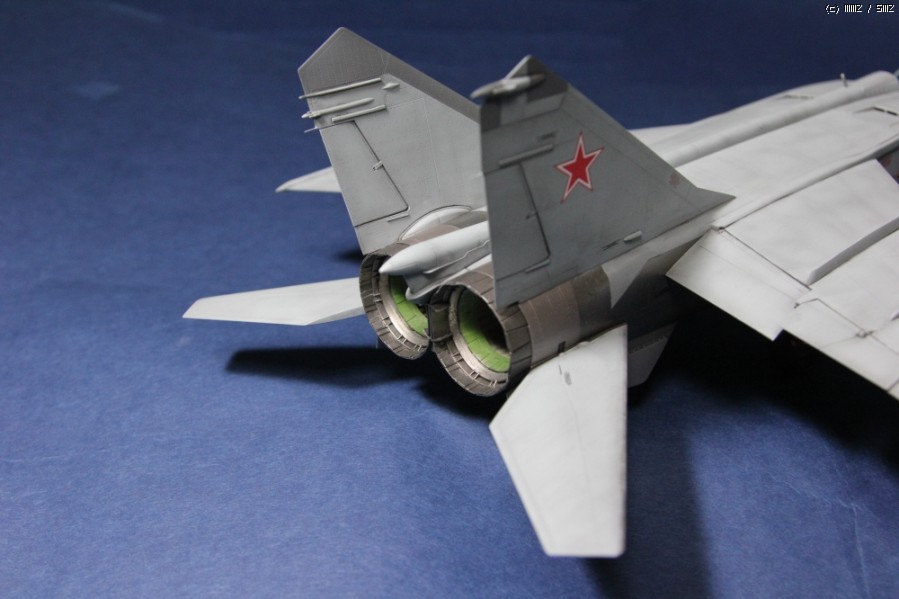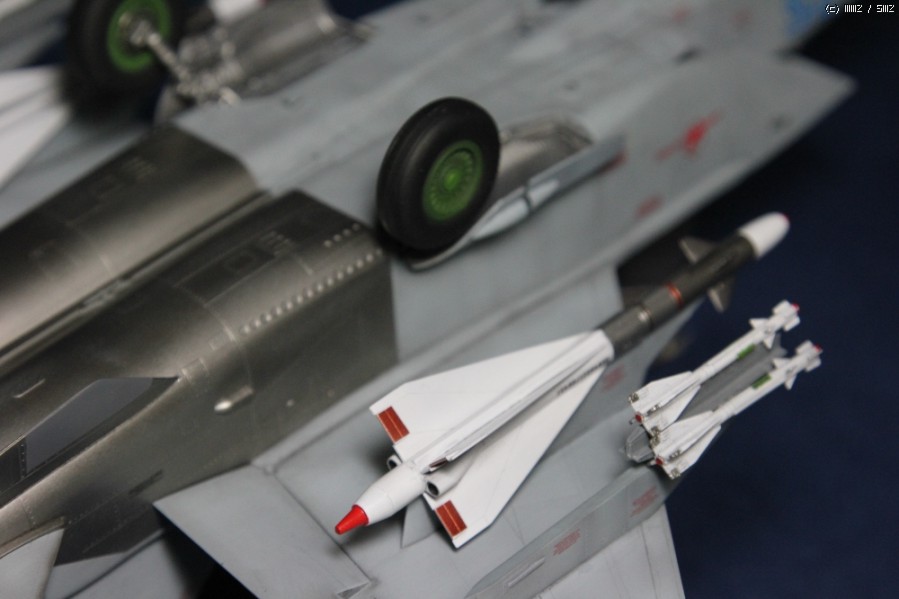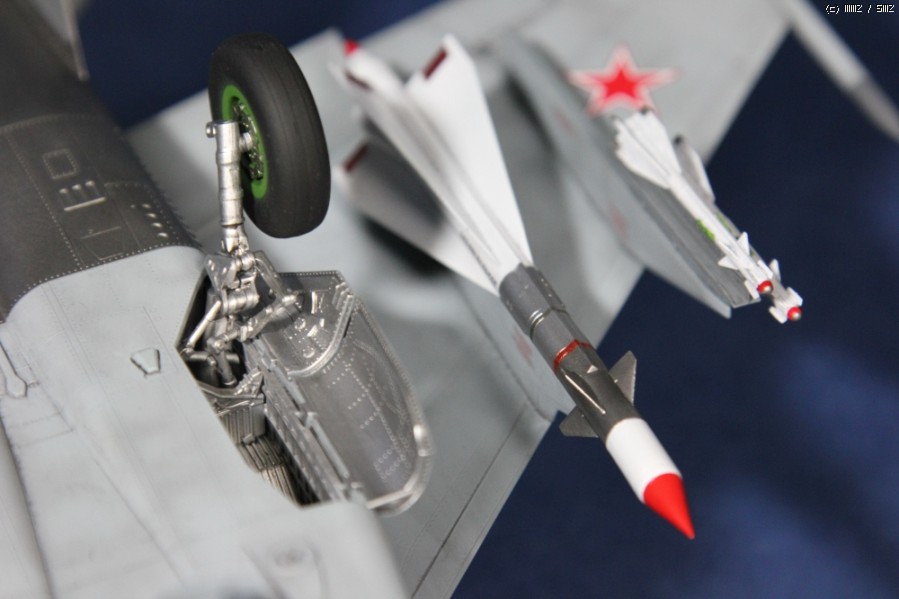 탄두의 형태에 따라 R-40T와 R-40R 미사일의 앞부분 날개의 위치가 서로 다릅니다. 사진을 보고 수정했습니다. 바퀴의 디테일은 타이어표면의 약한 + 몰드가 오히려 깊은 -몰드로 새겨져 있어 아얘 퍼티로 다 메워버렸습니다.