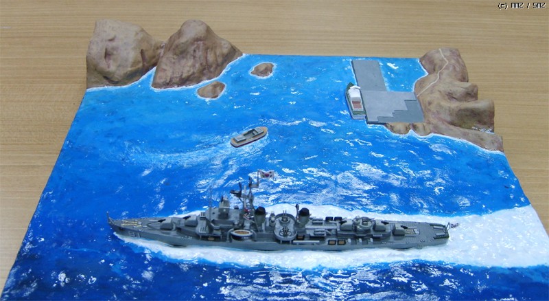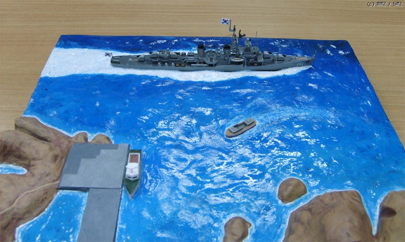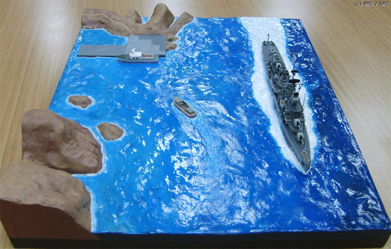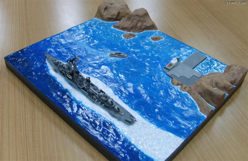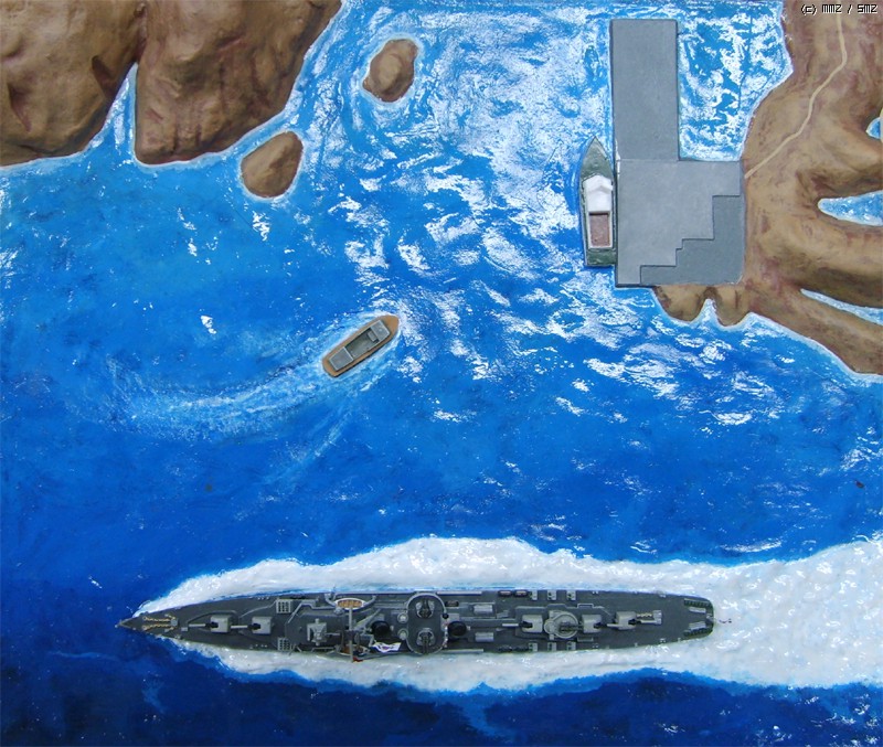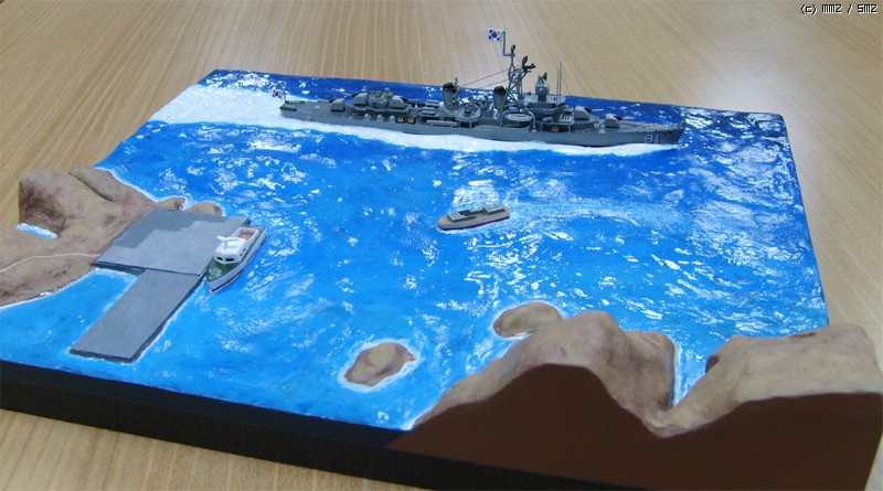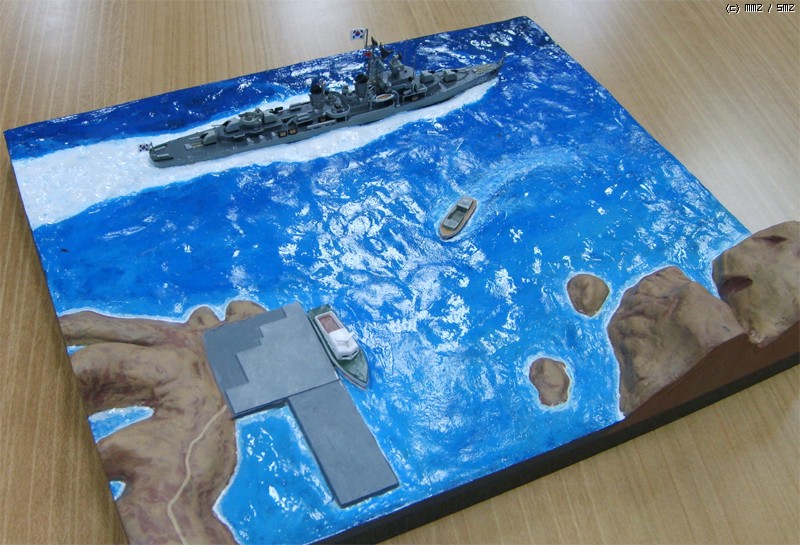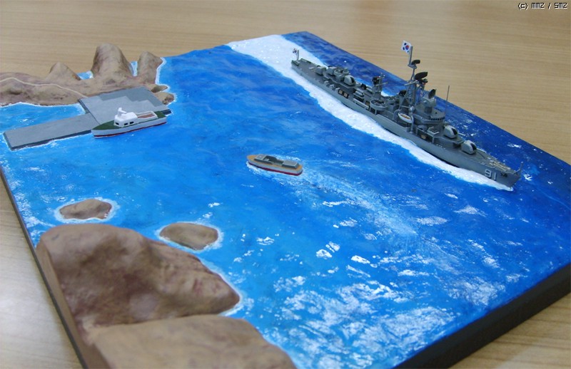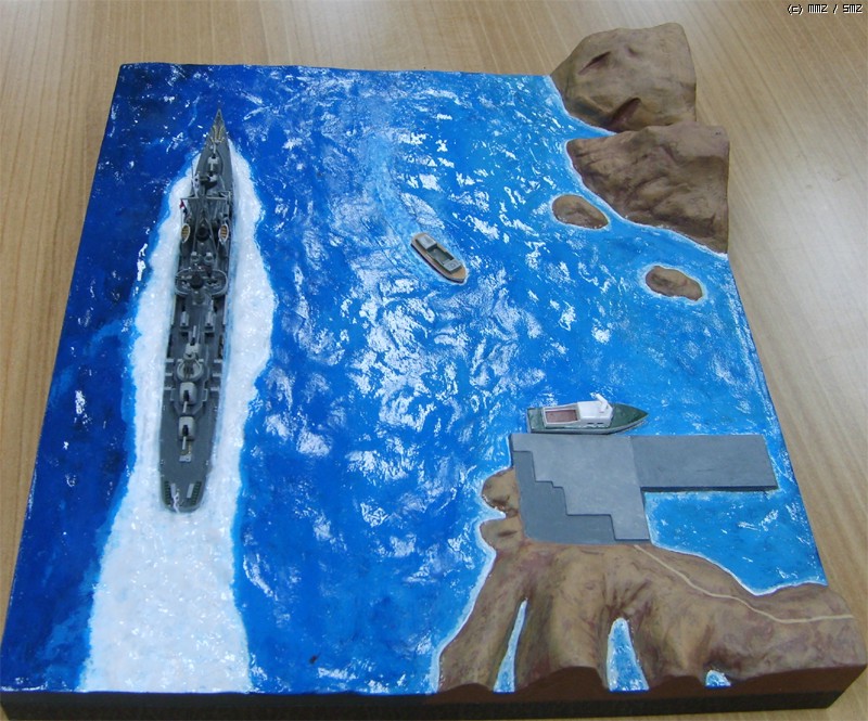 모형의 제약상 3,000톤 가까운 군함이 너무 섬에 바짝 붙어서 항진하는 것 같은데 베이스를 너무 크게 만들면 또 휑하니 썰렁하지 싶어서 약간 축약했습니다.
