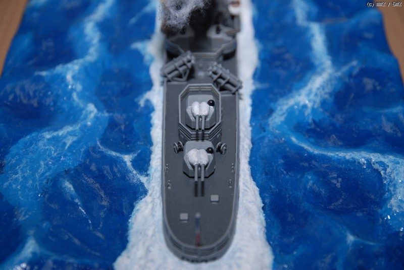 조명이 너무 강해서 그런지 배와 바다의 색이 실물보다 너무 환하게 나왔습니다. 실물은 바다색이 훨씬 짙은 남색인데 사진에는 밝은 청색으로 나왔습니다. 선체색도 짙은 회색인데 밝은 회색으로 나왔고요. 사진 찍는 기술을 좀 더 익혀야 될 것 같습니다.