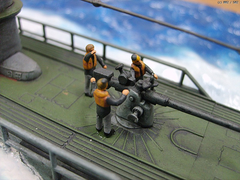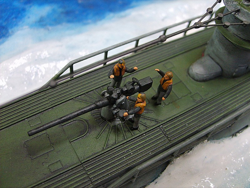 독일의 유보트는 수상주행시 함교에 4명의 견시가 사방을 감시하는 것이 엄격한 규정이어서 수상주행하는 유보트의 함교에 사람이 보이지 않는다는 것은 말이 안되기 때문에 규정에 맞도록 인형을 배치해 주었습니다.