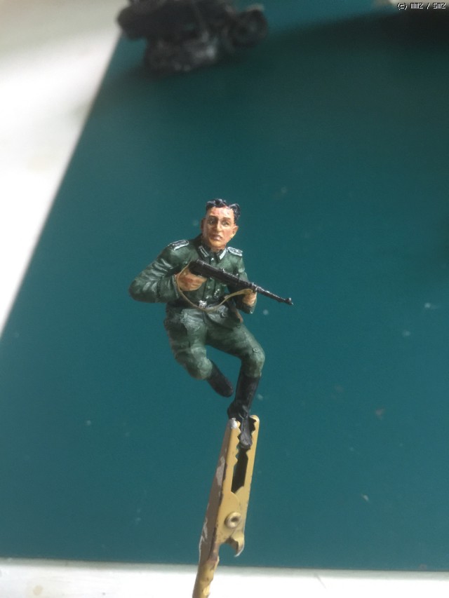 오토바이 뒤에 숨어있는 독일군 장교인데 이 놈도 권총을 든 형태랑 기관단총을 든 형태 둘 중에 하나로 선택할 수 있는데요. 소련군 장교가 권총을 들고 있어서 이 놈은 기관단총으로 만들어 봤습니다. 겁먹은 얼굴 표정을 해봤는데 잘 된건지 모르겠네요.