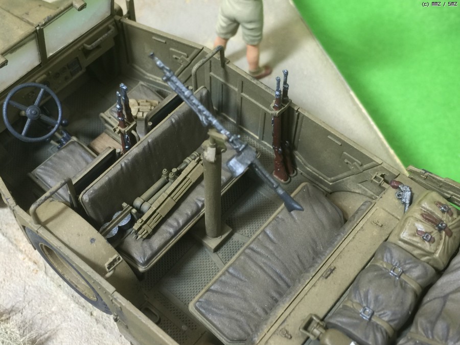 차량 내부는 적당한 장비로 채우려고 했으며 기관총 거치대도 남는 부품 중 하나를 사용했습니다. 실제 사진을 보니 슈타이어 차량은 개인 장비를 차량 뒤 적재칸에 넣어두는 것 같습니다.