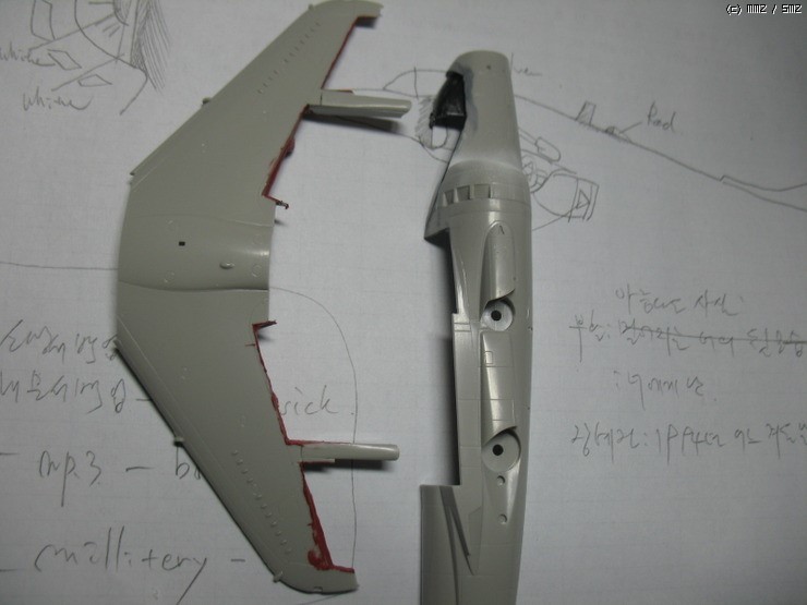 1.수직미익, 2. 플랩개조, 3. 하면 개폐부, 4. 랜딩기어, 5. 엔진노즐, 6. 보조 에어인덱크(착륙상태), 7. 기수부분 안테나 제작