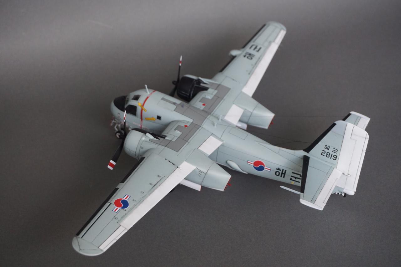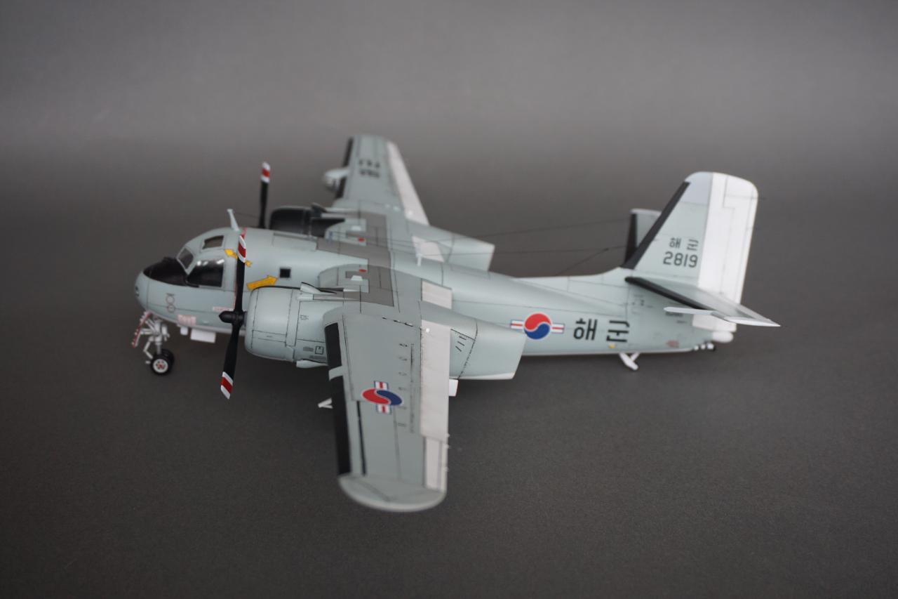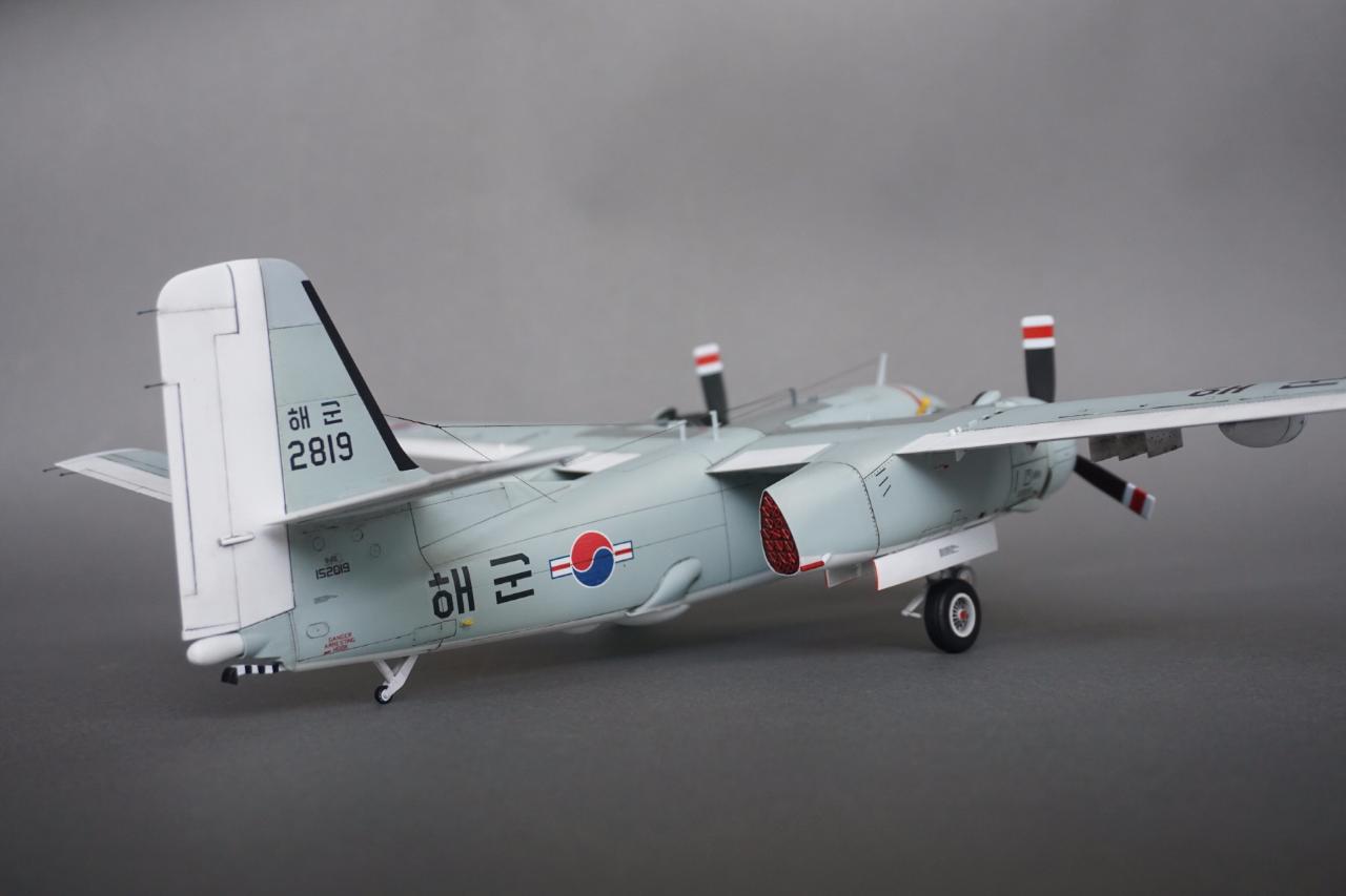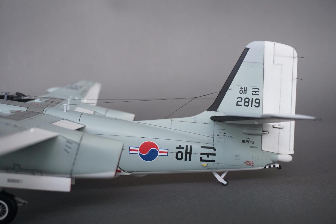 키네틱 S-2 입니다. 우리나라 해군에서 사용하던 기체로 만들었고요 갤러리에도 회원분들 작례가 있는데 전 데칼을 못 구해서 직접 만들었습니다. 돈도 많이 들고 특히 자료가 너무 없어서 참 힘들었는데 마침 플래툰 2001년 5월호에 선명한 사진이 몇 장 있어서 그 사진들을 바탕으로 작업 하였습니다. S-2에 대해서는 잘 모르지만 이번에 만들면서 보니 세세한 변종이 참 많은 기체인 것 같습니다. 킷하고 사진을 비교하자면 테일에는 둘 다 S-2E로 마킹되어 있는데 안테나선 부착위치도 다르고 기수와 어뢰 격납창도 길이도 다릅니다. 보면 볼수록 세부사항에서의 차이가 계속 발견되는데 그런 것 다 따지다가는 완성 못할 것 같아서 적당한 선에서 정리하였고 사진상의 실물 기체가 너무 깨끗해서 저 또한 치핑이나 웨더링은 거의 하지 않았습니다.