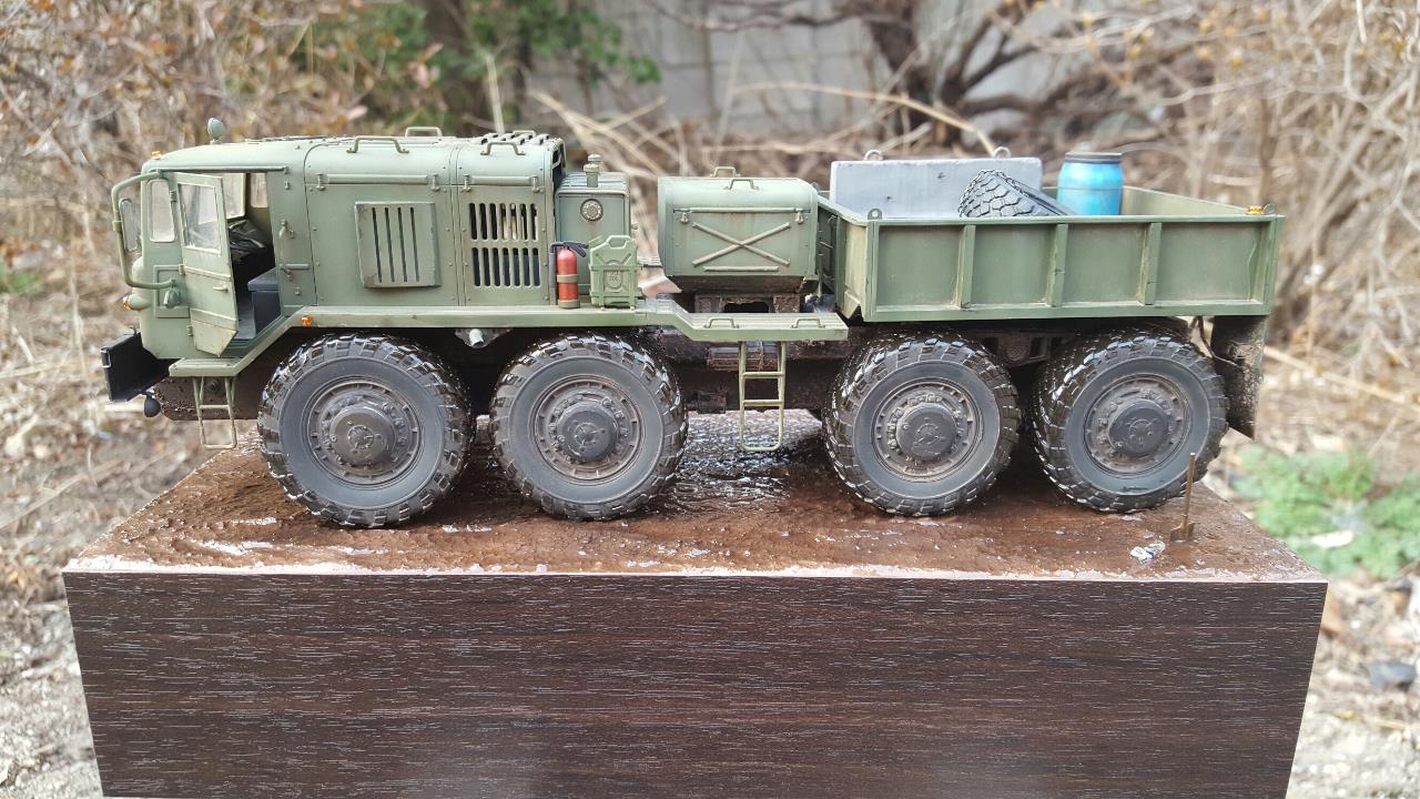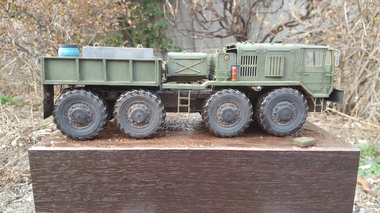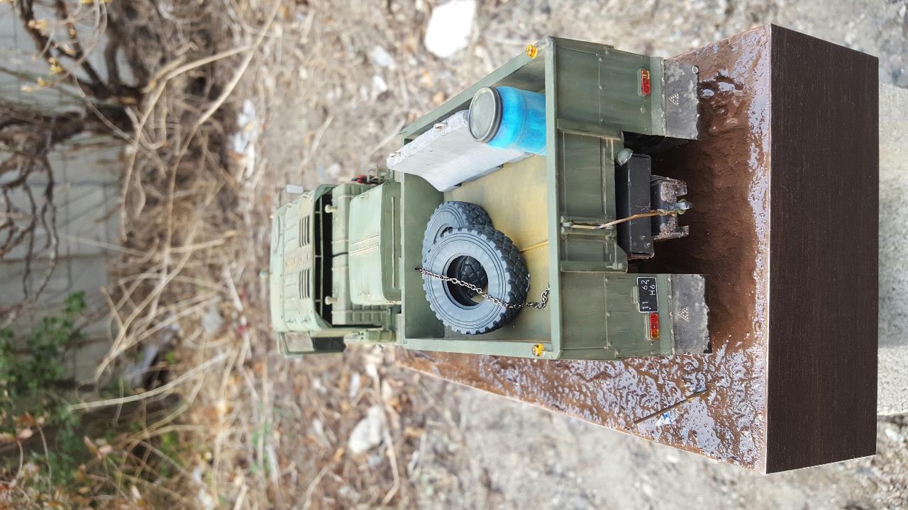 진흙길을 지나가다 잠시 운전사가 자리를 비운 장면입니다. 베이스가 허전하여 기름통,삽 등을 꽂아보았습니다.