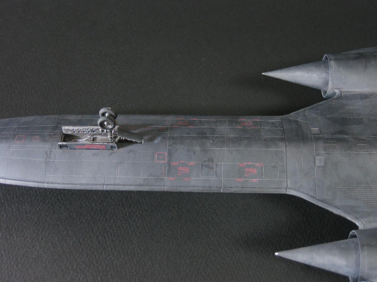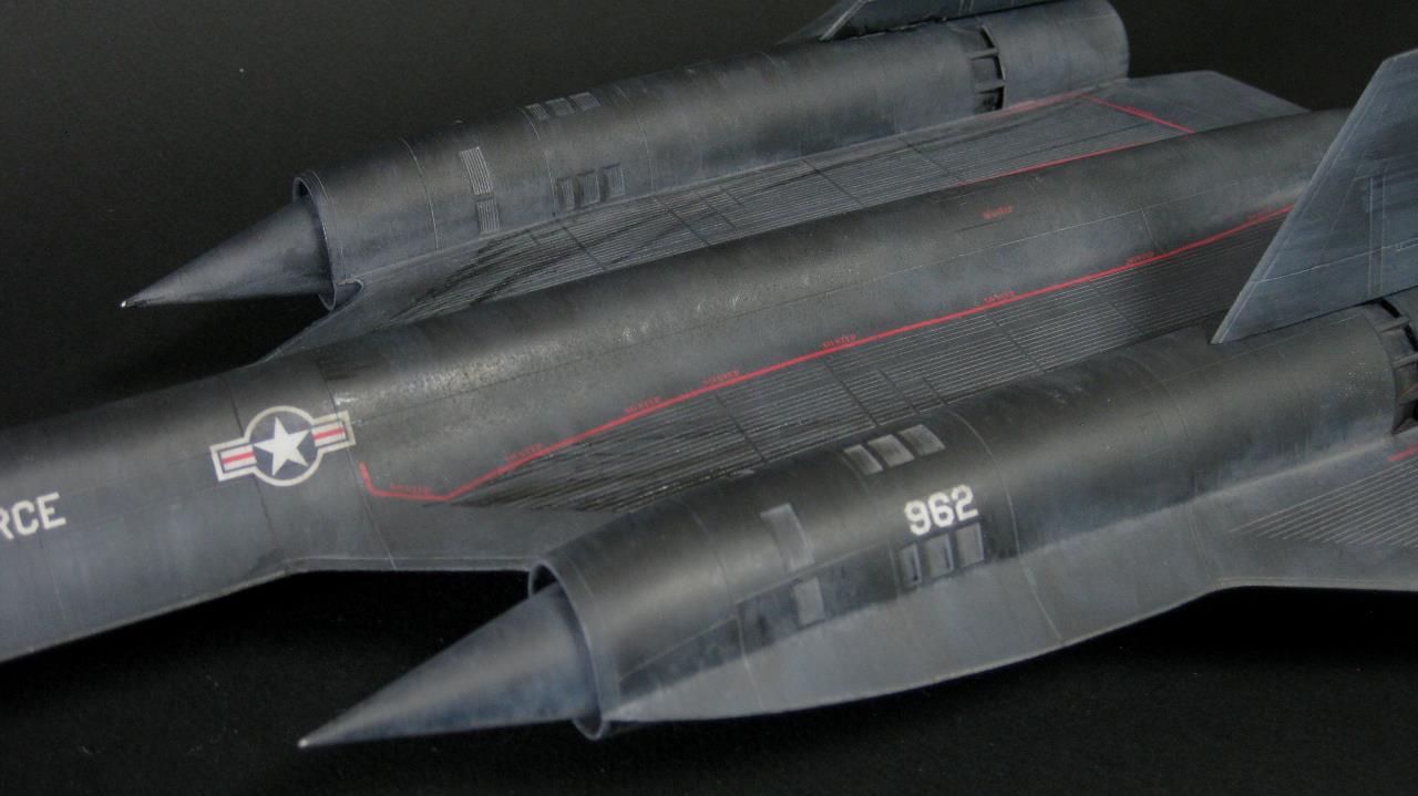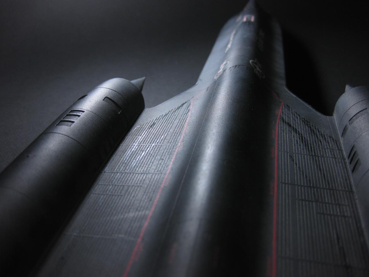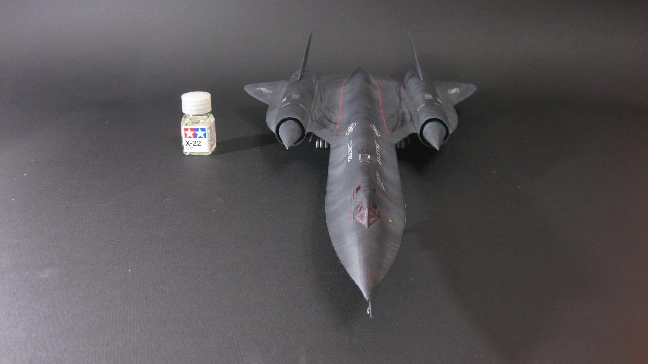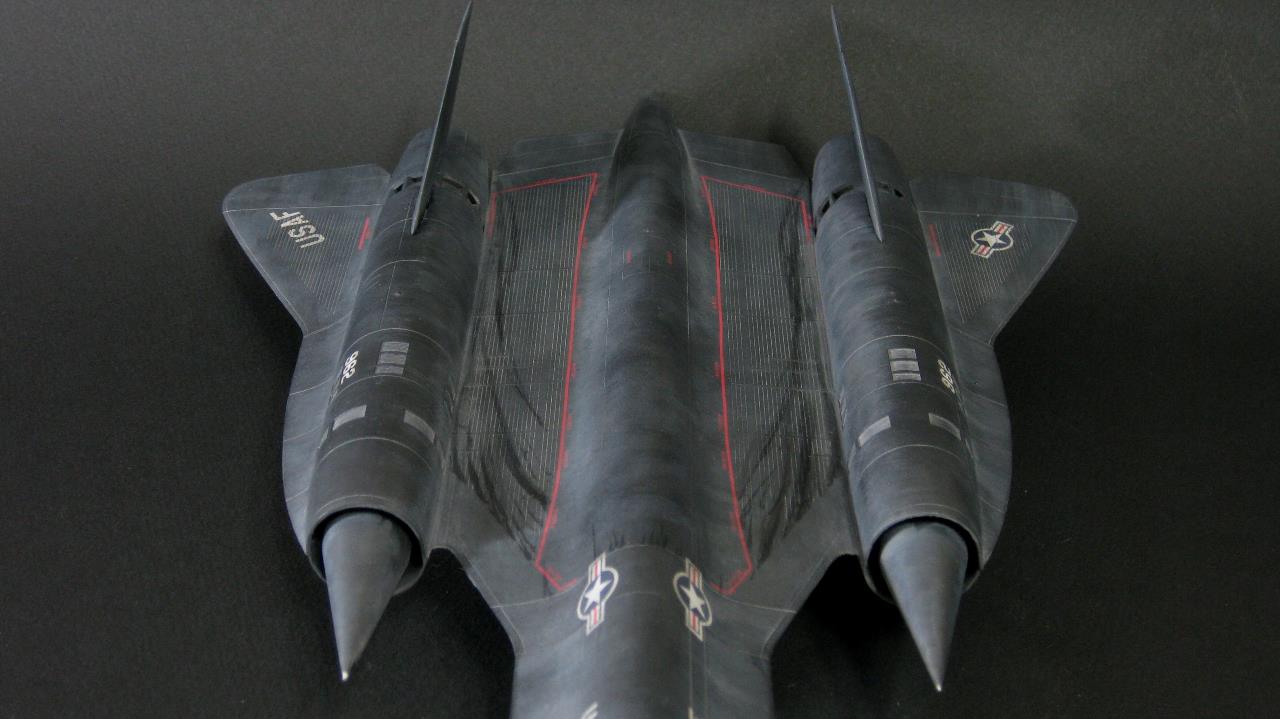 SR-71은 최고속 운행시 공기 마찰열로 모든 외장 패널이 팽창합니다. 그래서 지상에서는 수축하여 벌어진 채로 주기되기때문에 각종 기름이 배어나온답니다. 그래서 그런지 실기사진을 보면 날개위에 기름이 죽죽 늘어져있는 모습이네요. 유광클리어 에나멜로 표현해주었습니다.