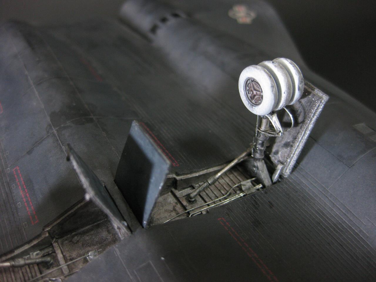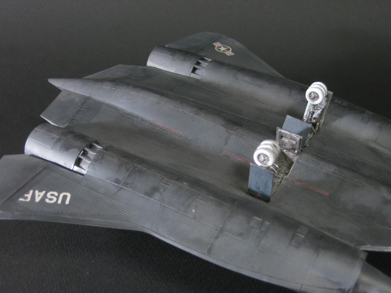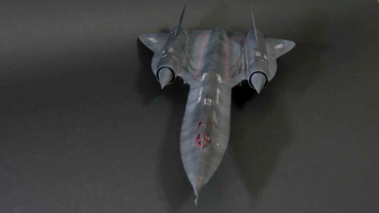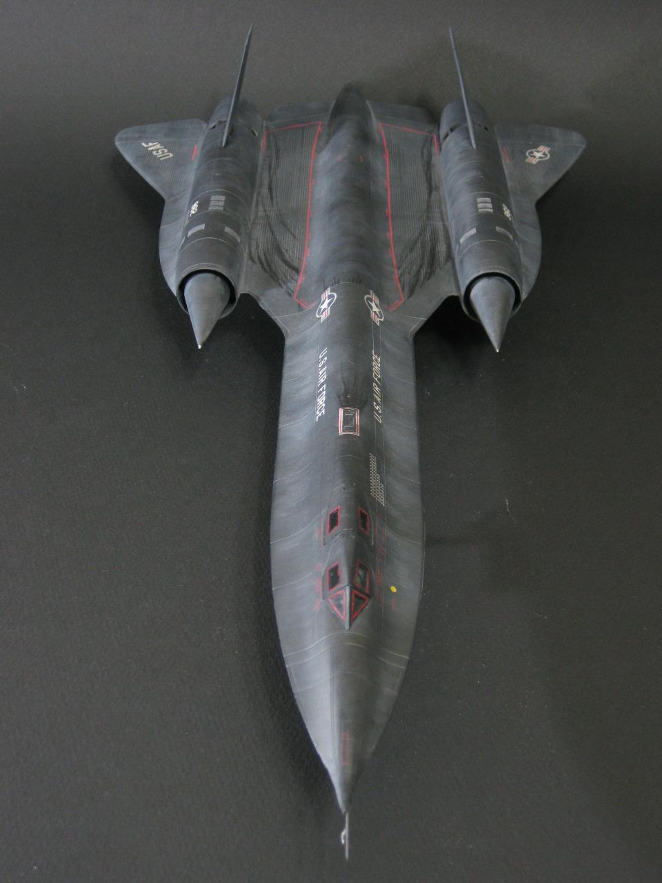 SR-71은 최고속 운행시 공기 마찰열로 모든 외장 패널이 팽창합니다. 그래서 지상에서는 수축하여 벌어진 채로 주기되기때문에 각종 기름이 배어나온답니다. 그래서 그런지 실기사진을 보면 날개위에 기름이 죽죽 늘어져있는 모습이네요. 유광클리어 에나멜로 표현해주었습니다.