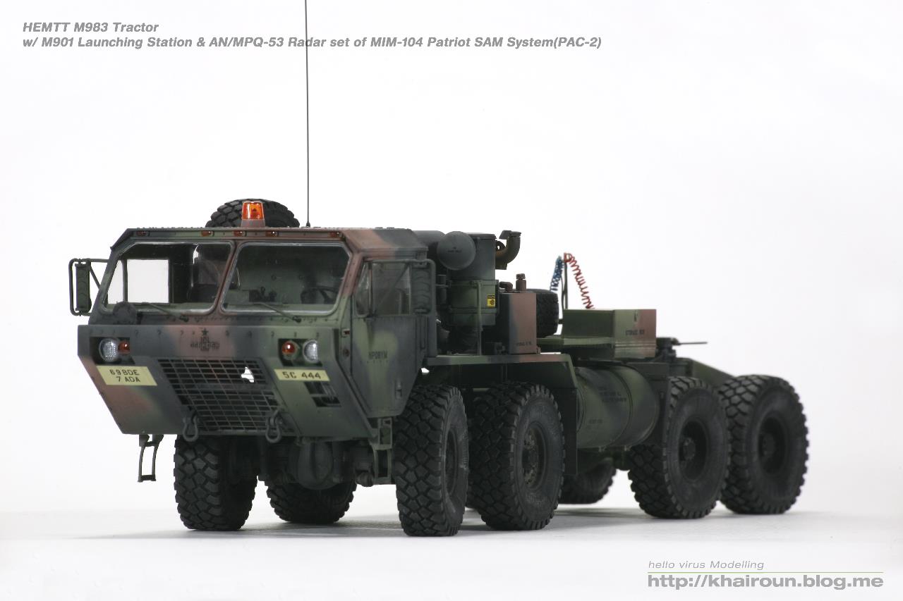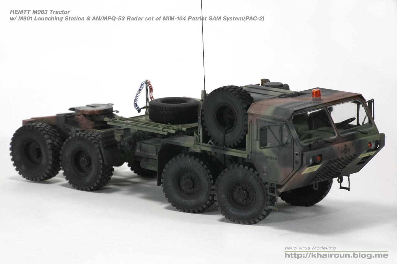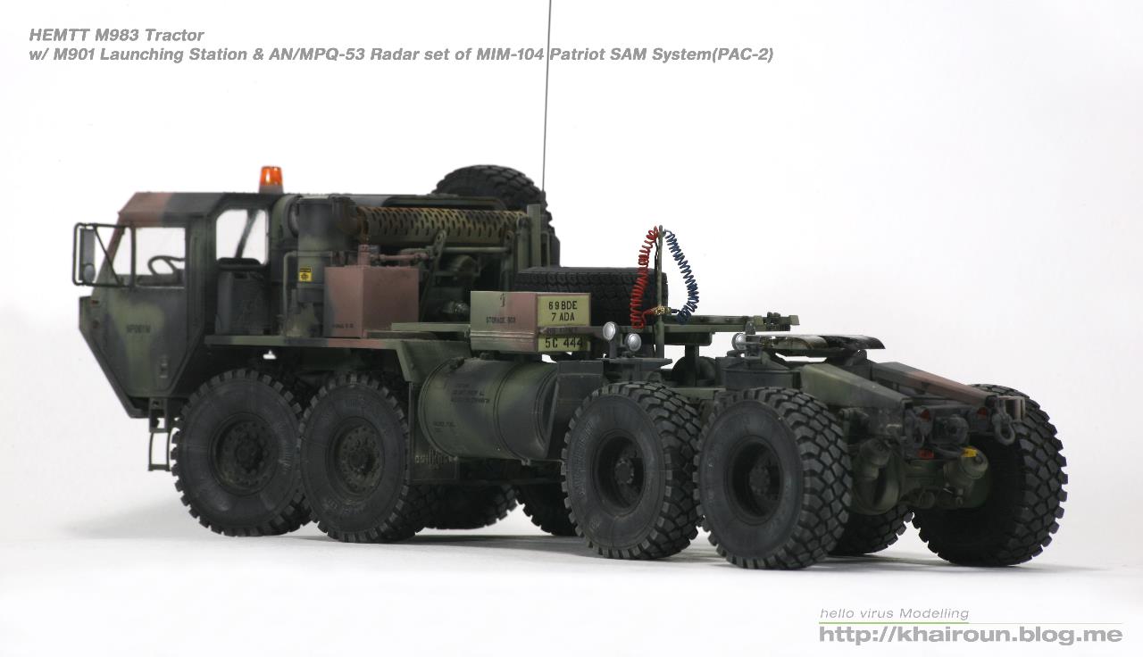 트럼페터의 키트를 베이스로 DEF.model에서 얼마전 발매된 휠세트를 사용하였습니다. 이전에 발매되었던 M977용 휠보다 각인도 뚜렷해지고 볼륨감도 훨씬 풍성해져서 무척 보기 좋습니다. 트랙터 부분은 조립이 할만한데 트레일러는 조립이 까다로운 부분이 많습니다. 전체적으로 구조도 복잡해서 위장무늬 도색도 만만치가 않습니다. 키트의 데칼은 소프터에도 반응을 잘해서 조심히 다루어야겠더군요.