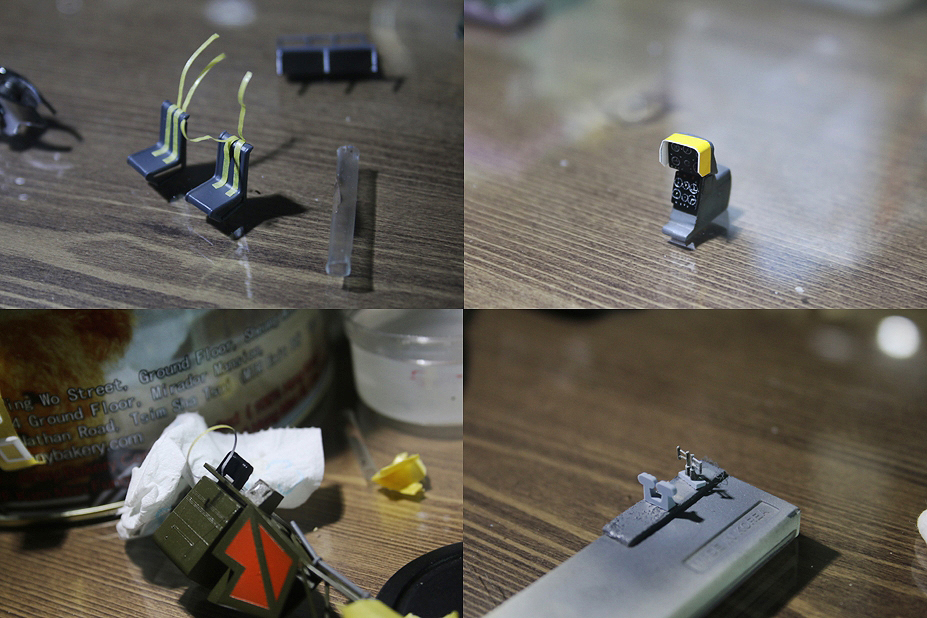 앞뒤좌석 모두 마스킹테잎으로 벨트 만들어주었구요 플라스틱재질 명함을 이용한 계기판후드,몰드가 필요한곳엔 마스킹 테잎으로 적당히 표현해주었습니다.맨 오른쪽 아래사진 앞부품이 조종석 페달인데요..너무 투박하고 실기 사진이랑도 좀 안맞아서 런너를 이용해서 페달을 만들어주었습니다. 뒷쪽 페달이 런너를 이용한 페달이네요.