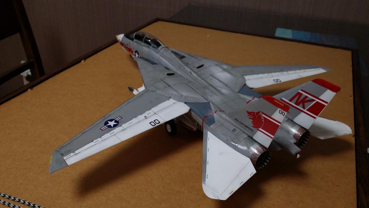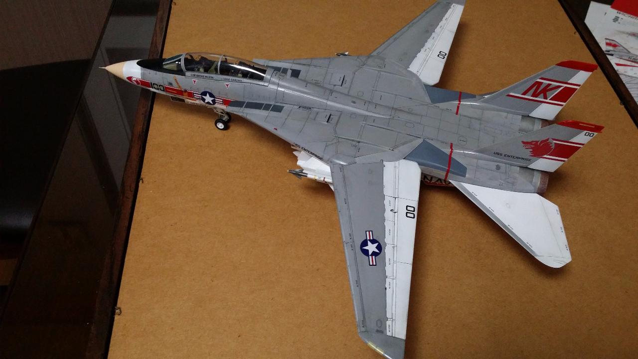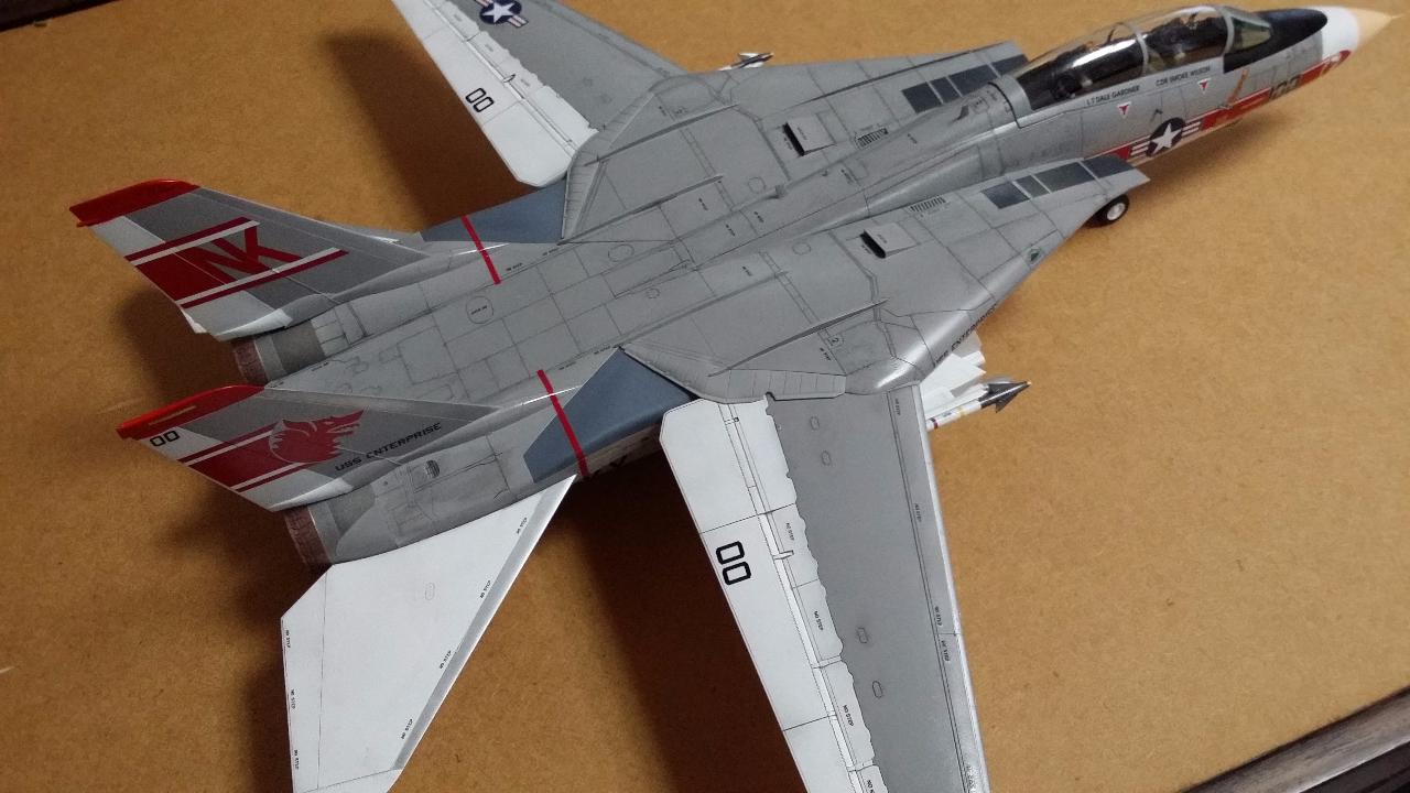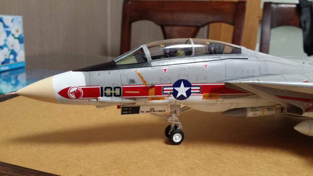 데칼은 시제품이라 기본적인 데이터 데칼과 미사일에 부착되는 100개 가까이 되는 데칼들은 키트 것을 사용했고 큼직한 빨간색 데칼, 국적 데칼들은 모노키오 사 제품입니다. 엔터프라이즈 항모에 귀속된 울프팩 소속 전투기를 표현한 것입니다. 레이돔과 기수의 검은 색 안티 글레어 도장, 에어 인테이크 양 쪽 위의 짙은 회색 띠등은 스텐실로 마스킹 후 에어브러쉬로 도색해 준 것 입니다.