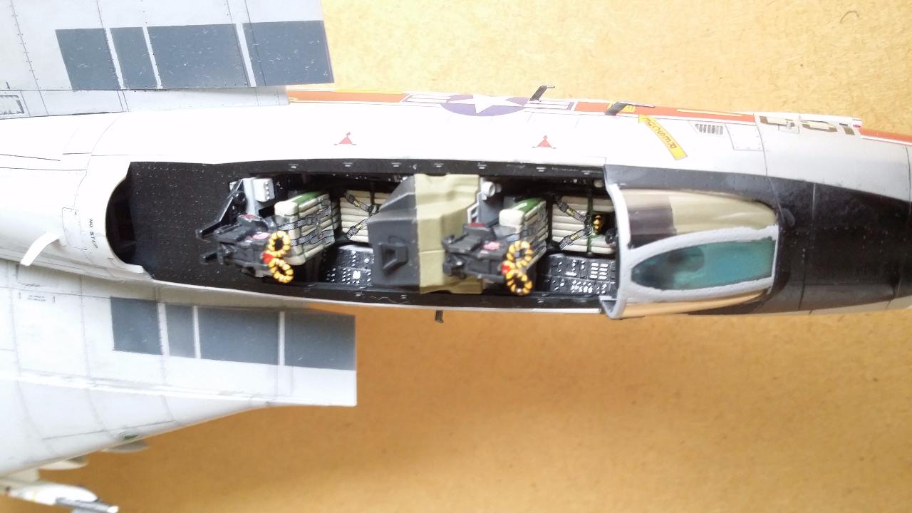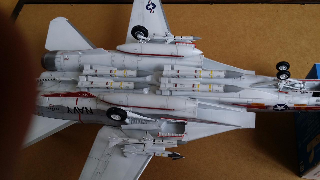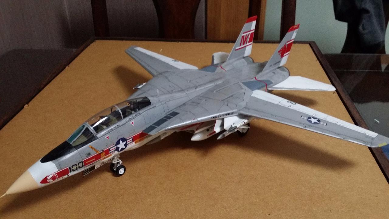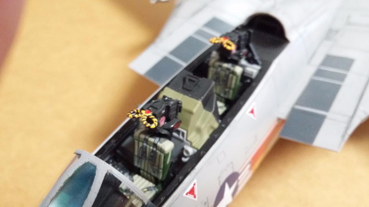 데칼은 시제품이라 기본적인 데이터 데칼과 미사일에 부착되는 100개 가까이 되는 데칼들은 키트 것을 사용했고 큼직한 빨간색 데칼, 국적 데칼들은 모노키오 사 제품입니다. 엔터프라이즈 항모에 귀속된 울프팩 소속 전투기를 표현한 것입니다. 레이돔과 기수의 검은 색 안티 글레어 도장, 에어 인테이크 양 쪽 위의 짙은 회색 띠등은 스텐실로 마스킹 후 에어브러쉬로 도색해 준 것 입니다.