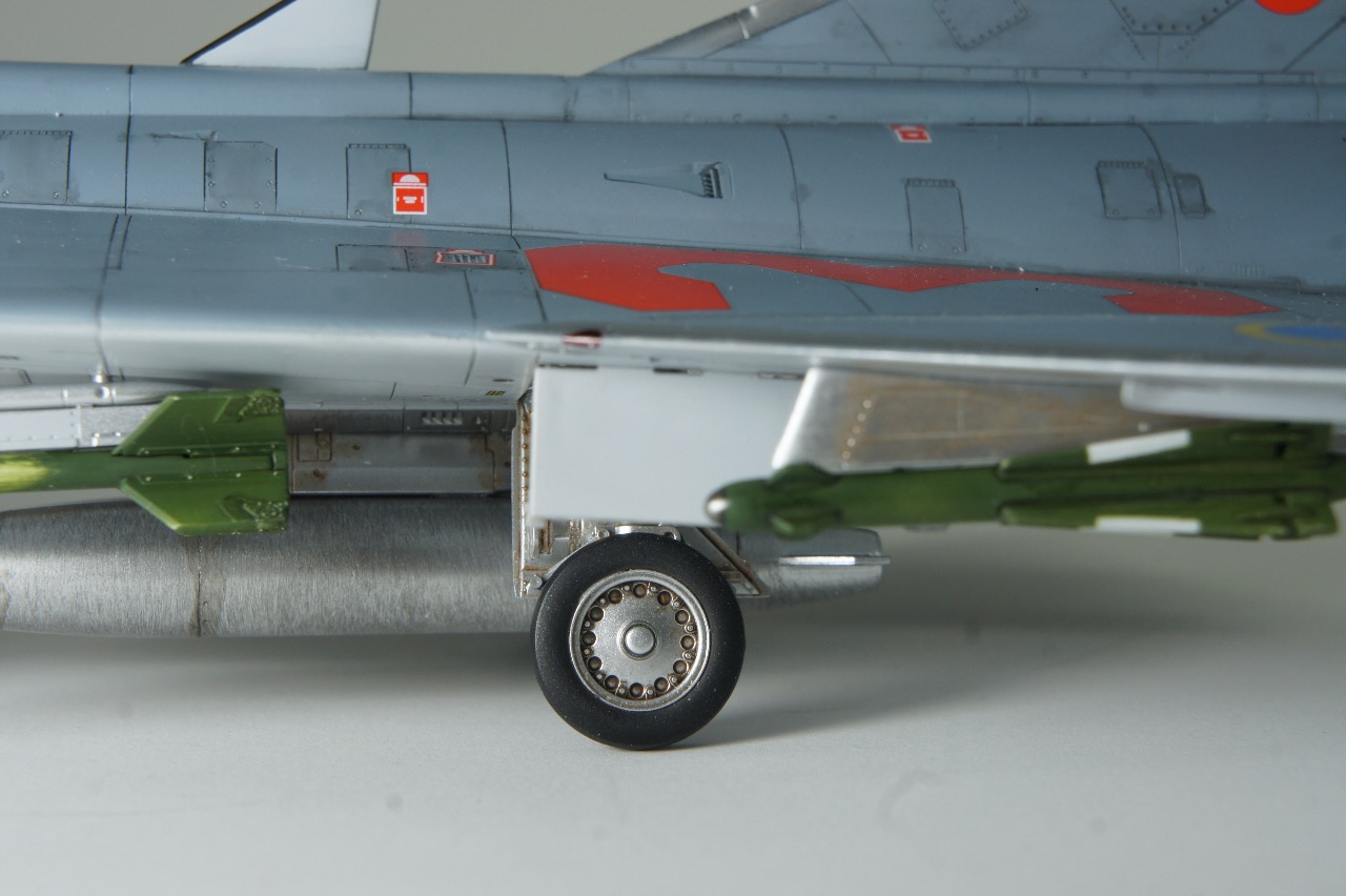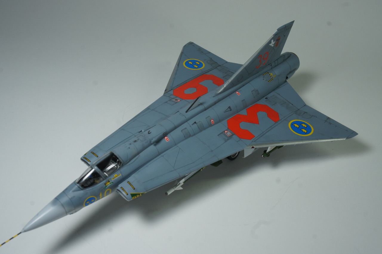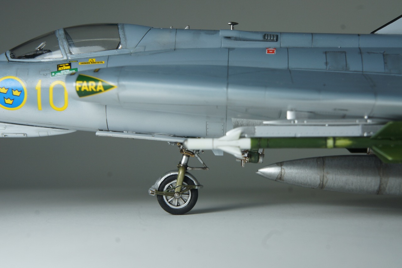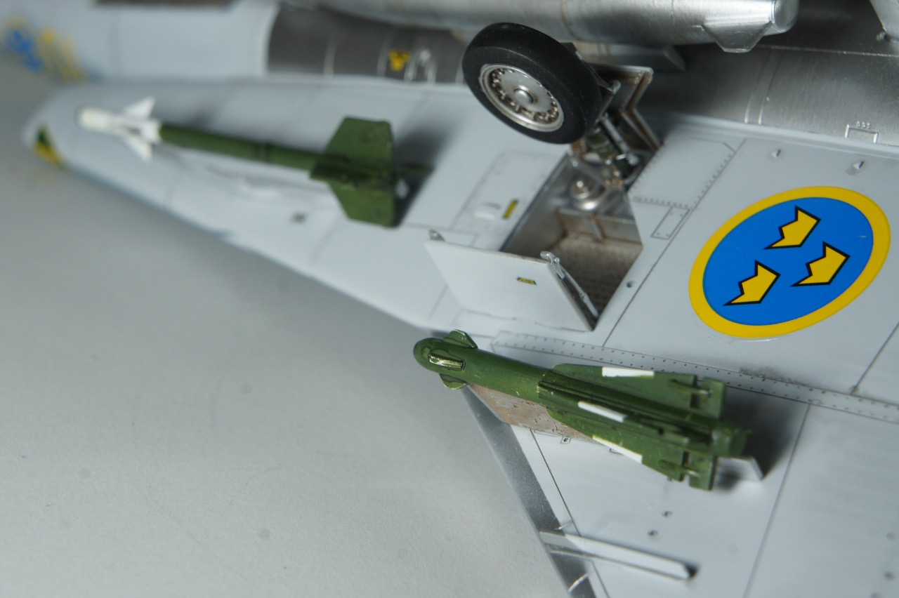 전방에 AIM-9B 사이드와인더, 후방에 AIM-4D 팰콘 공대공 미사일을 두발씩 장착하고 있습니다. 스웨덴 공군은 실탄이 아닌 연훈련용 더미탄을 녹색으로 칠하고 있는듯 합니다. 저는 웬지 실탄보다 더미탄이 더 눈이 갑니다.
