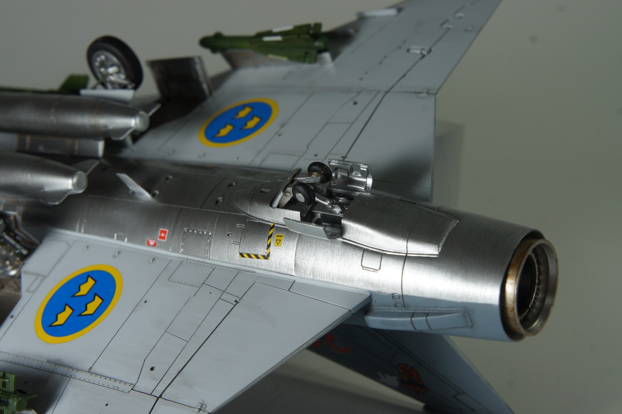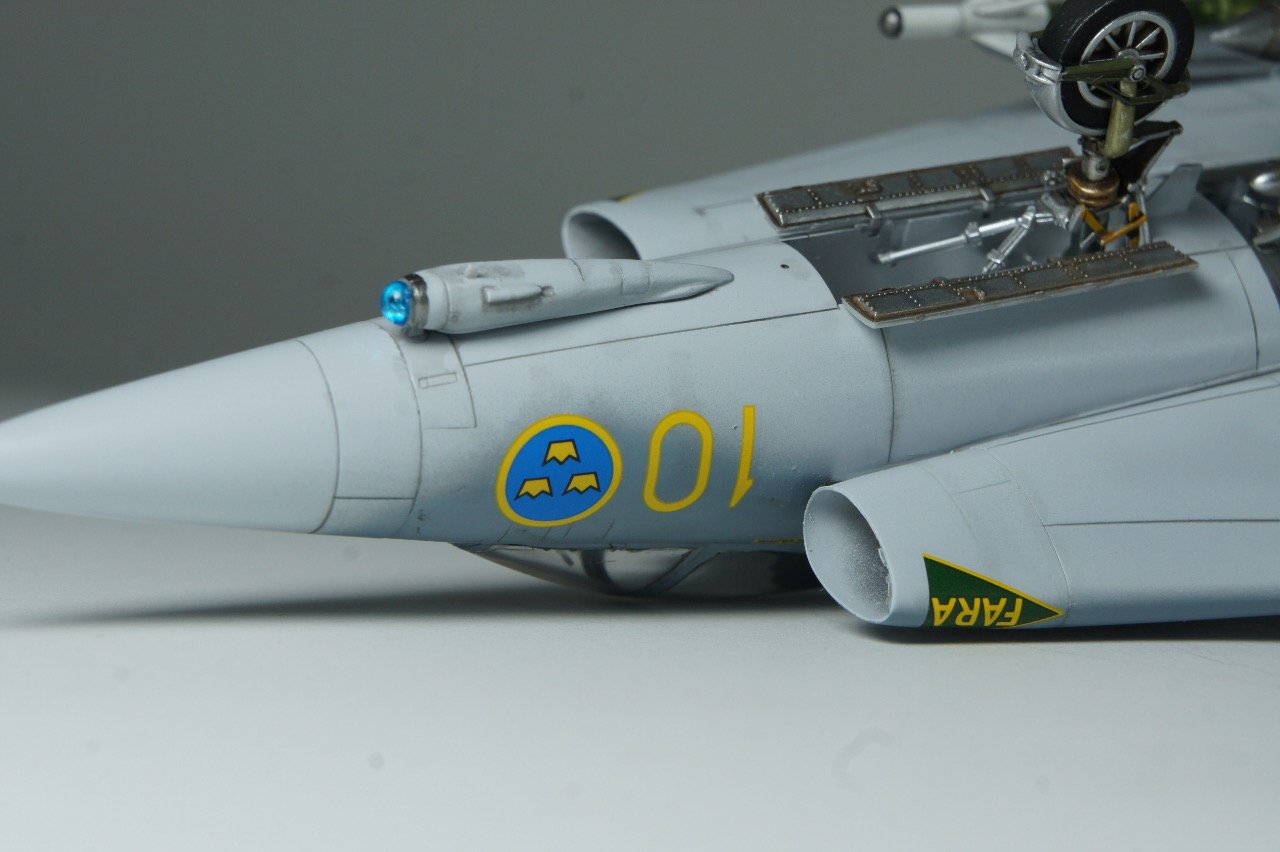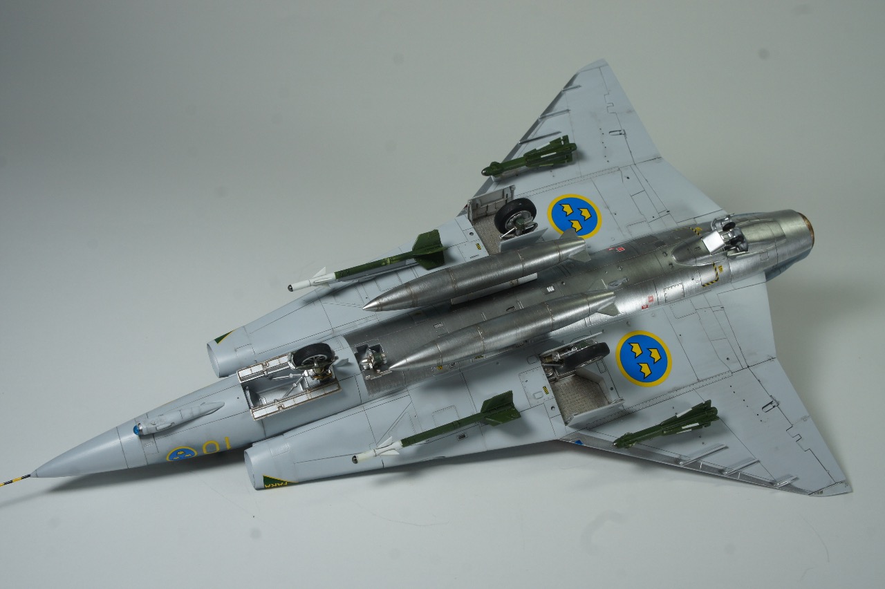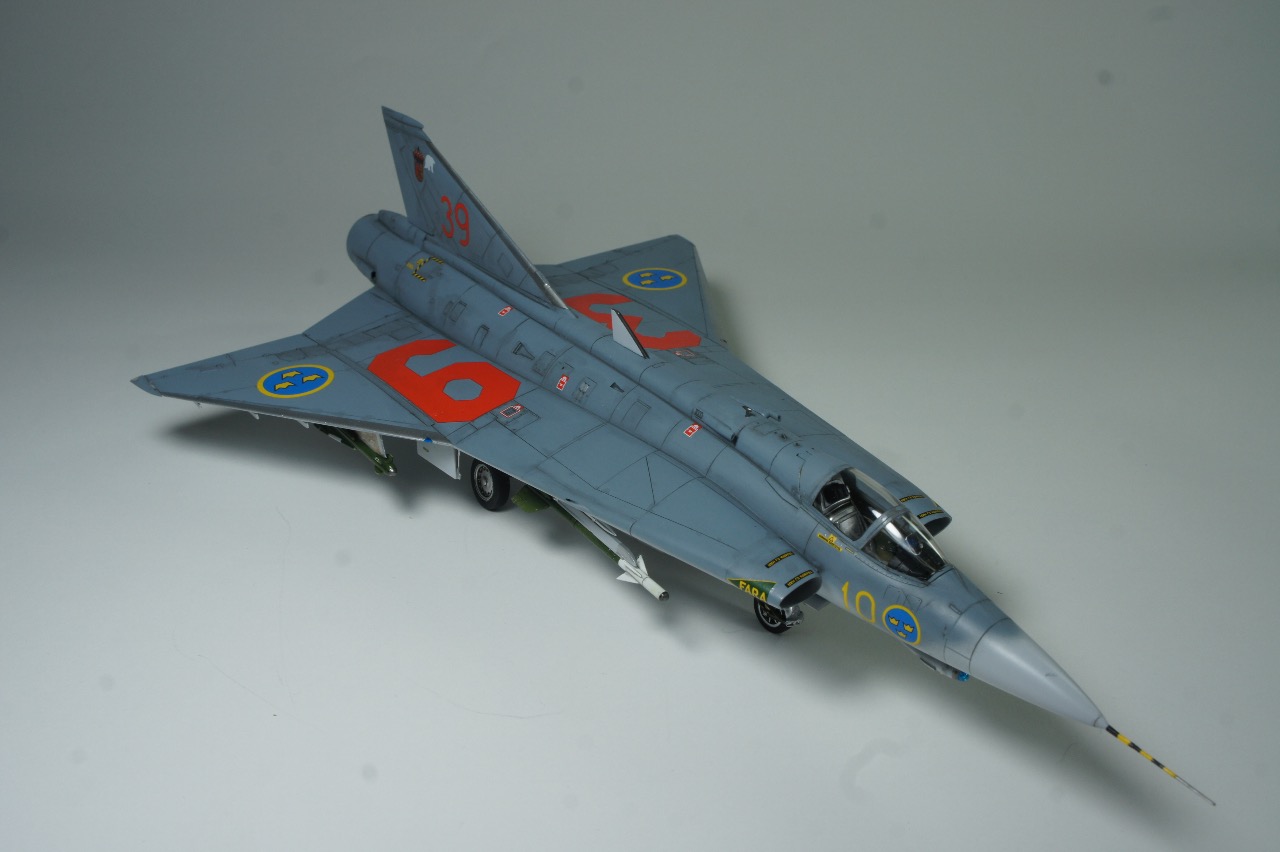 전방에 AIM-9B 사이드와인더, 후방에 AIM-4D 팰콘 공대공 미사일을 두발씩 장착하고 있습니다. 스웨덴 공군은 실탄이 아닌 연훈련용 더미탄을 녹색으로 칠하고 있는듯 합니다. 저는 웬지 실탄보다 더미탄이 더 눈이 갑니다.