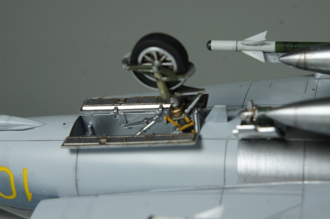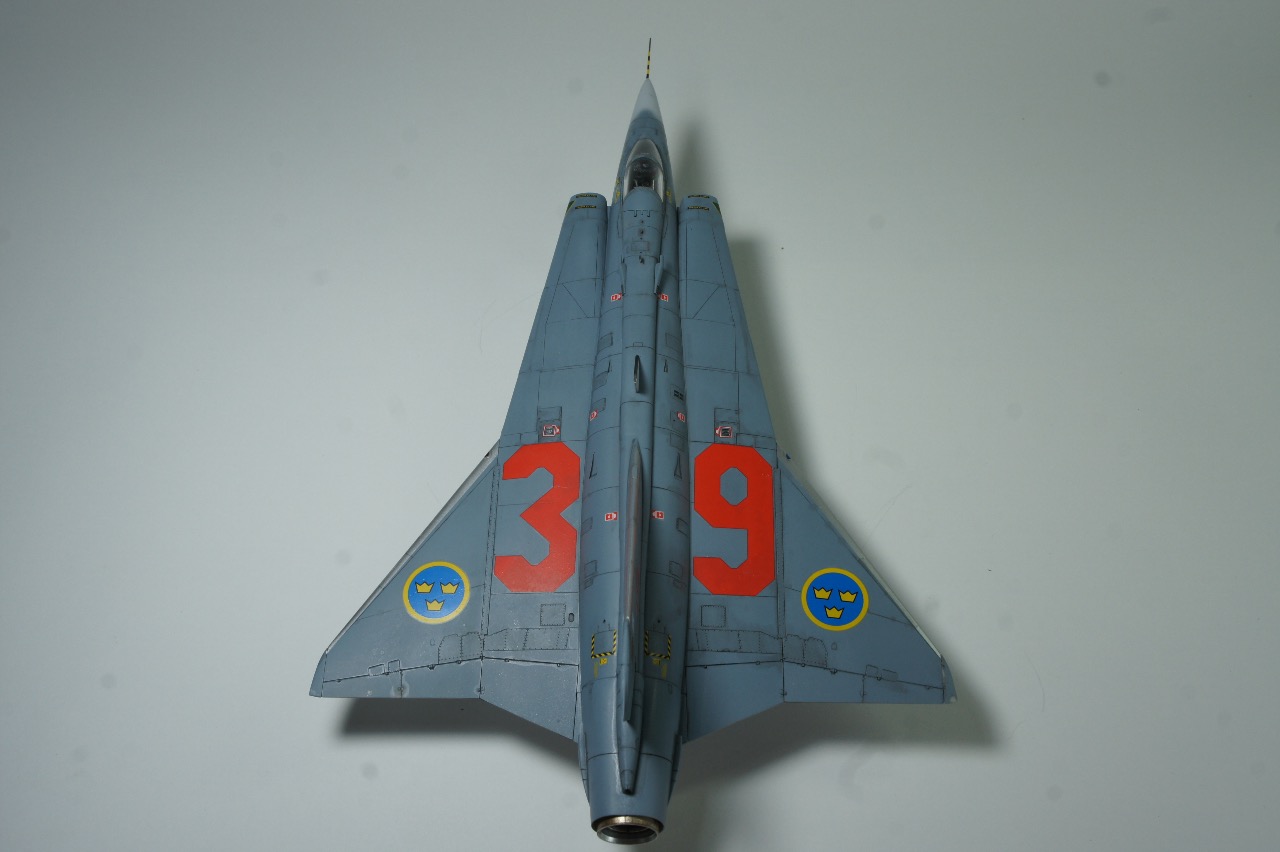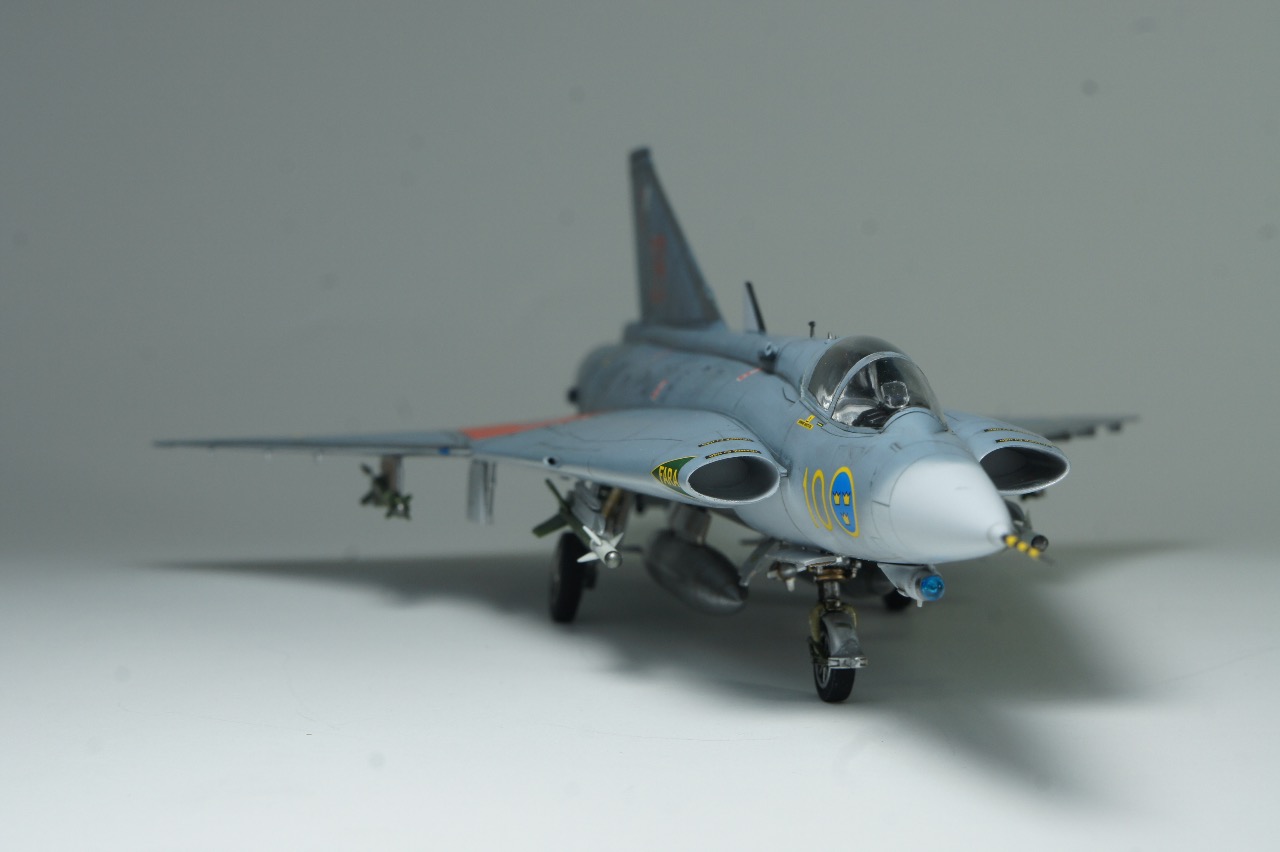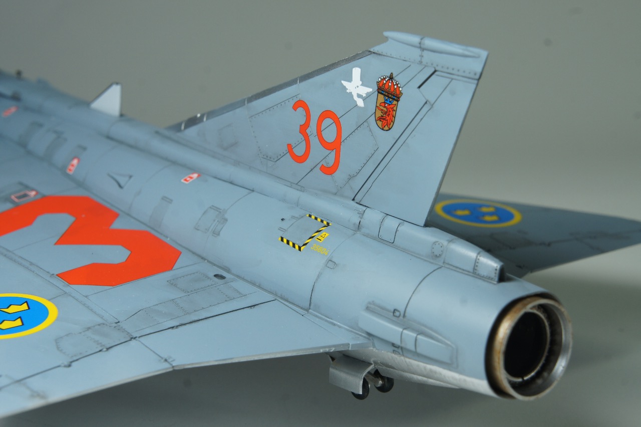전방에 AIM-9B 사이드와인더, 후방에 AIM-4D 팰콘 공대공 미사일을 두발씩 장착하고 있습니다. 스웨덴 공군은 실탄이 아닌 연훈련용 더미탄을 녹색으로 칠하고 있는듯 합니다. 저는 웬지 실탄보다 더미탄이 더 눈이 갑니다.