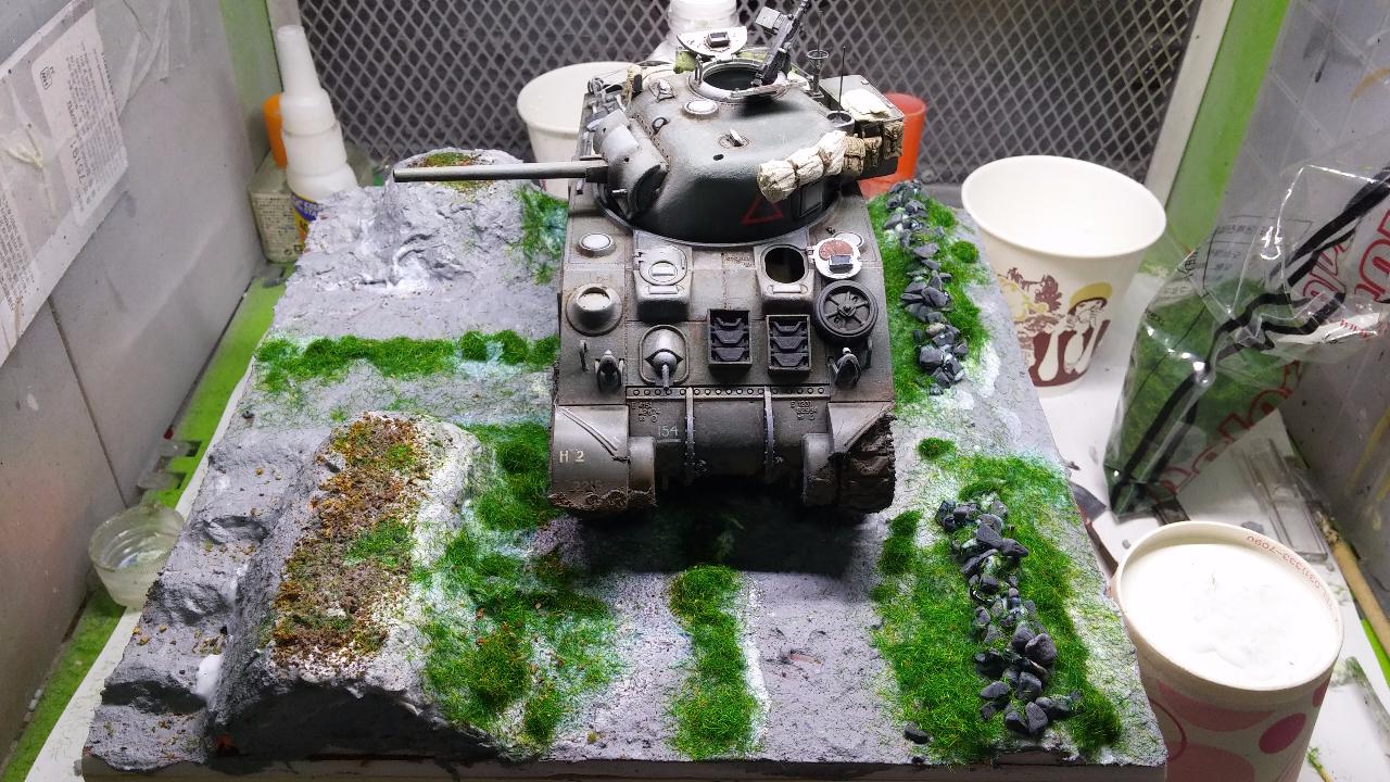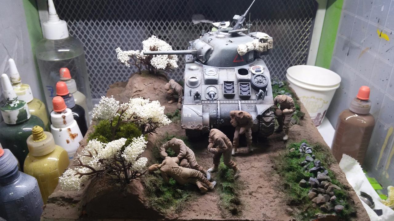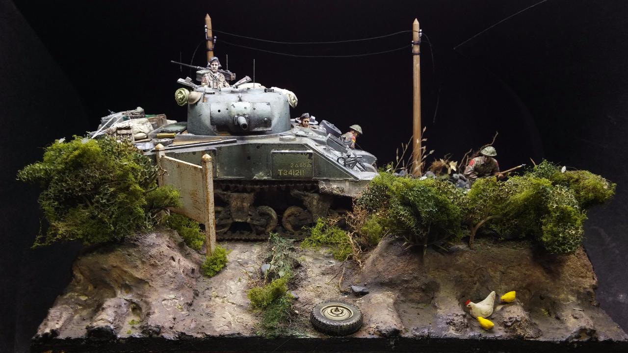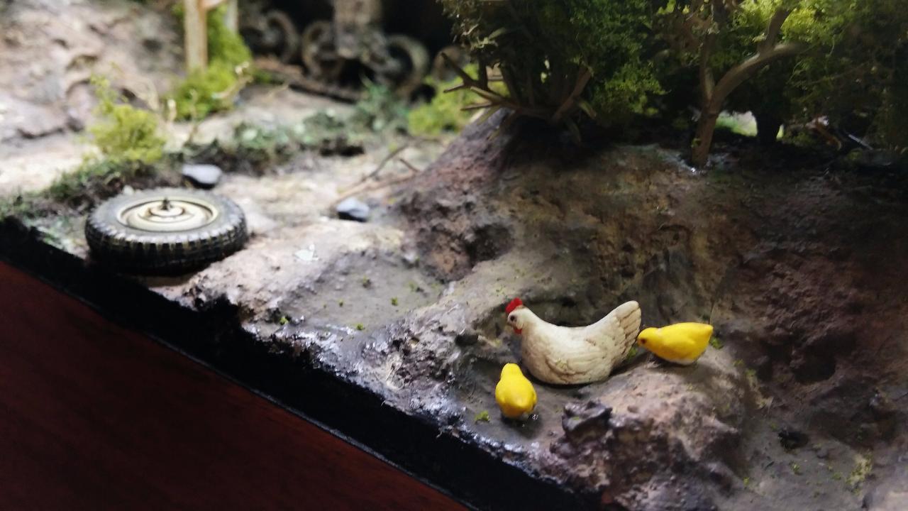 닭은 타미야 세트에 있는것을 사용하였습니다.실제 상황이라면 브렌건 거치 하는 소리나 셔먼 엔진 소리에 놀라 도망갔을거같습니다만. 그거까지 표현 하기엔 제 실력이 많이 부족합니다.