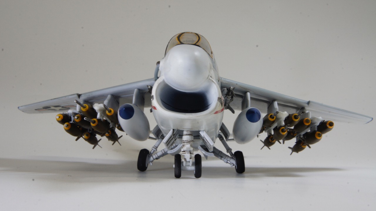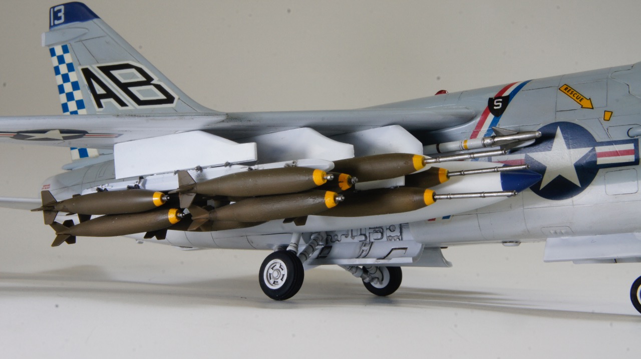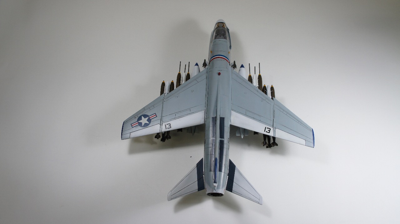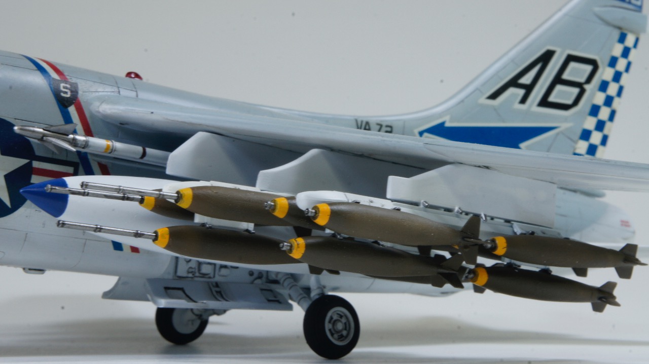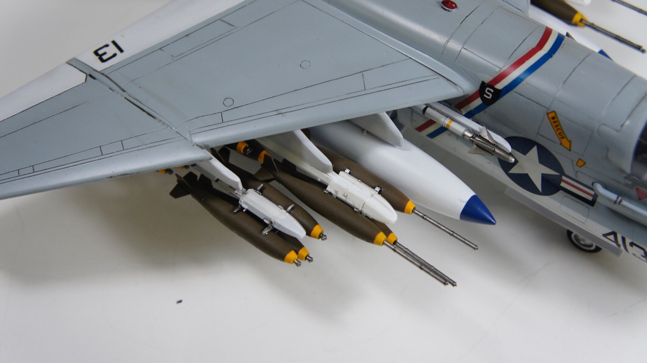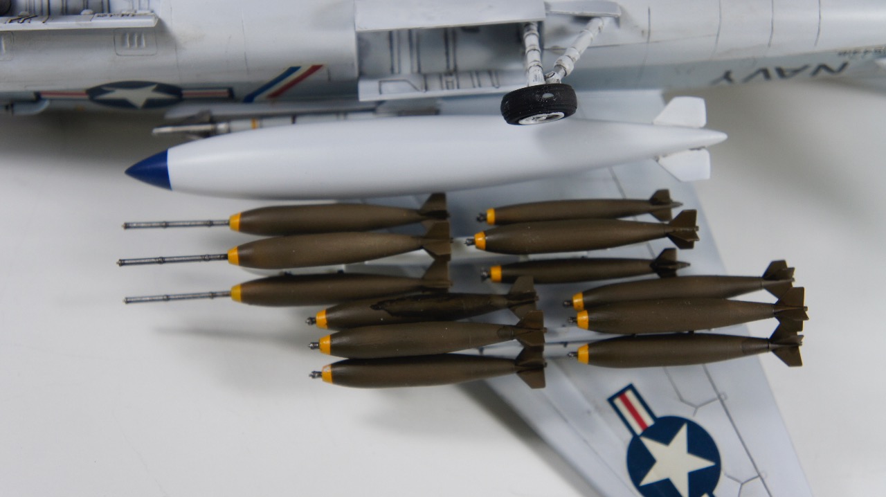 박스아트에 나온대로 설명서를 기준삼아 기본제작했습니다. 하지만 키트의 무장은 별볼일 없는데요. 사이드와인더는 걍 막대기 수준이고 폭탄들도 멘붕입니다. 맨 바깥쪽 파일런에 TER(폭탄 4발 장착 랙크)이 몰드되어있는데 아카데미 팬톰의 MER(폭탄 6발 장착 랙크)로 변경한후 항공용 통상폭탄을 달아주었습니다. 실제 무장장착도를 보면 날개 맨안쪽 파일런 두개에 2,500파운드, 바깥쪽 네개의 파일런에 3,500파운드씩의 무장이 가능합니다. 따라서 300갤론 드롭탱크를 안쪽에, 바깥쪽은 총 3,000파운드씩의 폭탄을 장착해서 총 12,000파운드(약 6톤)의 폭격무장을 했습니다. 사이드와인더도 팬톰에서 차용했습니다. 형식은 AIM-9H(나중에 L,M,X 등으로 발전)입니다.