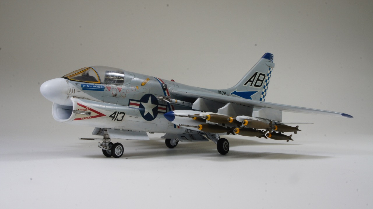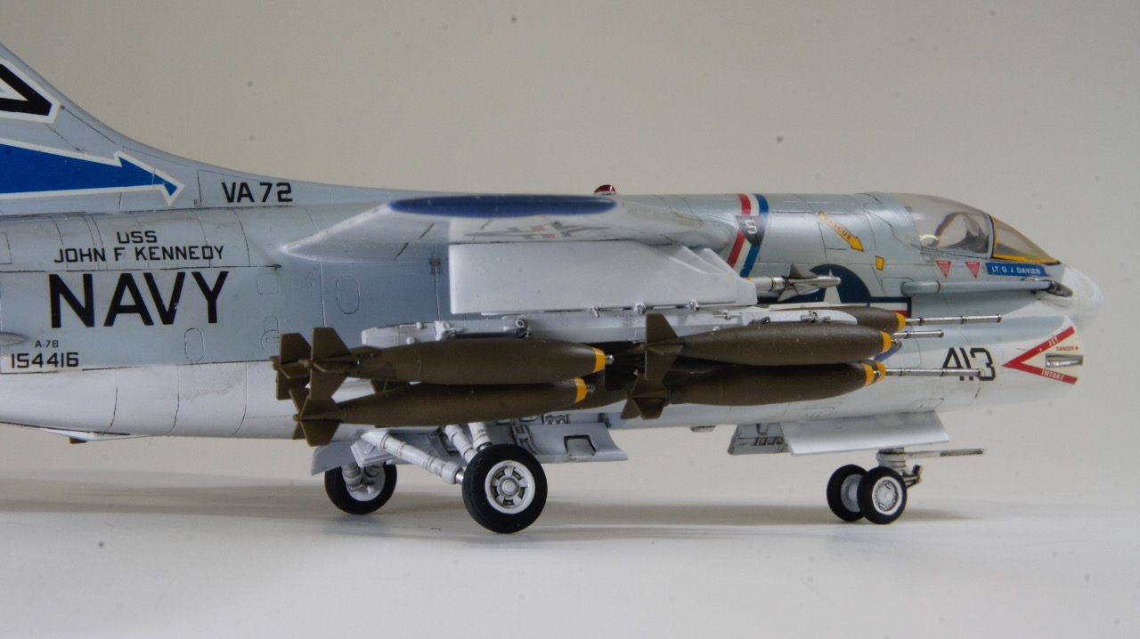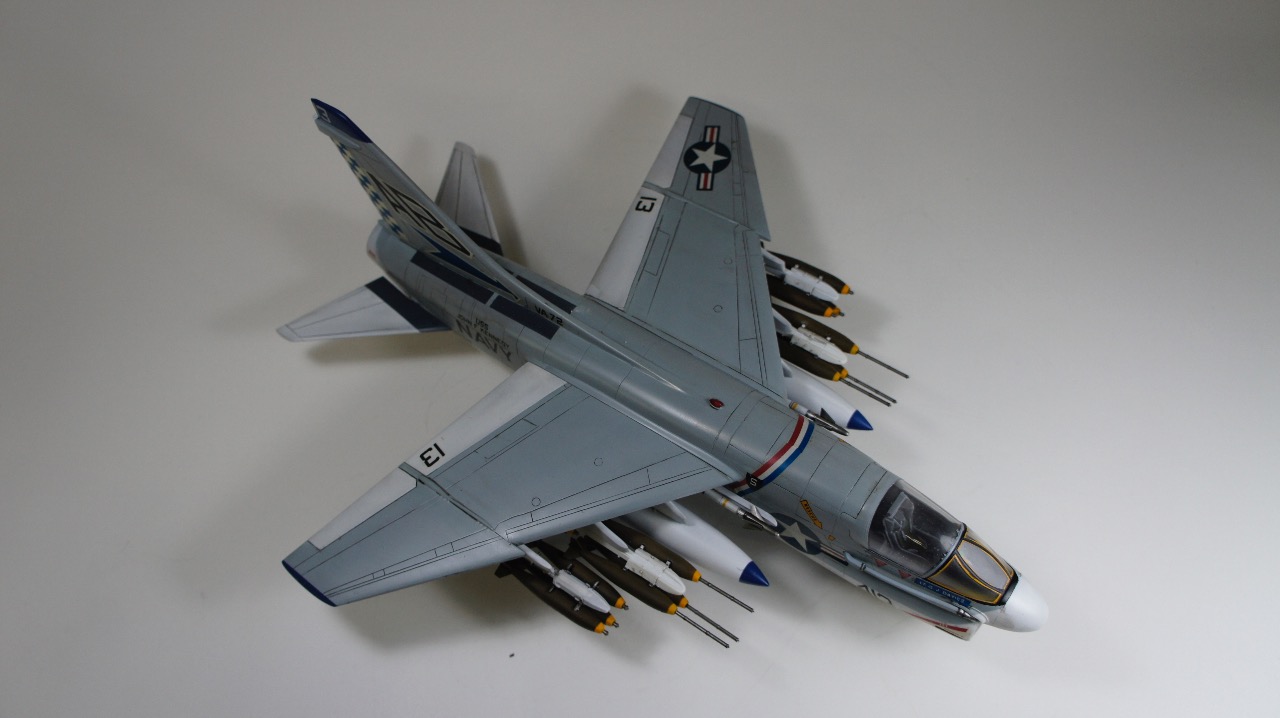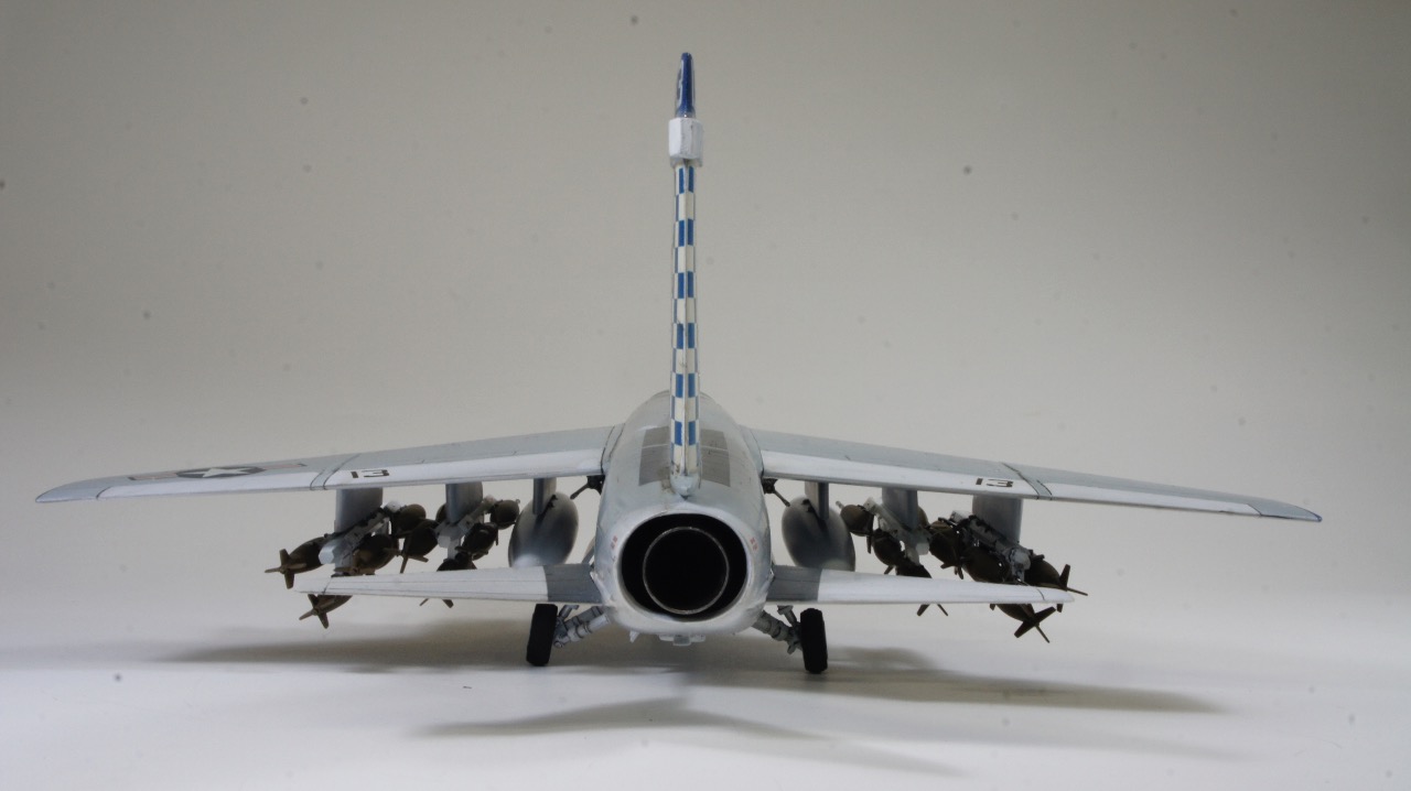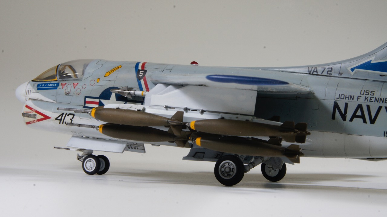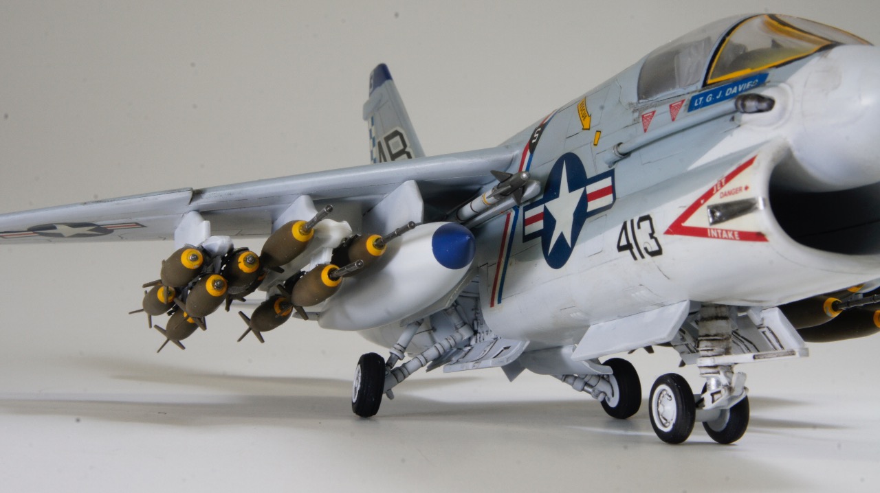 박스아트에 나온대로 설명서를 기준삼아 기본제작했습니다. 하지만 키트의 무장은 별볼일 없는데요. 사이드와인더는 걍 막대기 수준이고 폭탄들도 멘붕입니다. 맨 바깥쪽 파일런에 TER(폭탄 4발 장착 랙크)이 몰드되어있는데 아카데미 팬톰의 MER(폭탄 6발 장착 랙크)로 변경한후 항공용 통상폭탄을 달아주었습니다. 실제 무장장착도를 보면 날개 맨안쪽 파일런 두개에 2,500파운드, 바깥쪽 네개의 파일런에 3,500파운드씩의 무장이 가능합니다. 따라서 300갤론 드롭탱크를 안쪽에, 바깥쪽은 총 3,000파운드씩의 폭탄을 장착해서 총 12,000파운드(약 6톤)의 폭격무장을 했습니다. 사이드와인더도 팬톰에서 차용했습니다. 형식은 AIM-9H(나중에 L,M,X 등으로 발전)입니다.