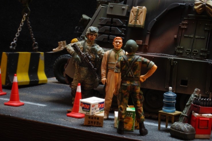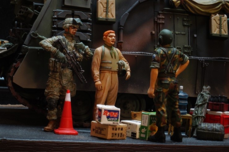 올3월초에 완성된 작은 디오라마이고요..한국군과 미군이 훈련을 나와 부식을 교환하는 장면을 연출해 본 디오라마입니다..군시절 경험을 떠올리며 작업을 했고요...부족한 습작 즐감하세요....^^