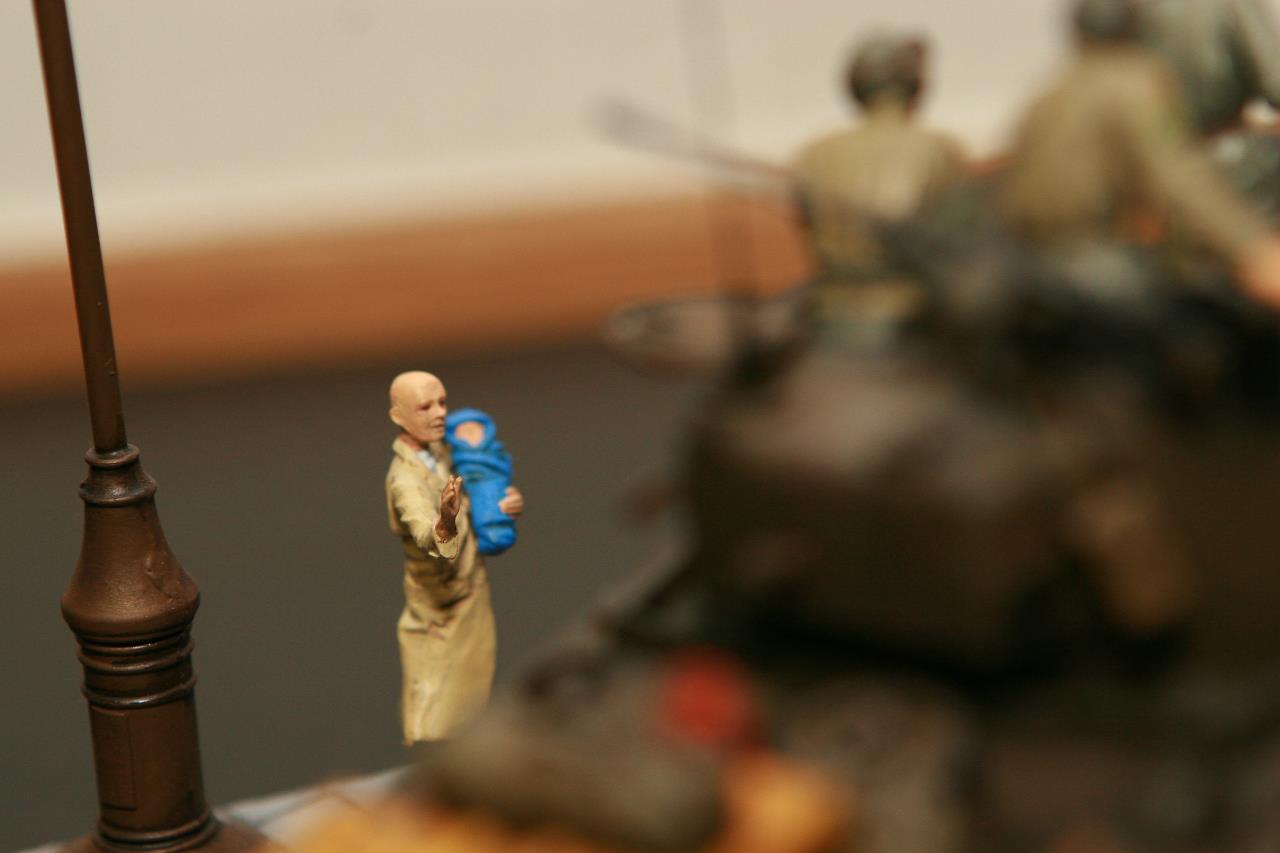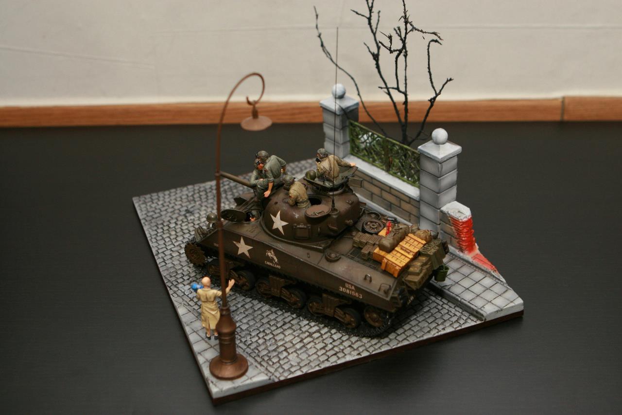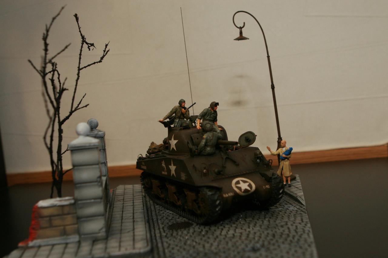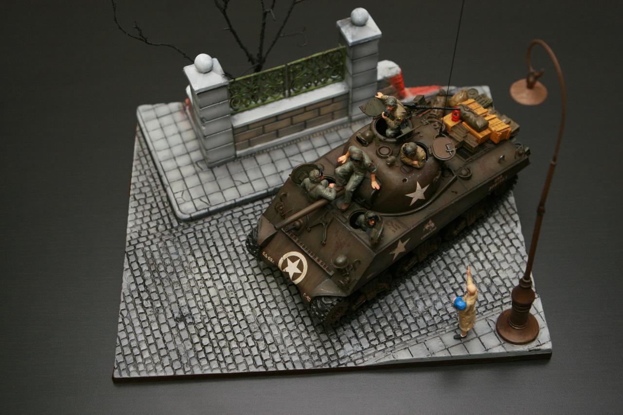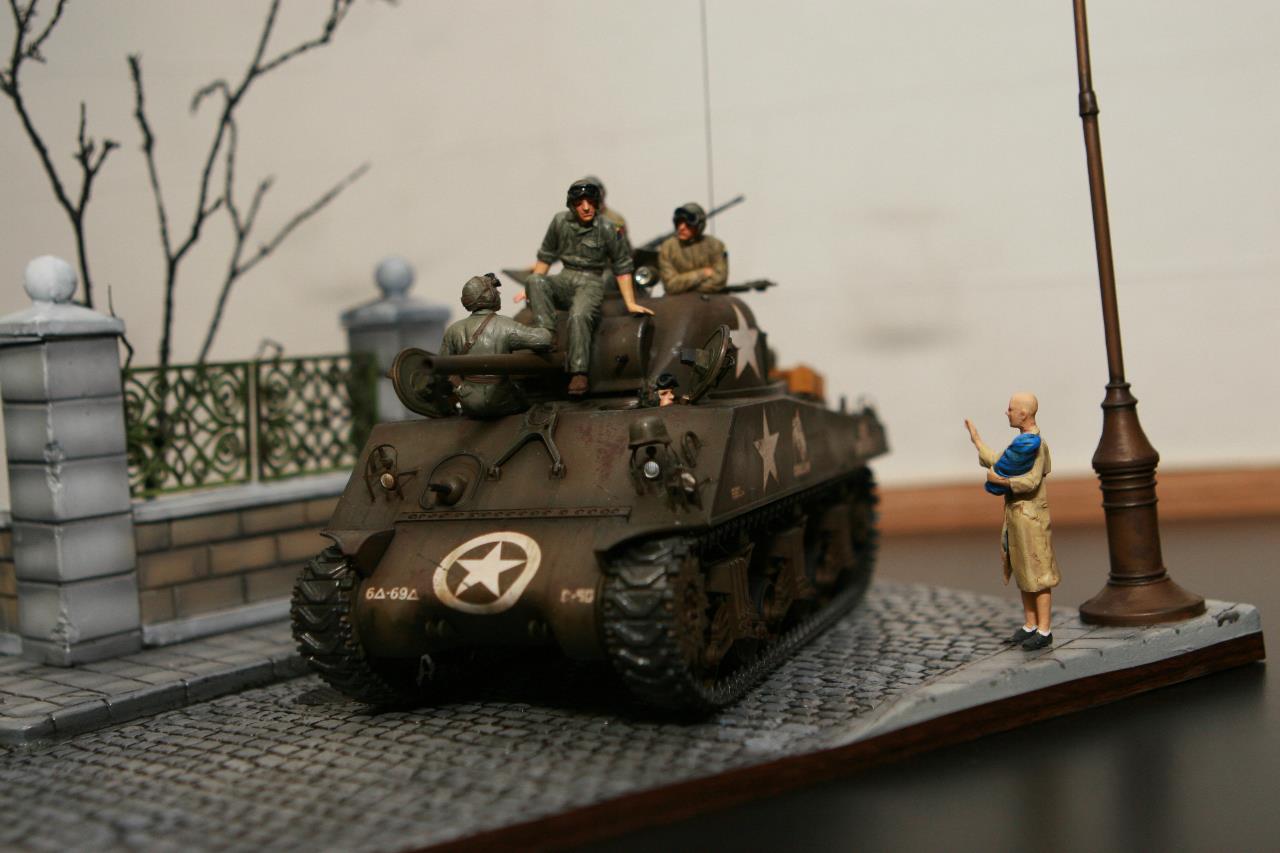 작년 퓨리 개봉이후 잠시 품귀 현상이 있었던 셔먼 이지에잇을 구입하지 못하여 그나마 남아 있던 M4A3로 만든 비넷입니다. 베이스와 전차병은 미니아트 제품을 사용 했고, 옆에 아이를 들고 있는 머리 깍인 여인네는 아마 MB 제품에서 가져 왔습니다. 탄 나무를 만들려고 이생각 저생각 하다 결국 장기 슬럼프에 빠져 이번에 대충 완성 했습니다. 봐주셔서 감사합니다.