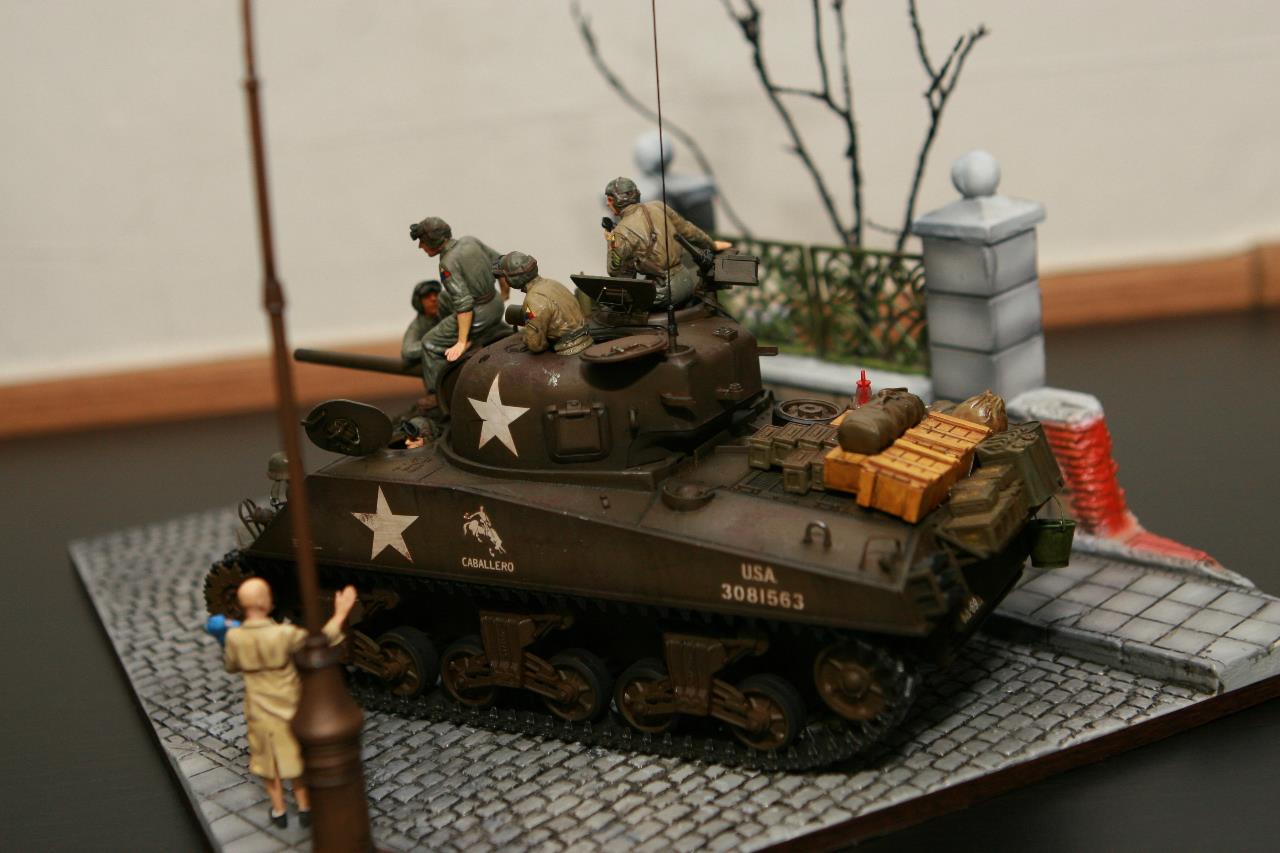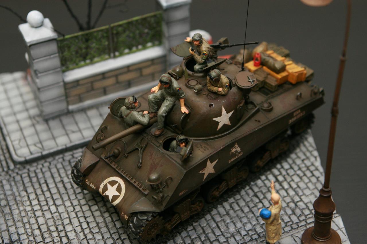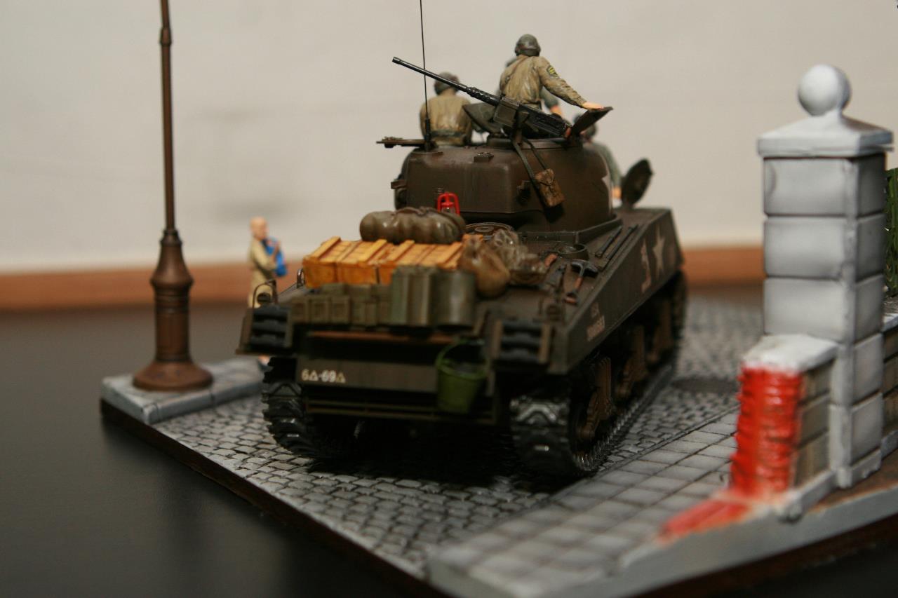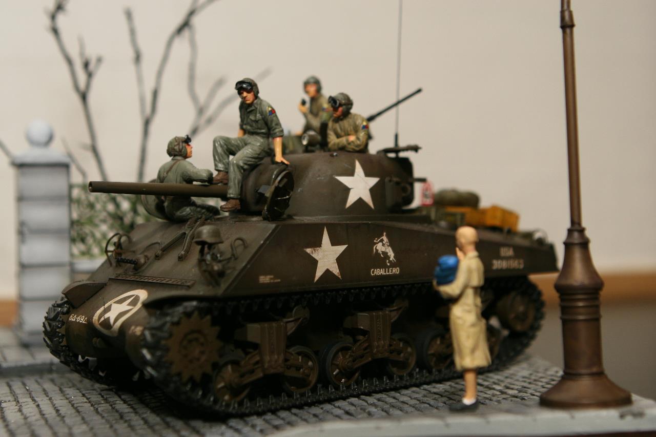 작년 퓨리 개봉이후 잠시 품귀 현상이 있었던 셔먼 이지에잇을 구입하지 못하여 그나마 남아 있던 M4A3로 만든 비넷입니다. 베이스와 전차병은 미니아트 제품을 사용 했고, 옆에 아이를 들고 있는 머리 깍인 여인네는 아마 MB 제품에서 가져 왔습니다. 탄 나무를 만들려고 이생각 저생각 하다 결국 장기 슬럼프에 빠져 이번에 대충 완성 했습니다. 봐주셔서 감사합니다.