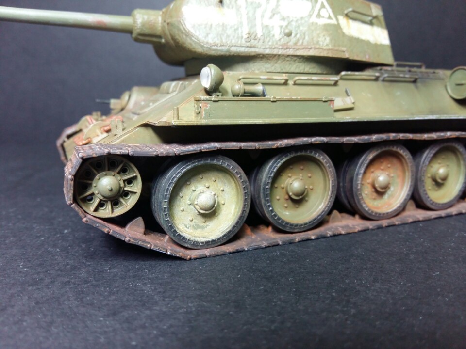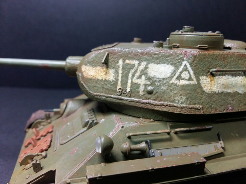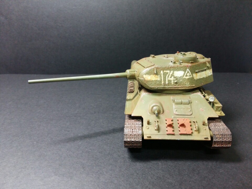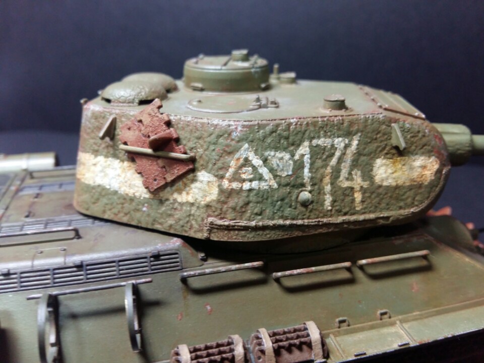개인적으로 제일 예쁘다고 생각하는 각도입니다. 포신이 정면보단 측면을 향한 모습이 더 예쁜 것 같습니다. 데칼에는 제가 재현한 차량의 것이 없기도 하거니와, 소련 전차는 깔끔한 데칼보다는 직접 그려주는 느낌이 더 잘 어울리는 것 같아서 흰색 아크릴 도료로 도색했습니다.